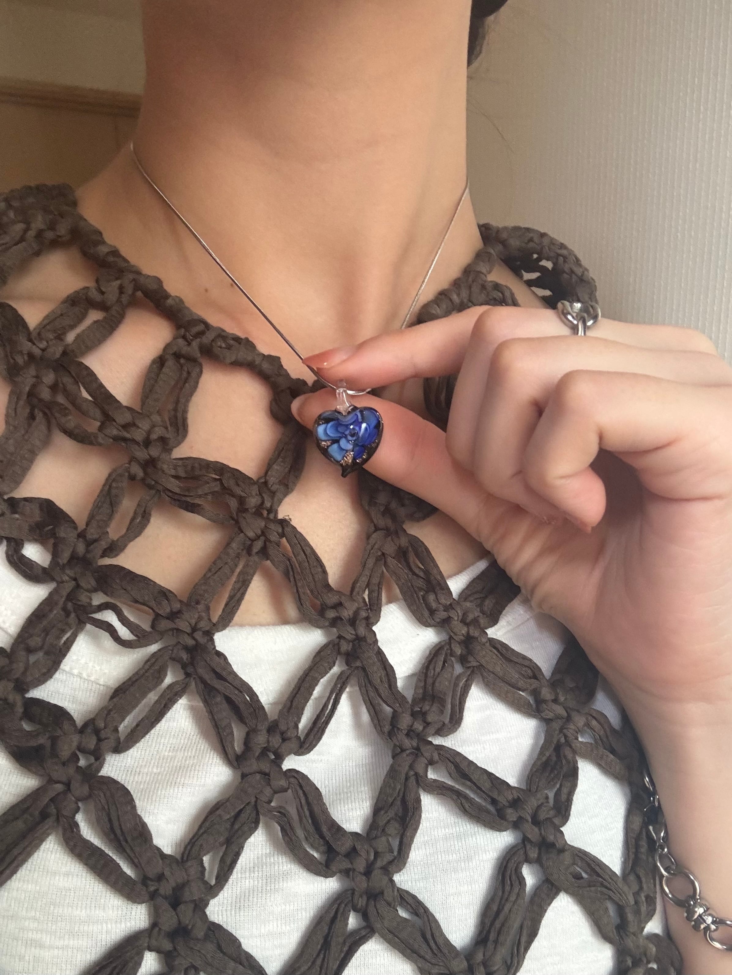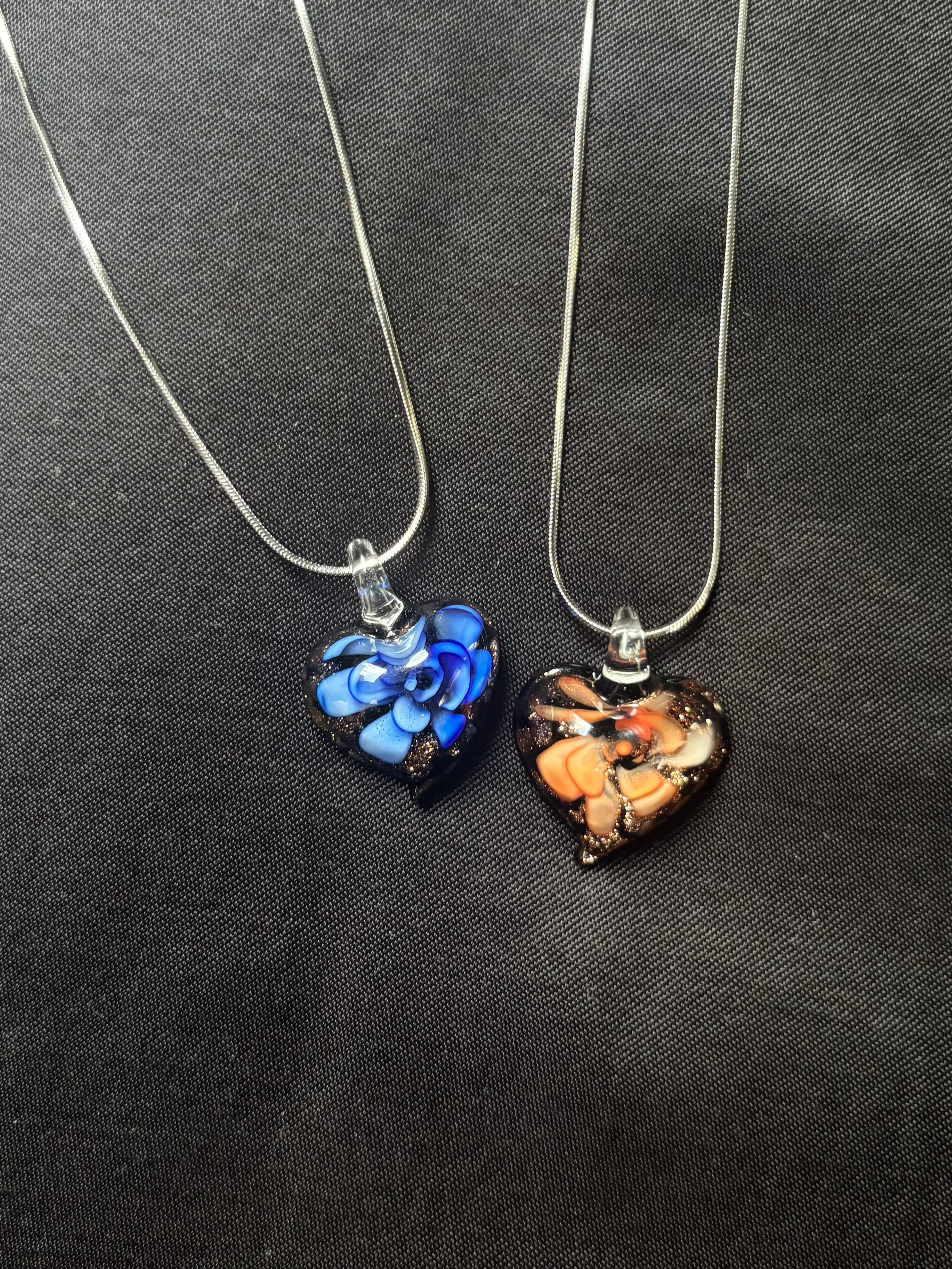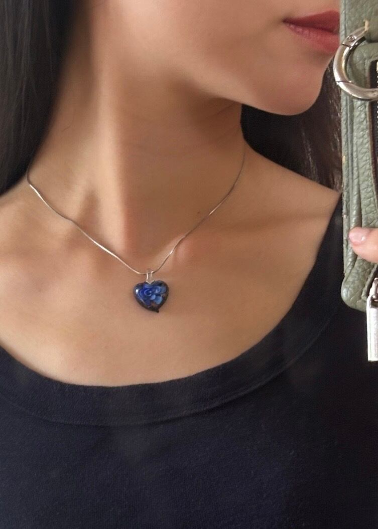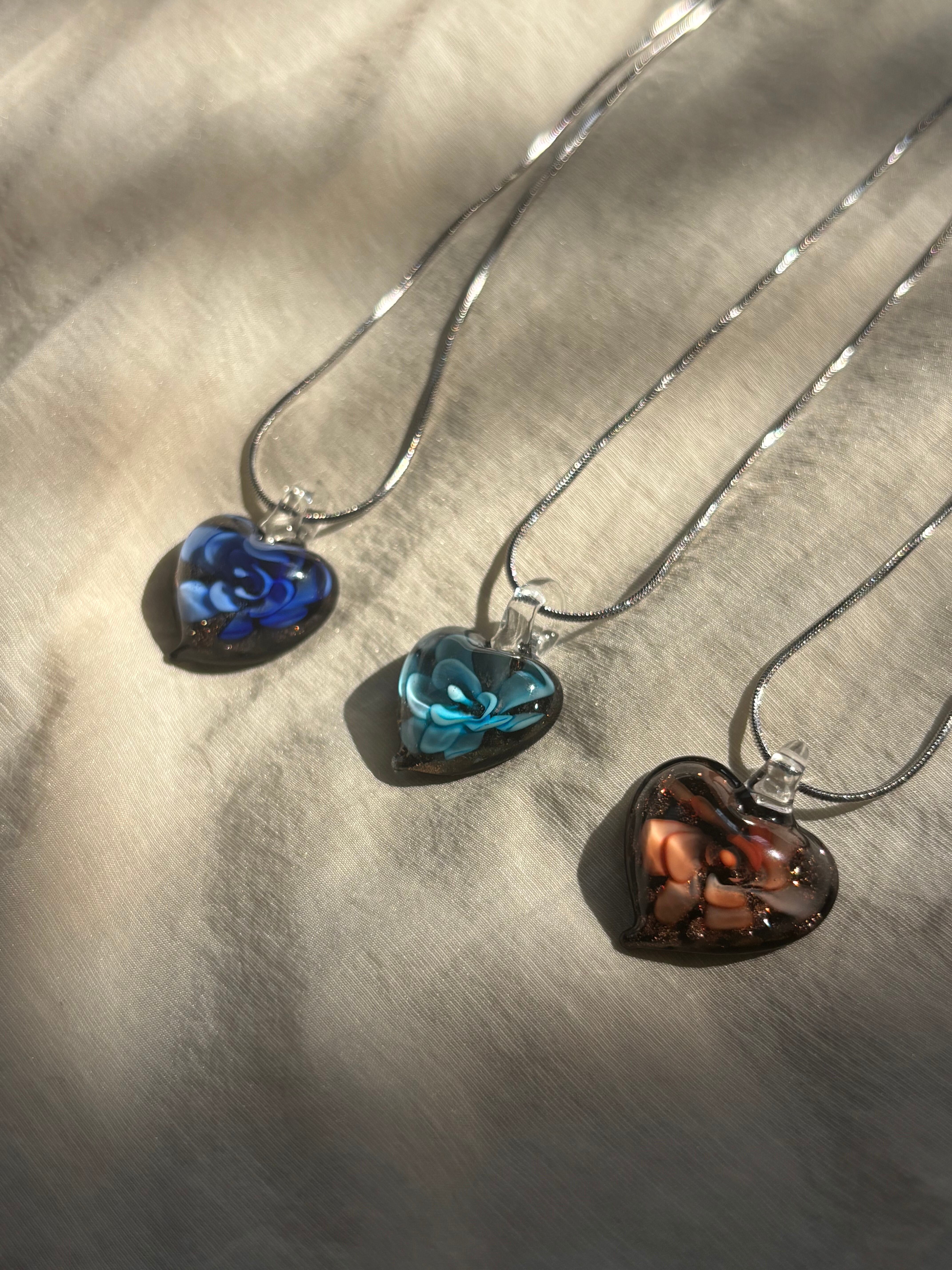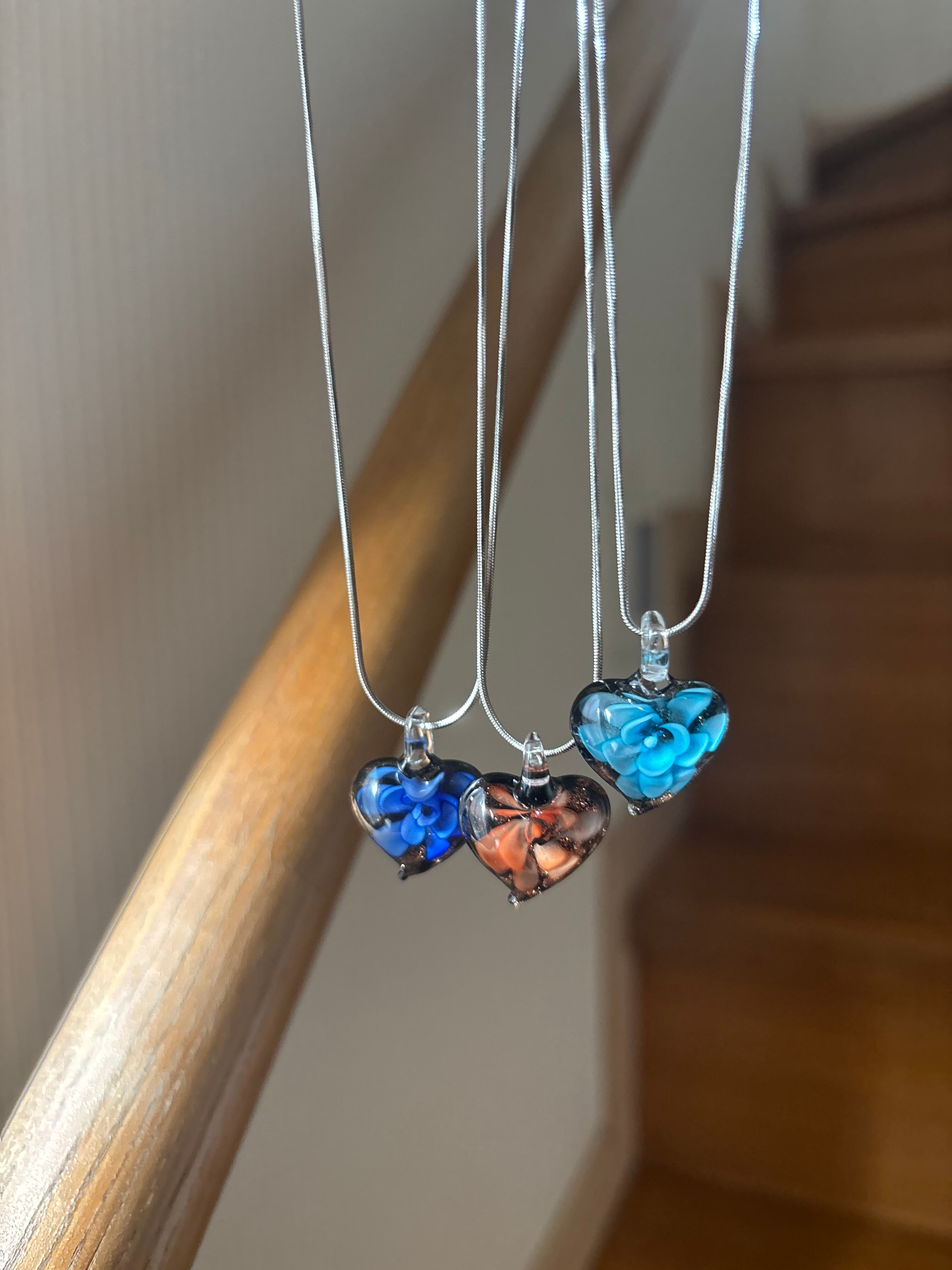 透明度のあるランプワークチャームを使ったガラスネックレス。