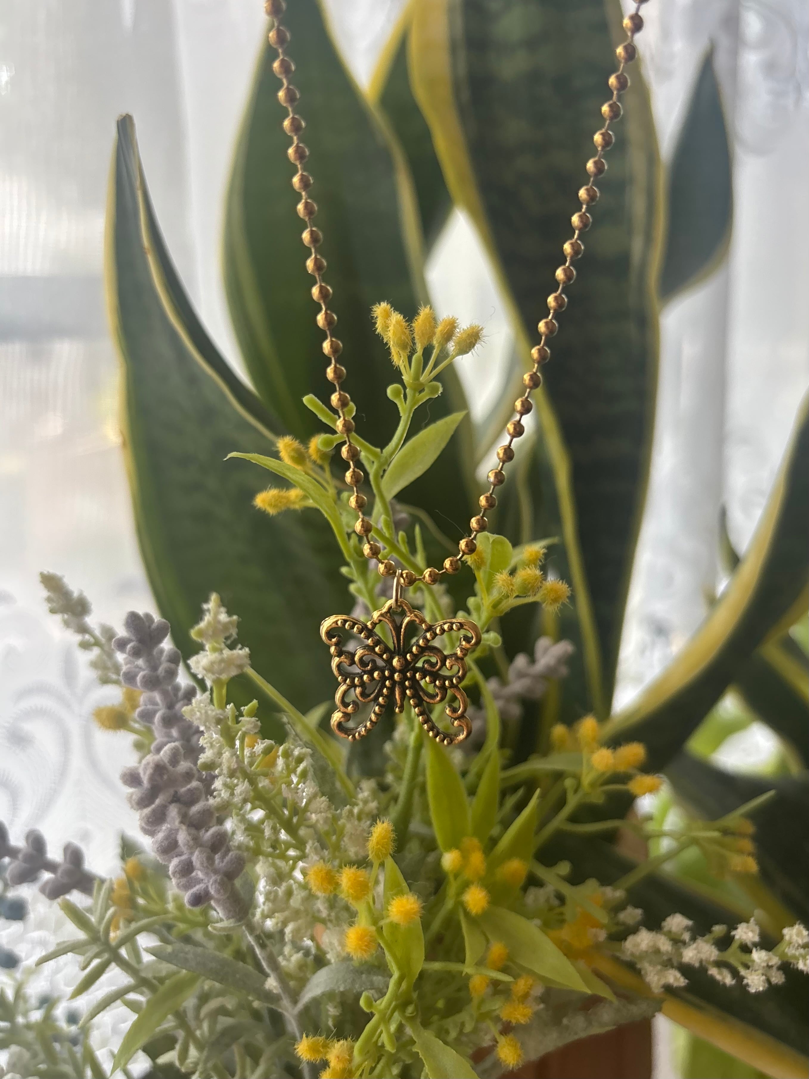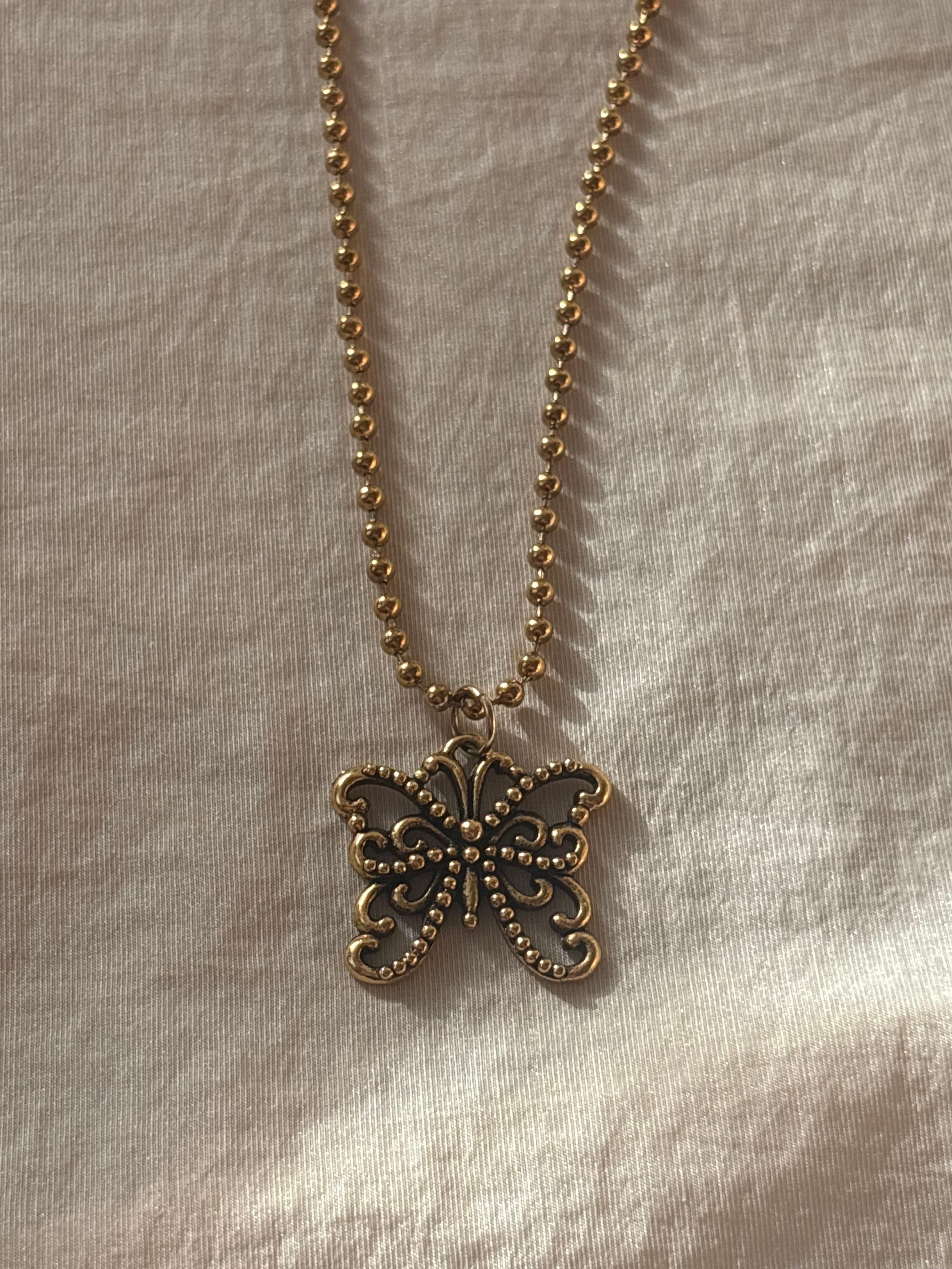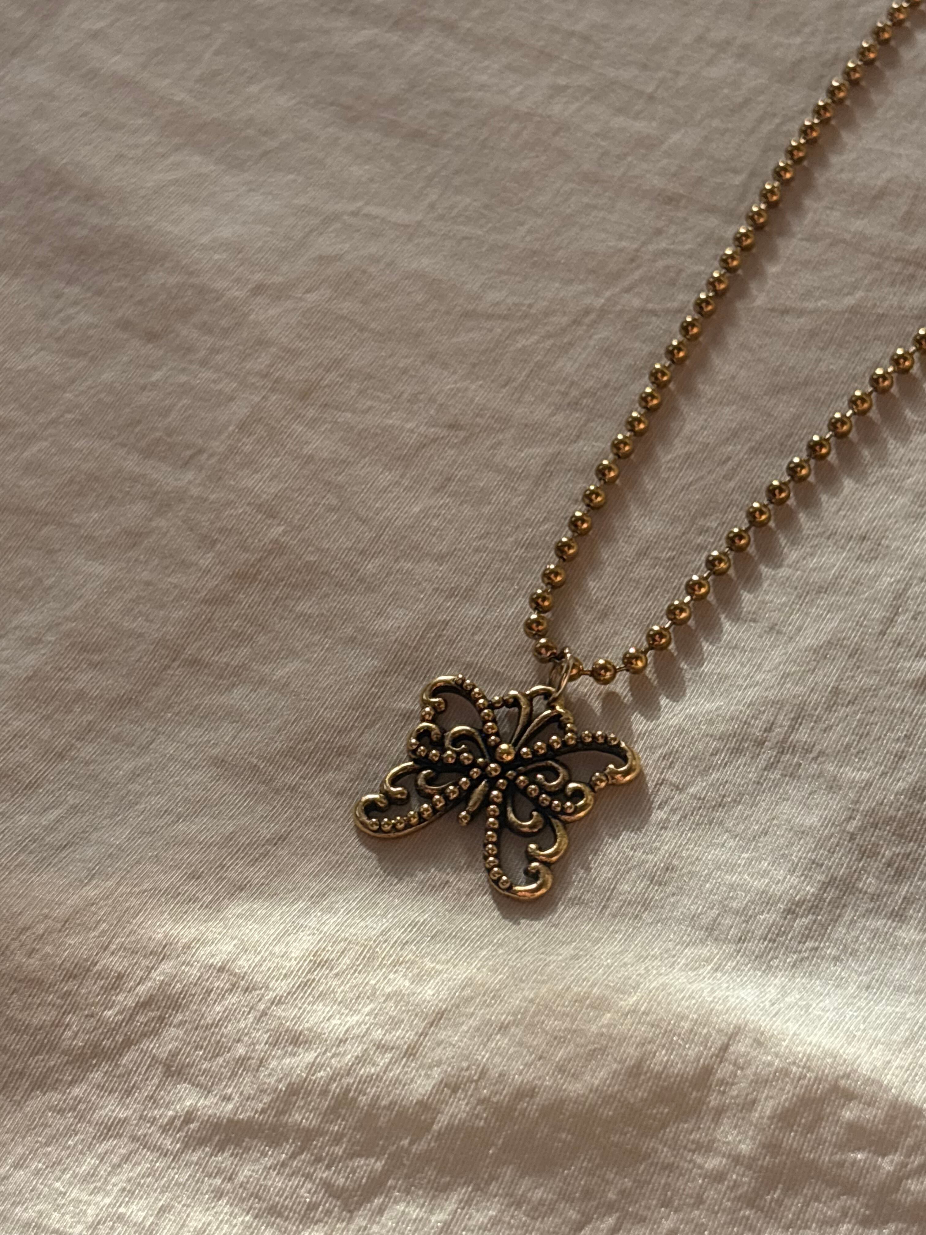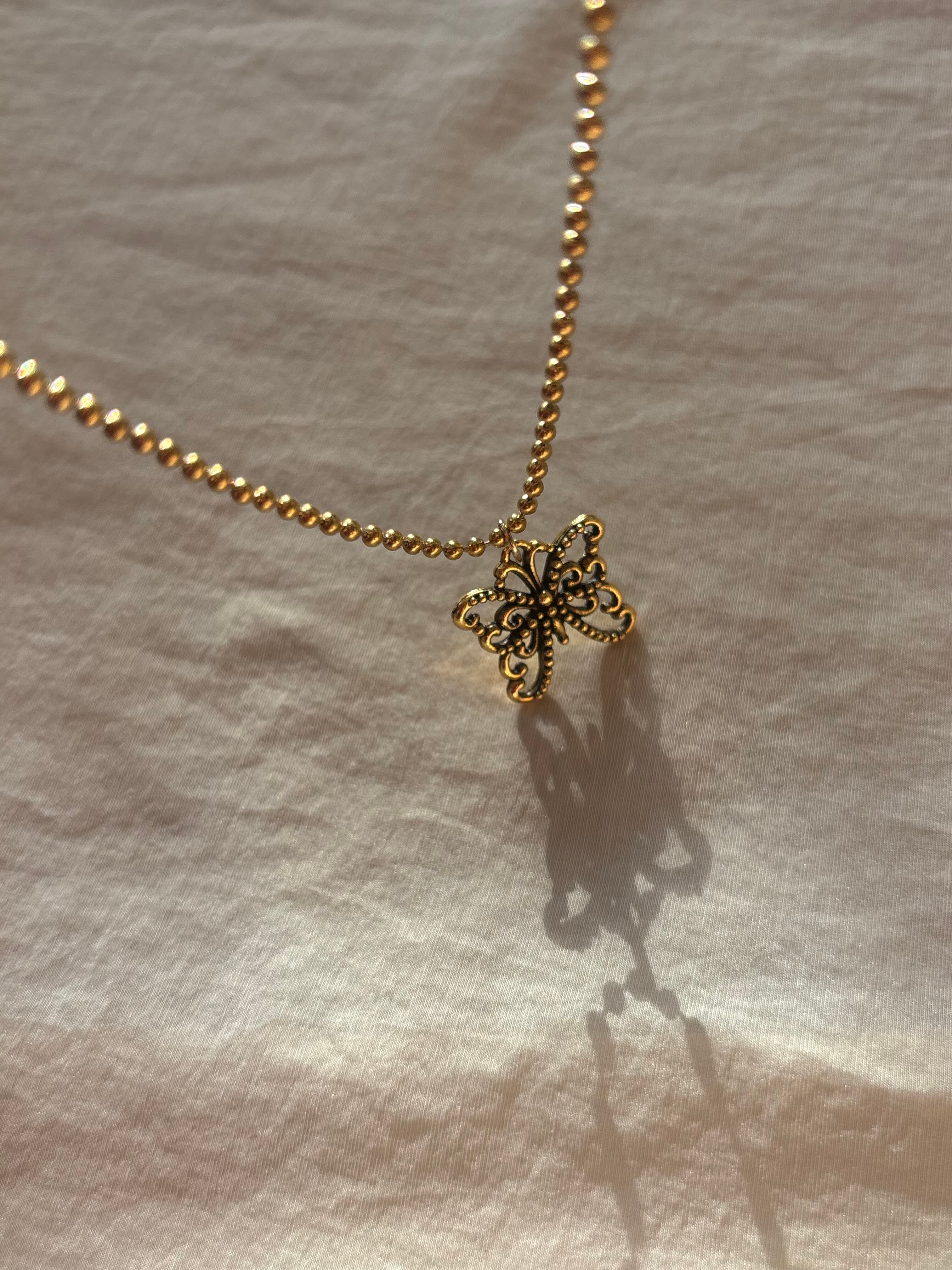 トレンドの蝶モチーフで、フェミニン・ガーリー好きにジャスト。ゴールドボールチェーンが程よく華やかで、1本で主役になる存在感