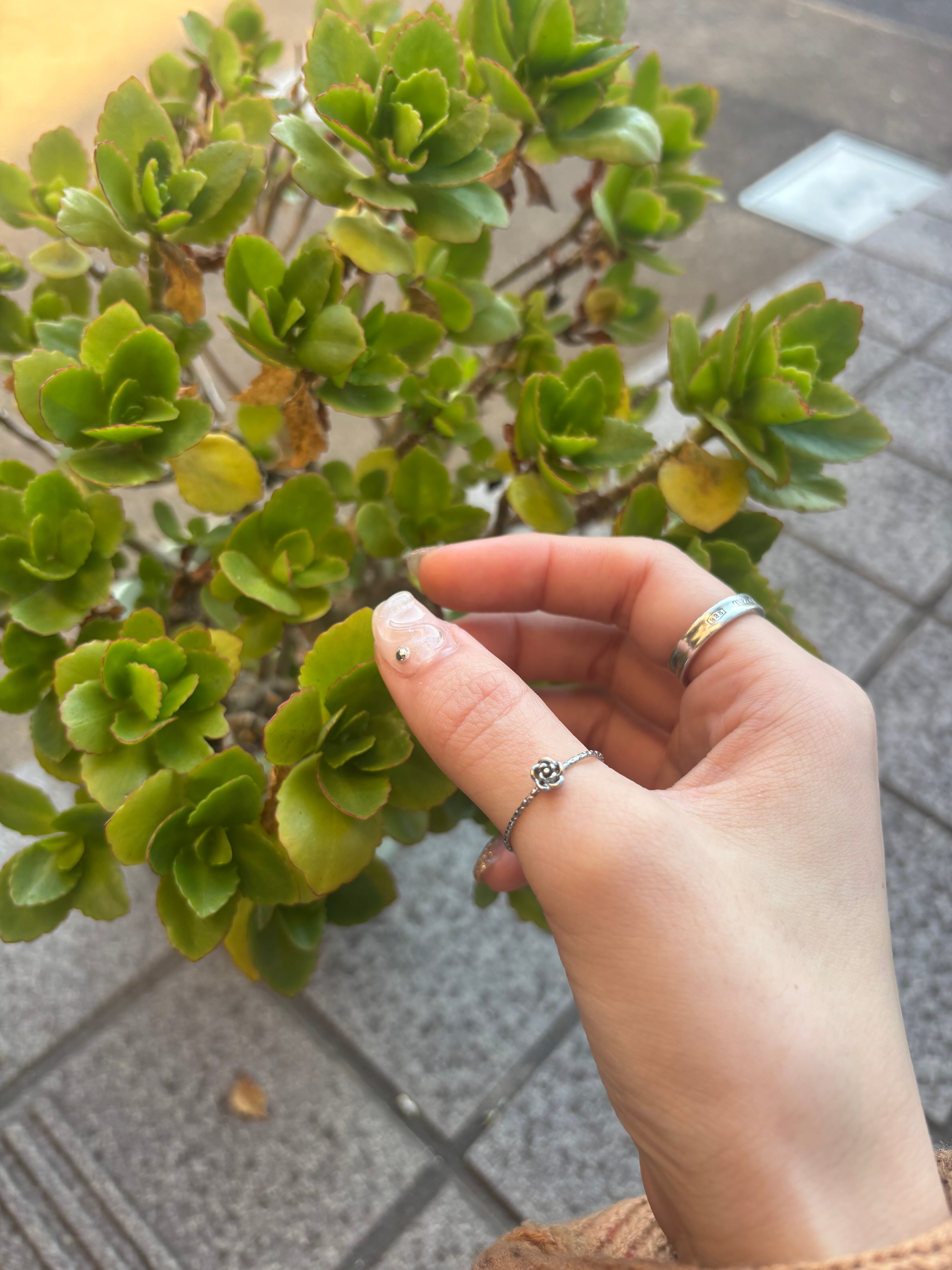 中心にちょこんと乗った立体ローズが、シンプルなのにしっかり存在感を放つリング。