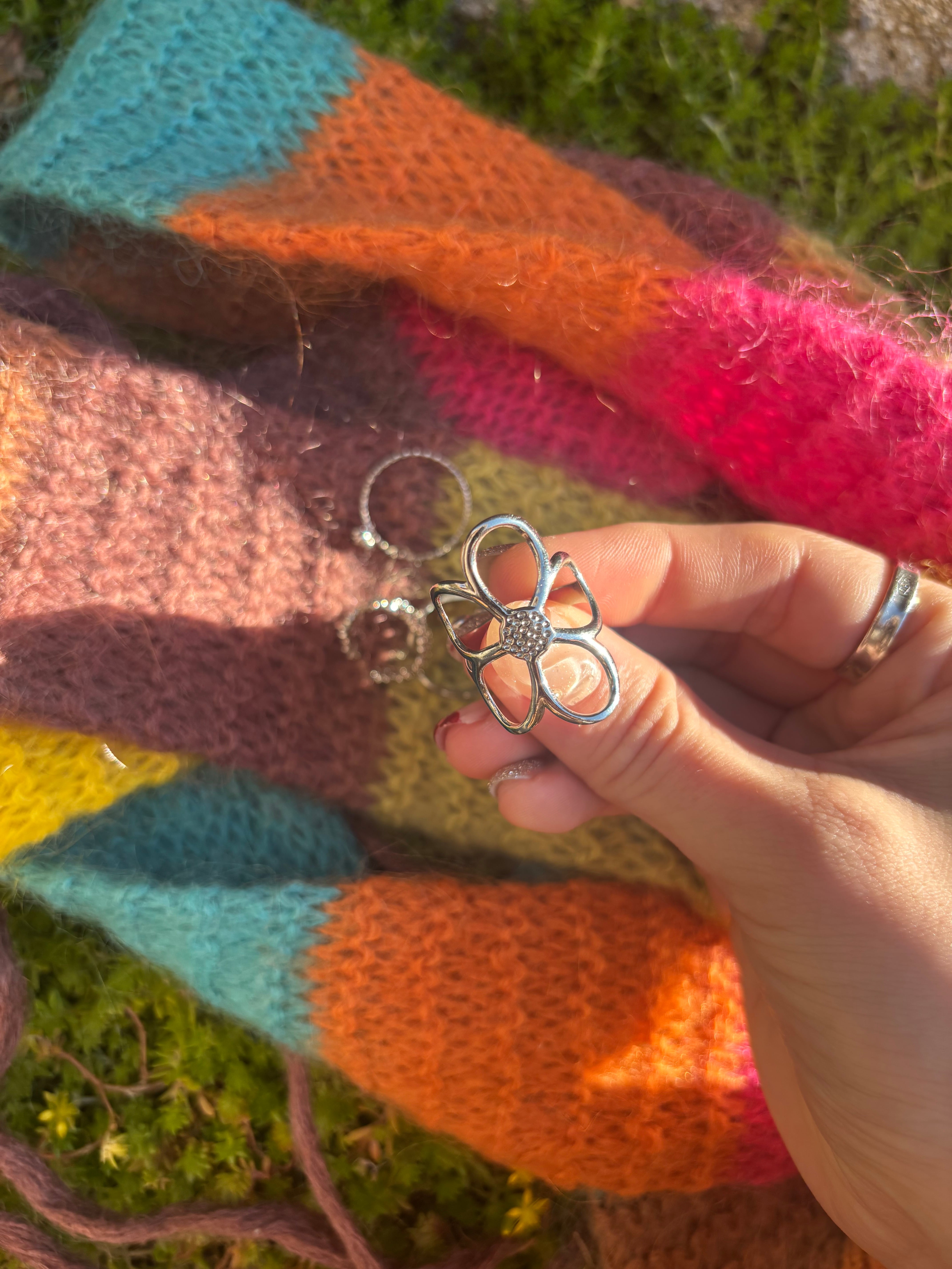 オープンリングで力を加えるとサイズ調整ができます。大きめフラワーモチーフで圧倒的な存在感があります。