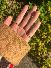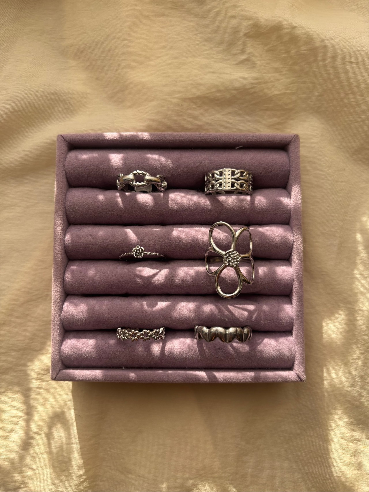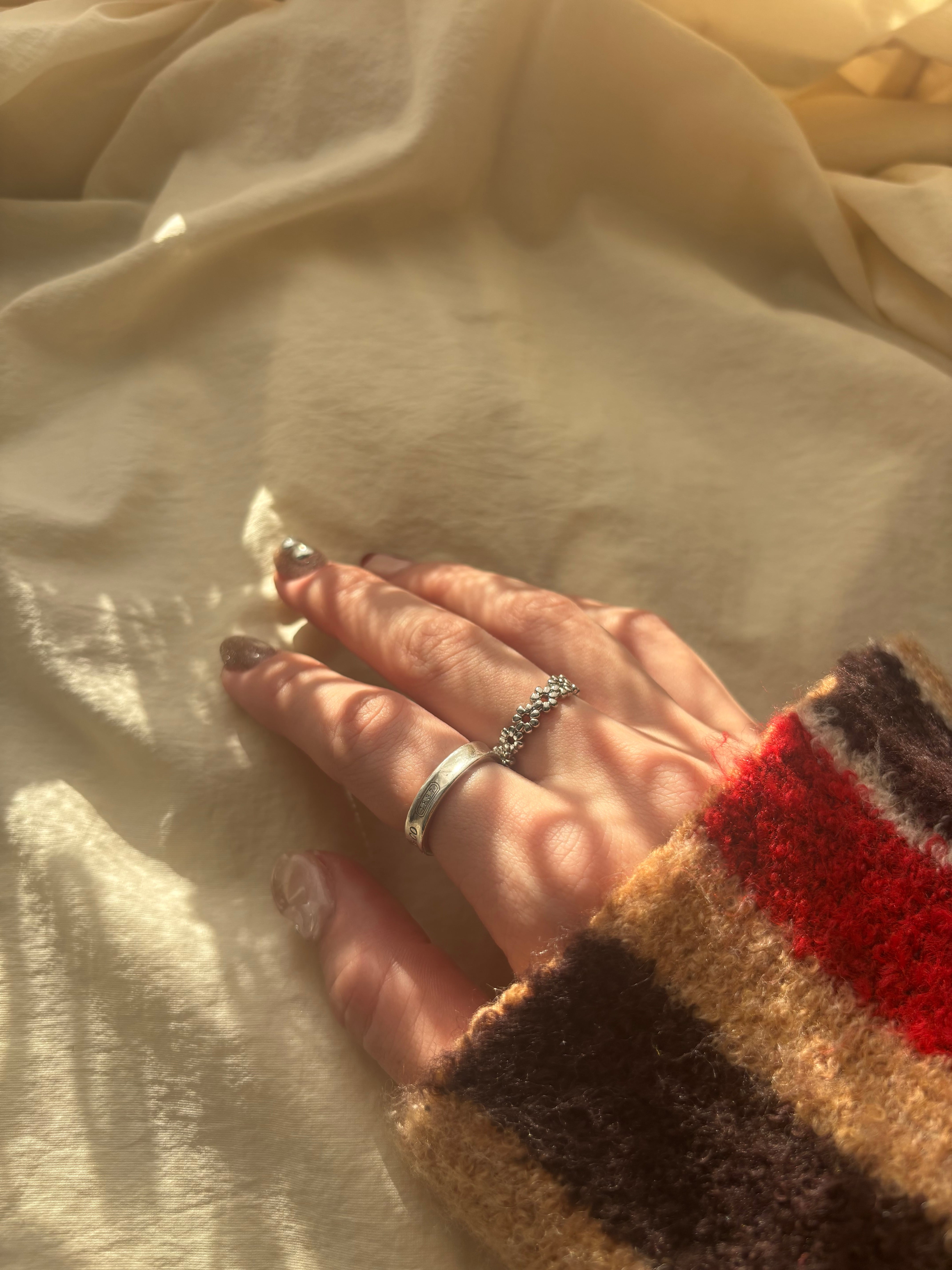 まるで花冠のように小さな花がぐるっと囲む、可憐な雰囲気のリング。どの角度からも可愛い立体感があり、光が当たるたび花びらがきらっと輝き、手元を柔らかく明るく見せてくれる。