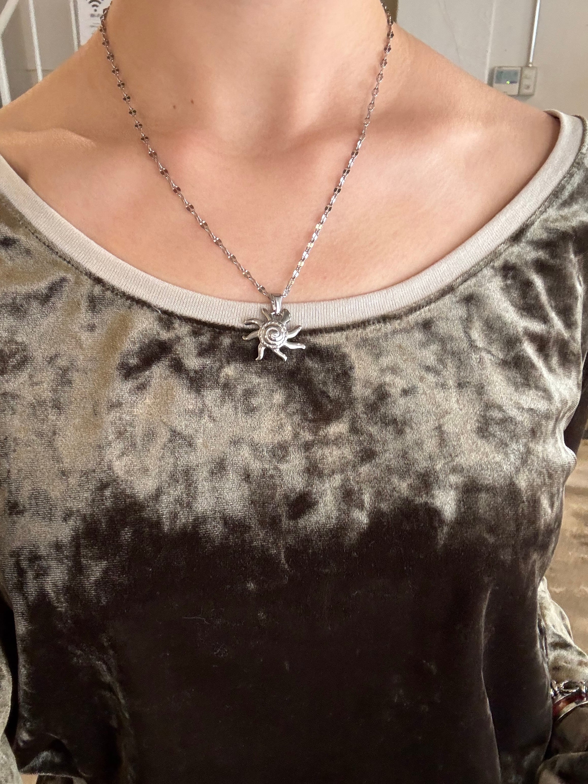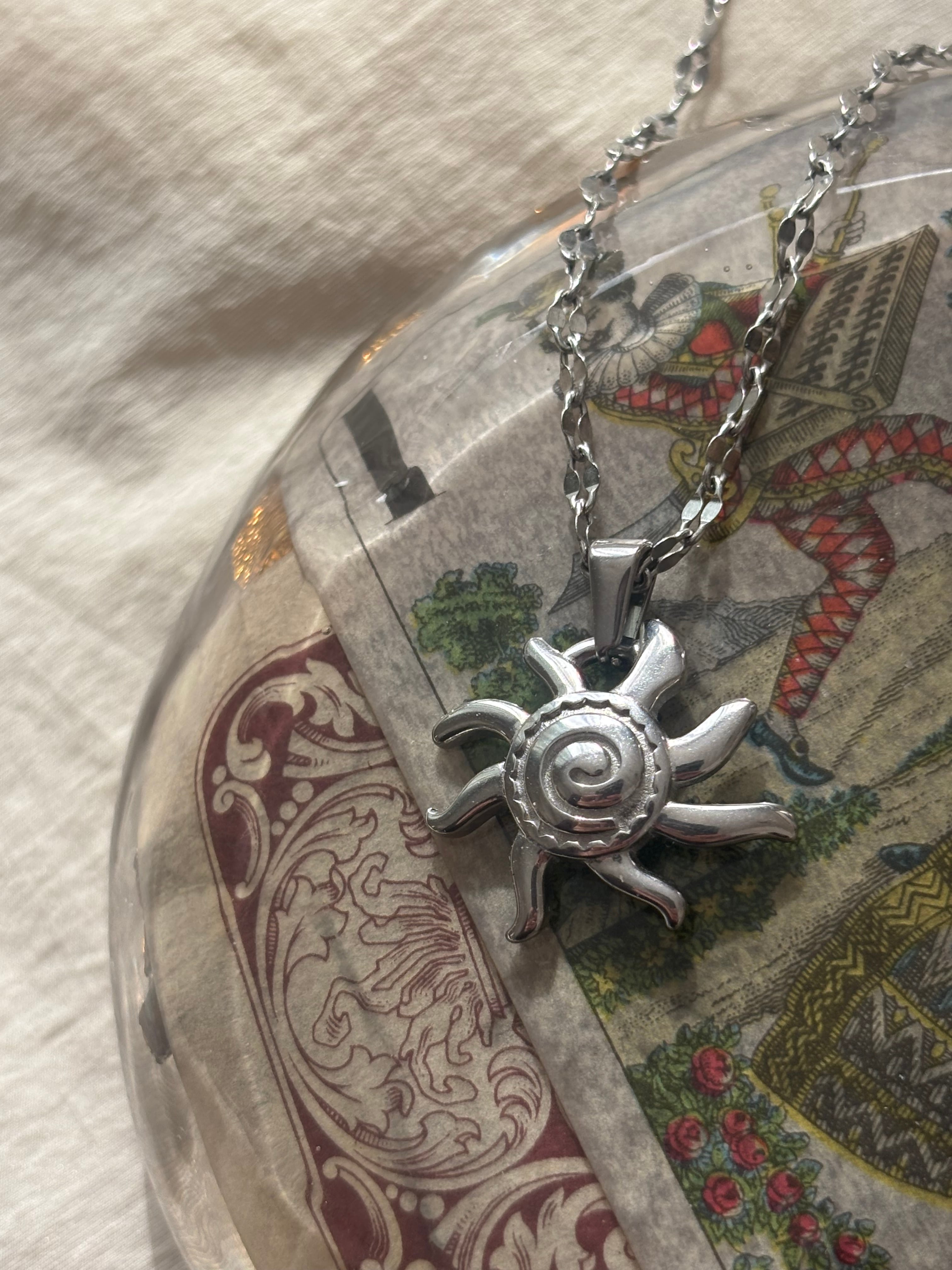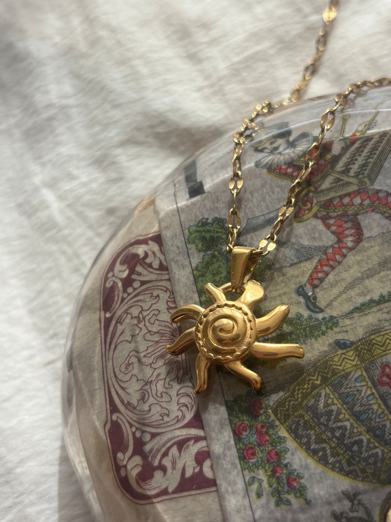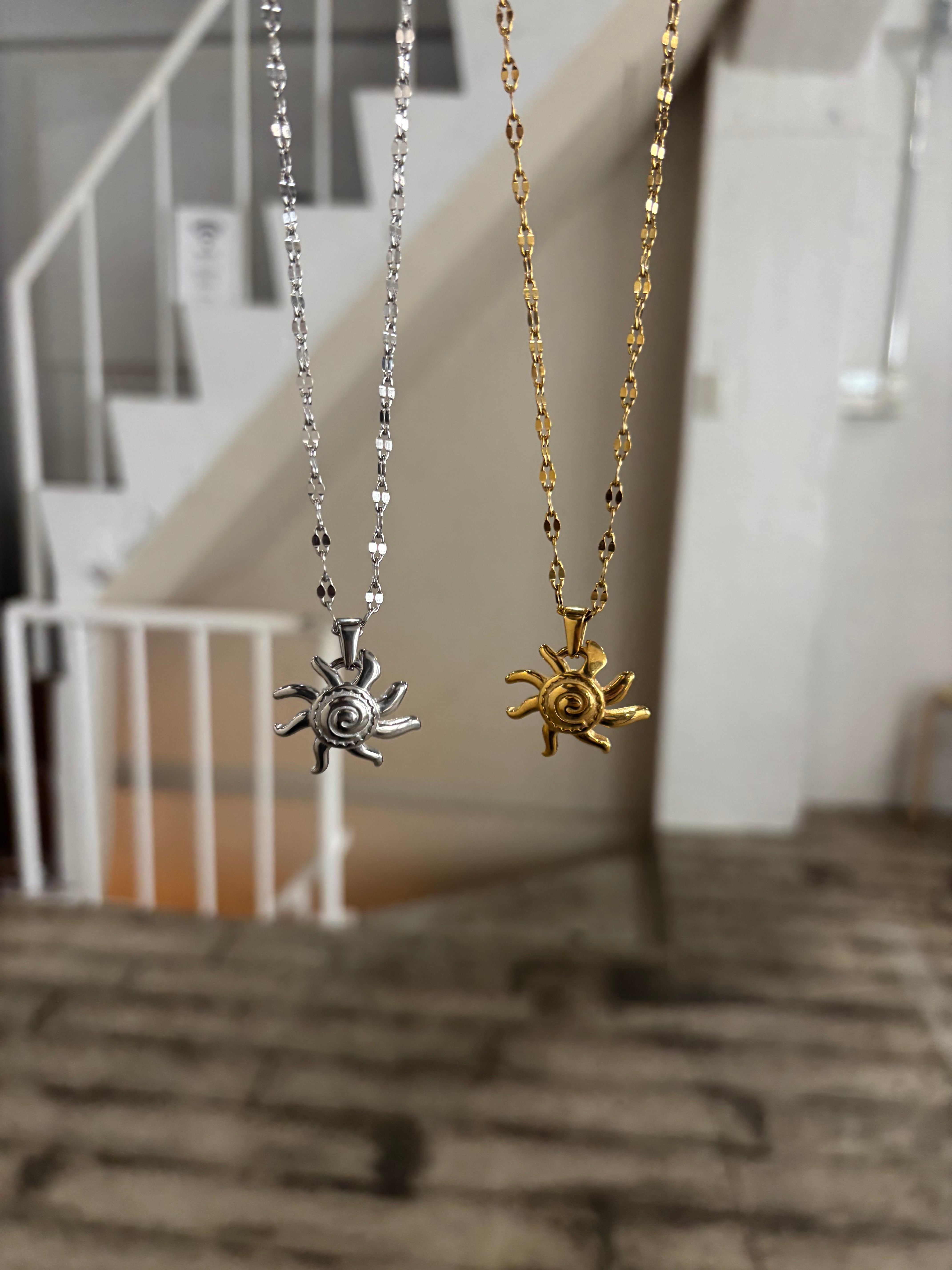 太陽モチーフに渦巻きを重ねた、存在感のあるネックレス。