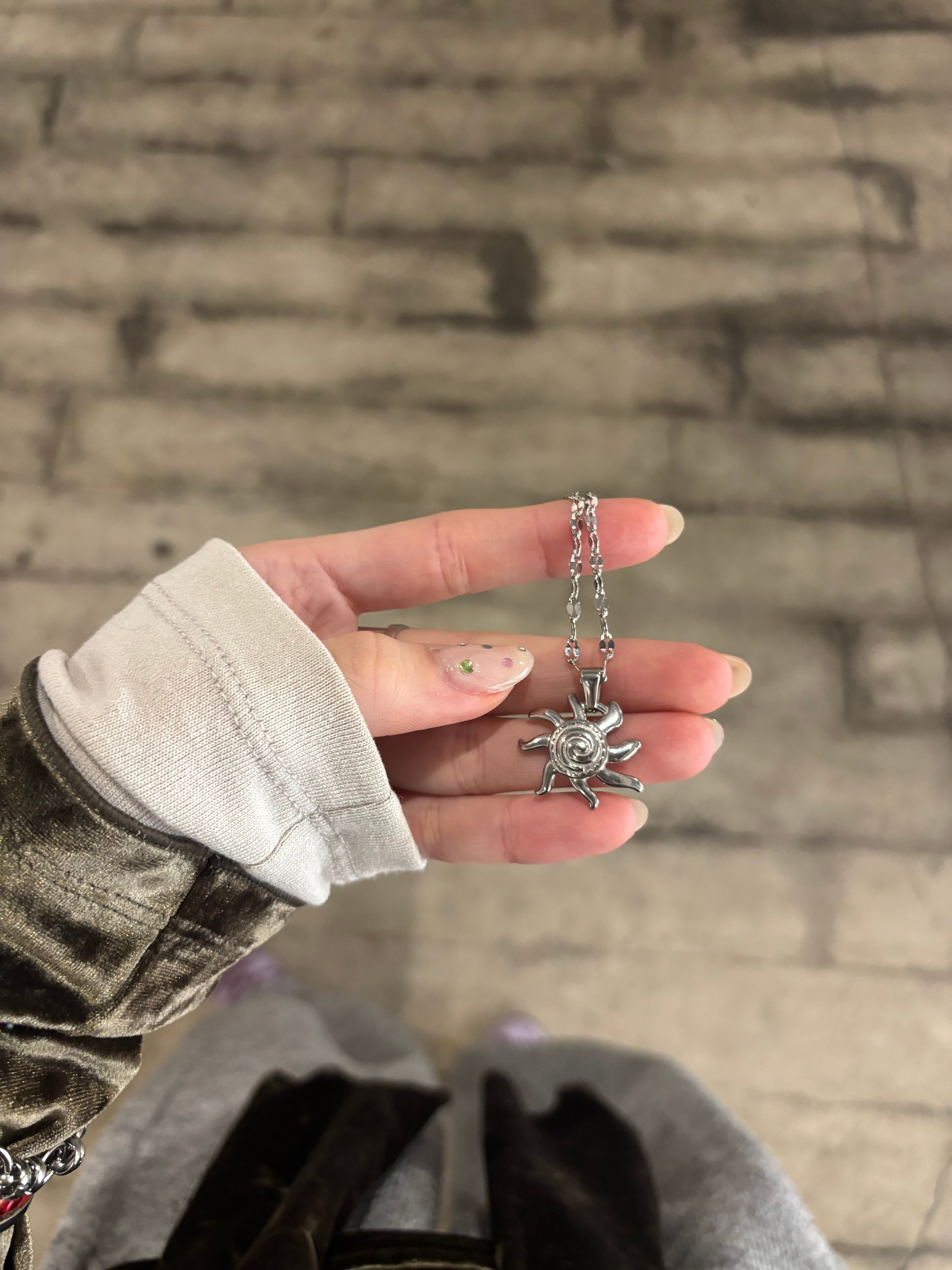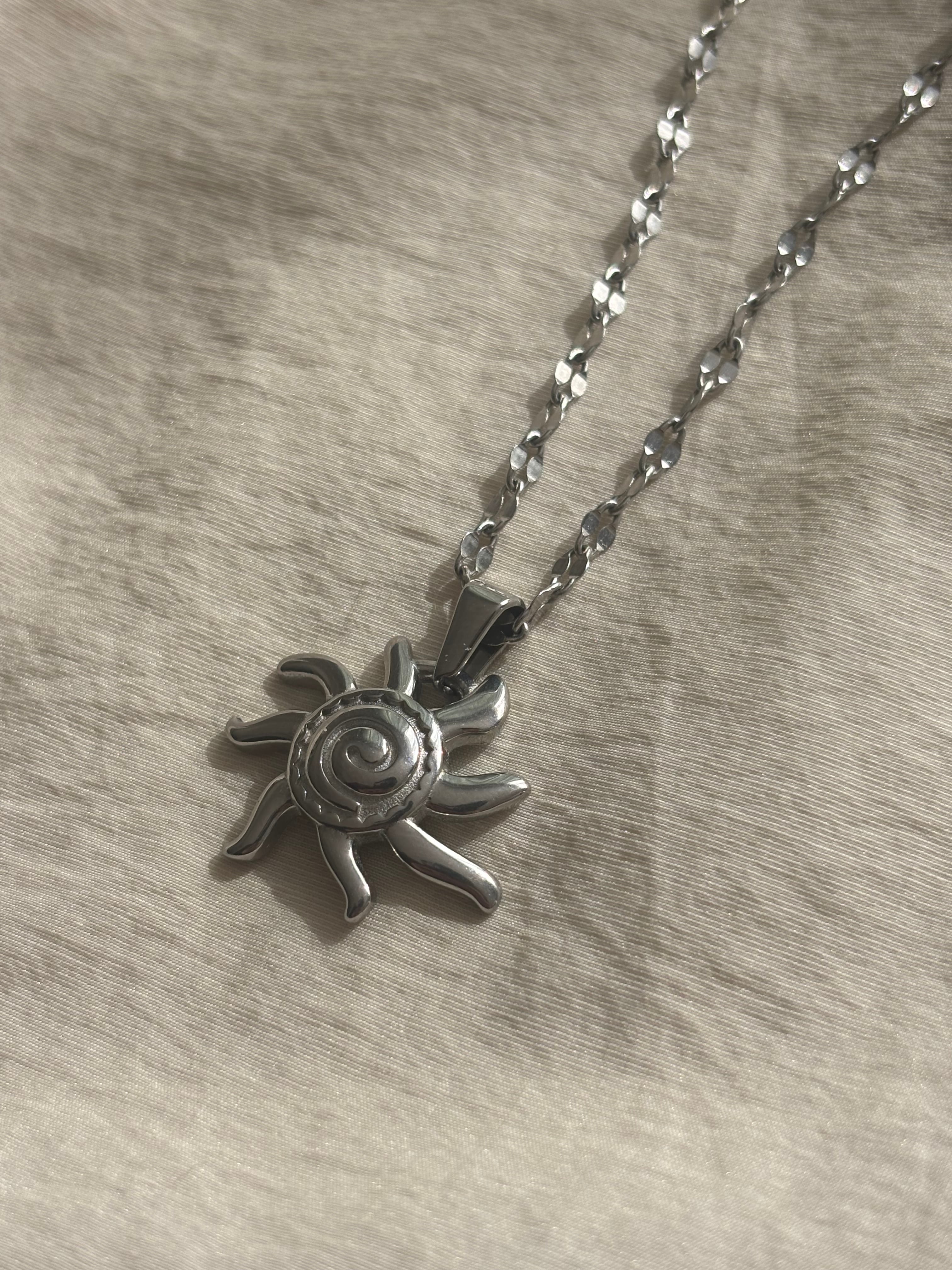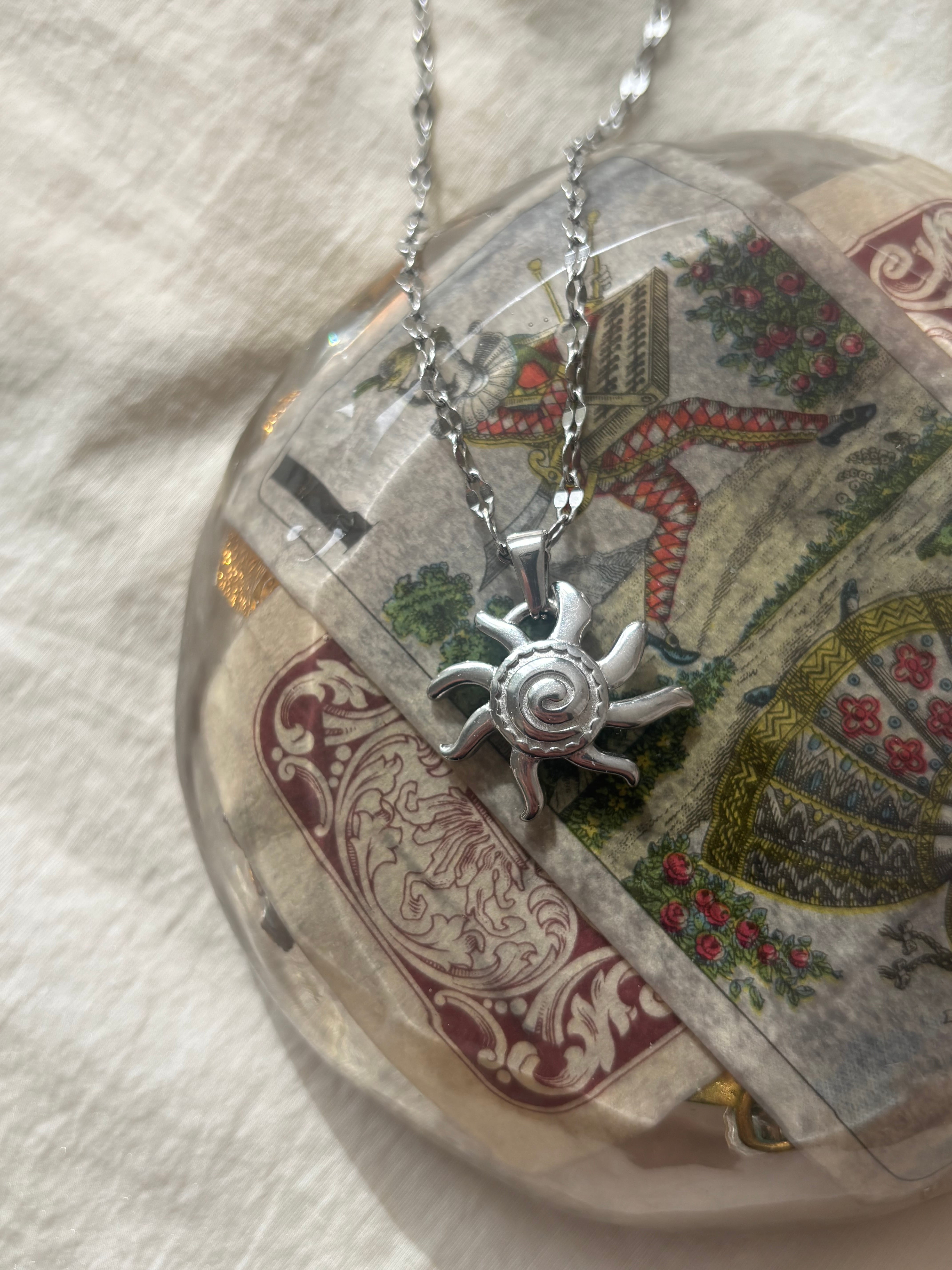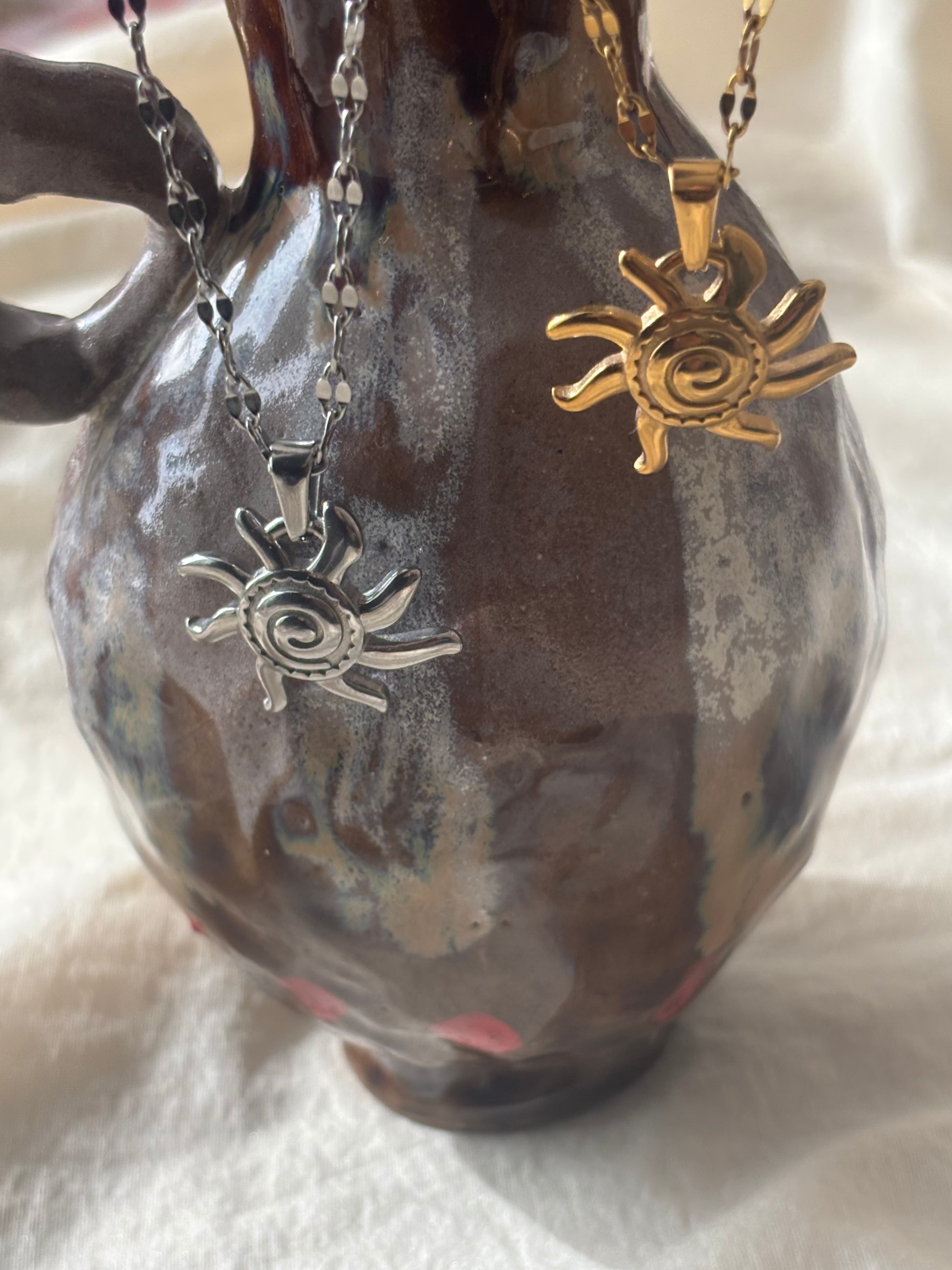 太陽モチーフに渦巻きを重ねた、存在感のあるネックレス。