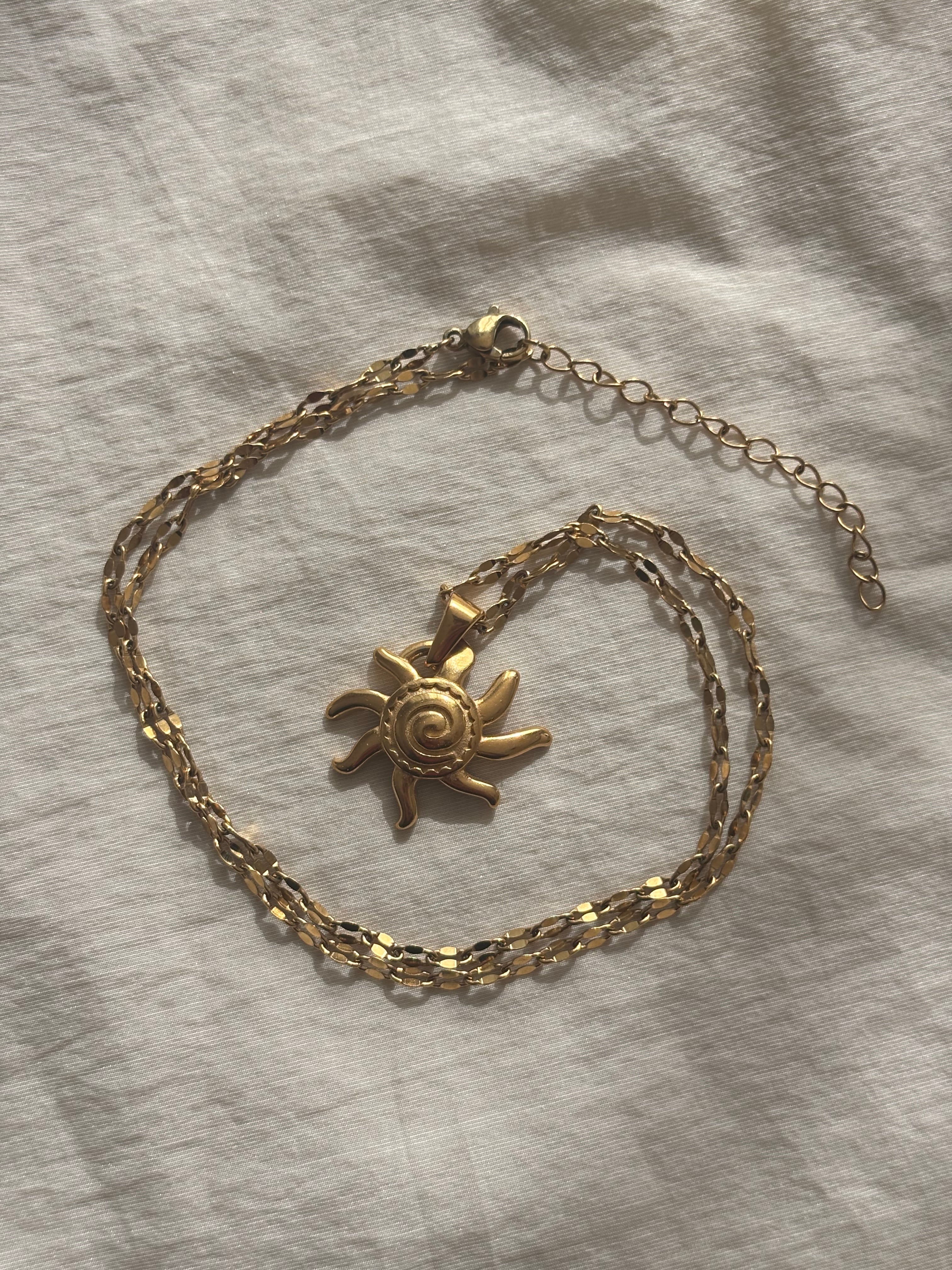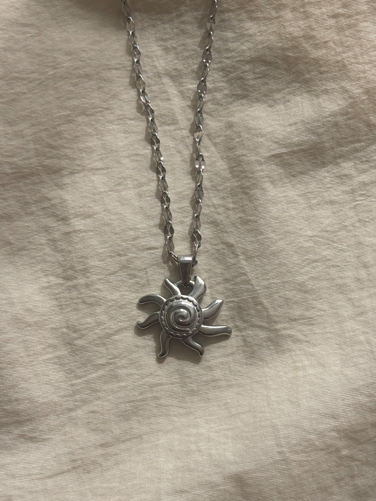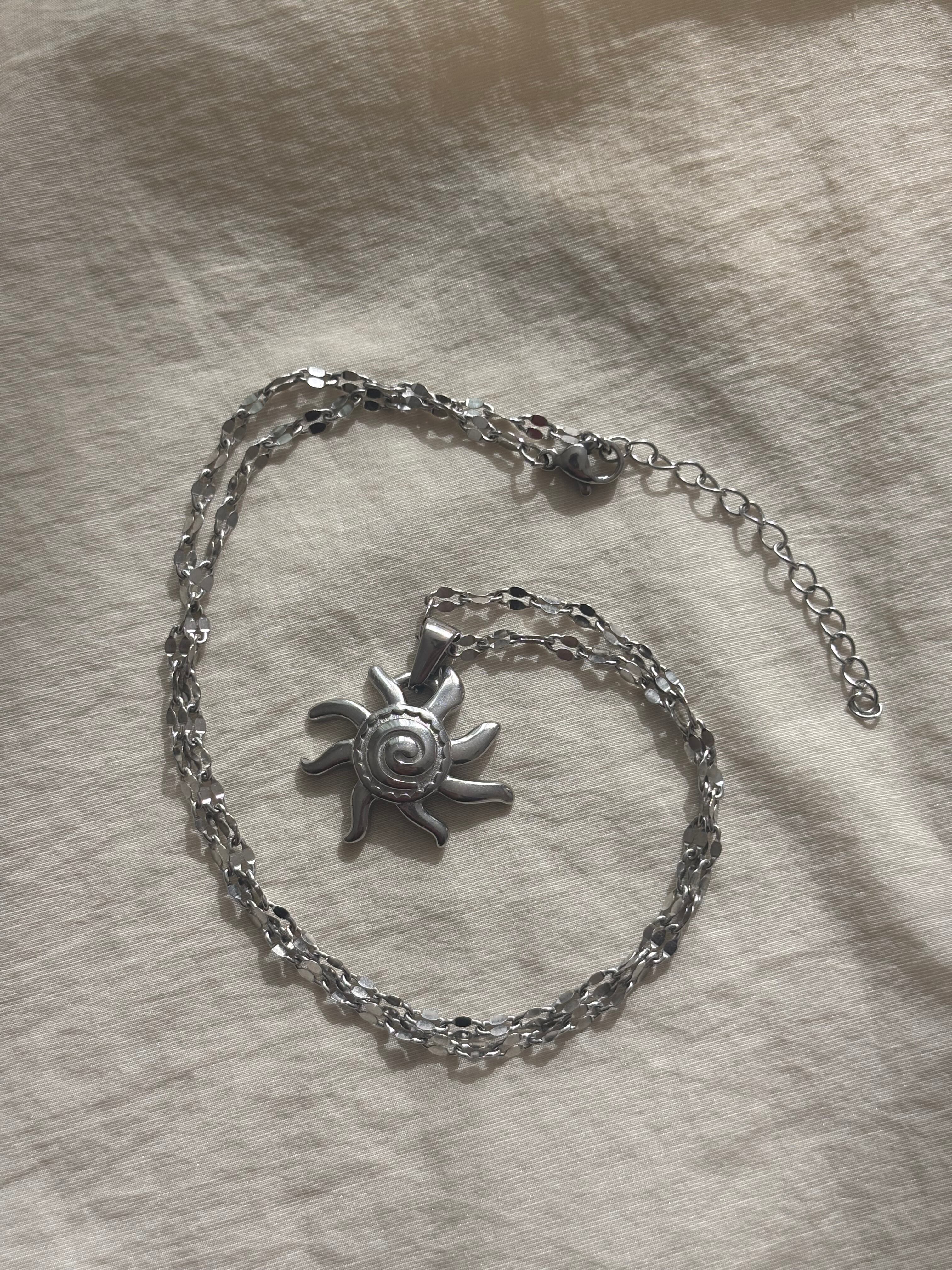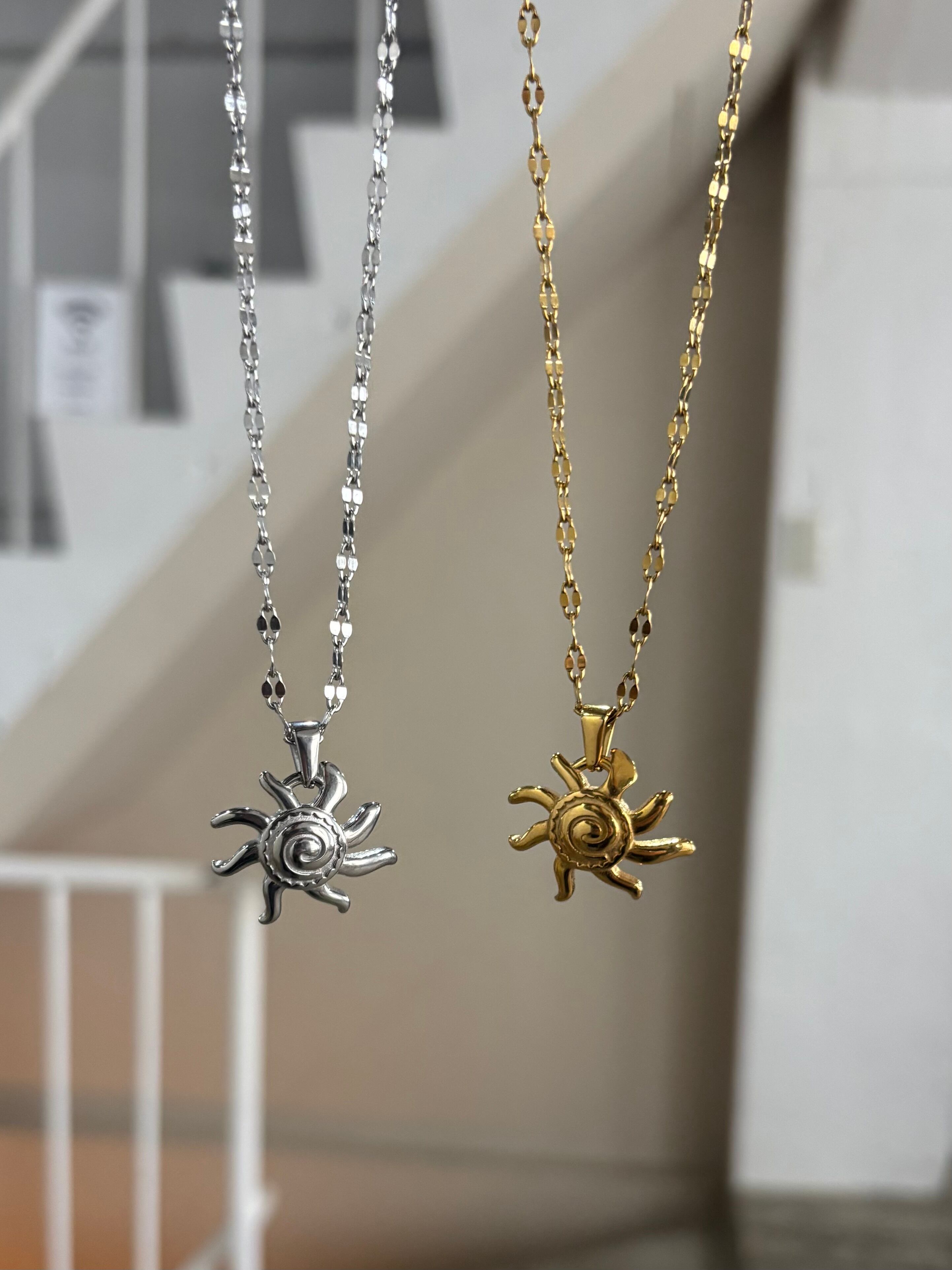 太陽モチーフに渦巻きを重ねた、存在感のあるネックレス。