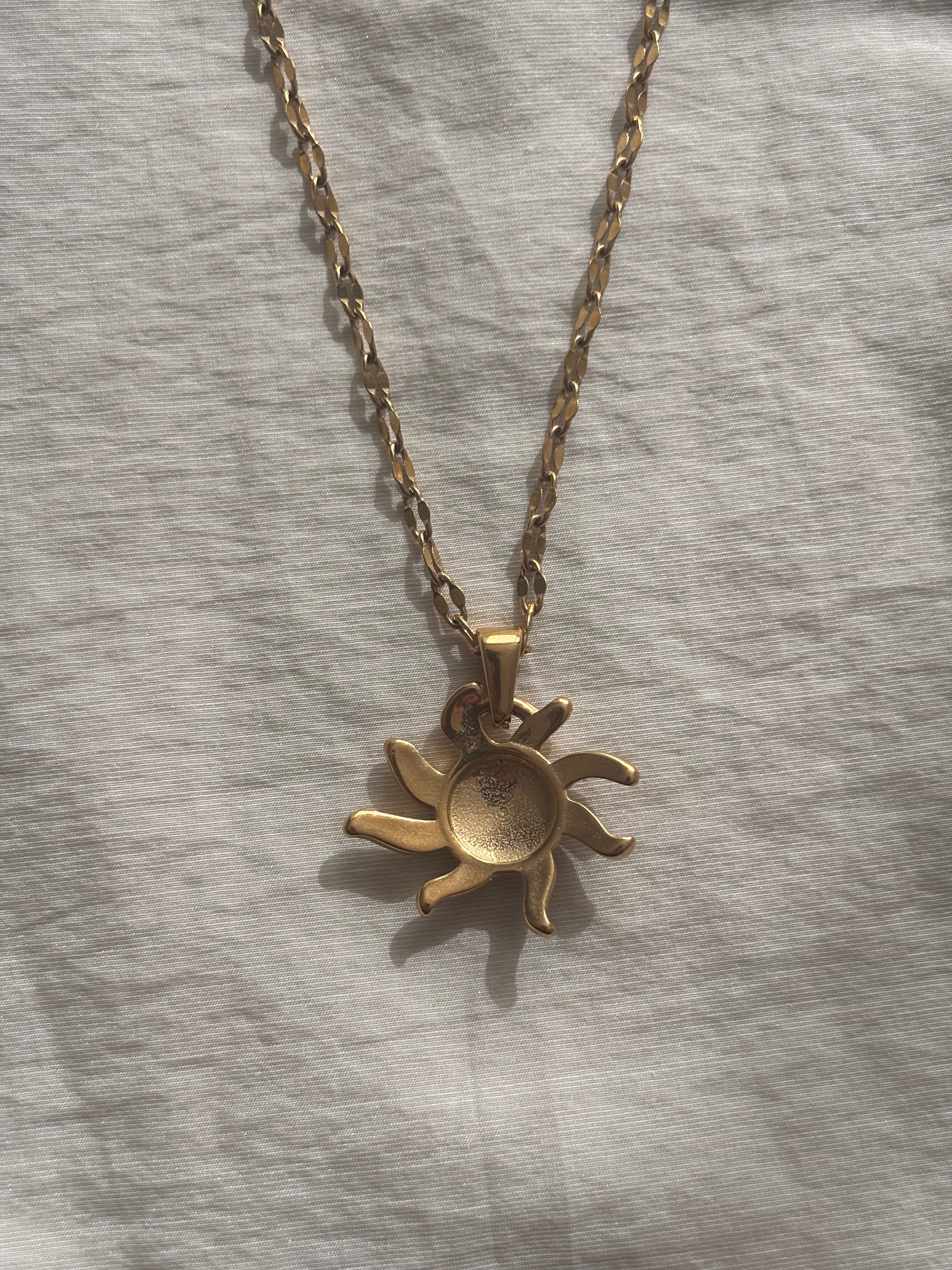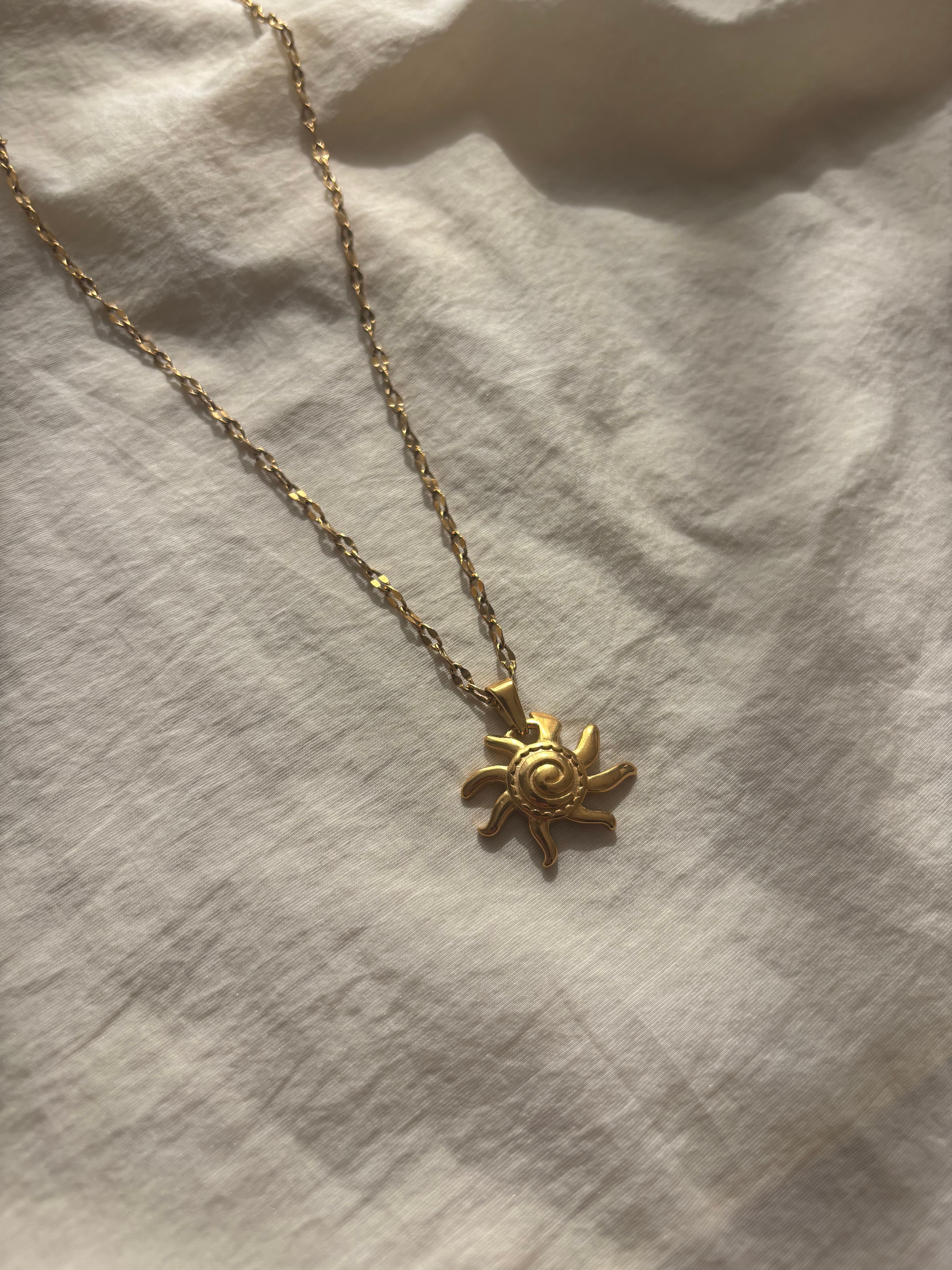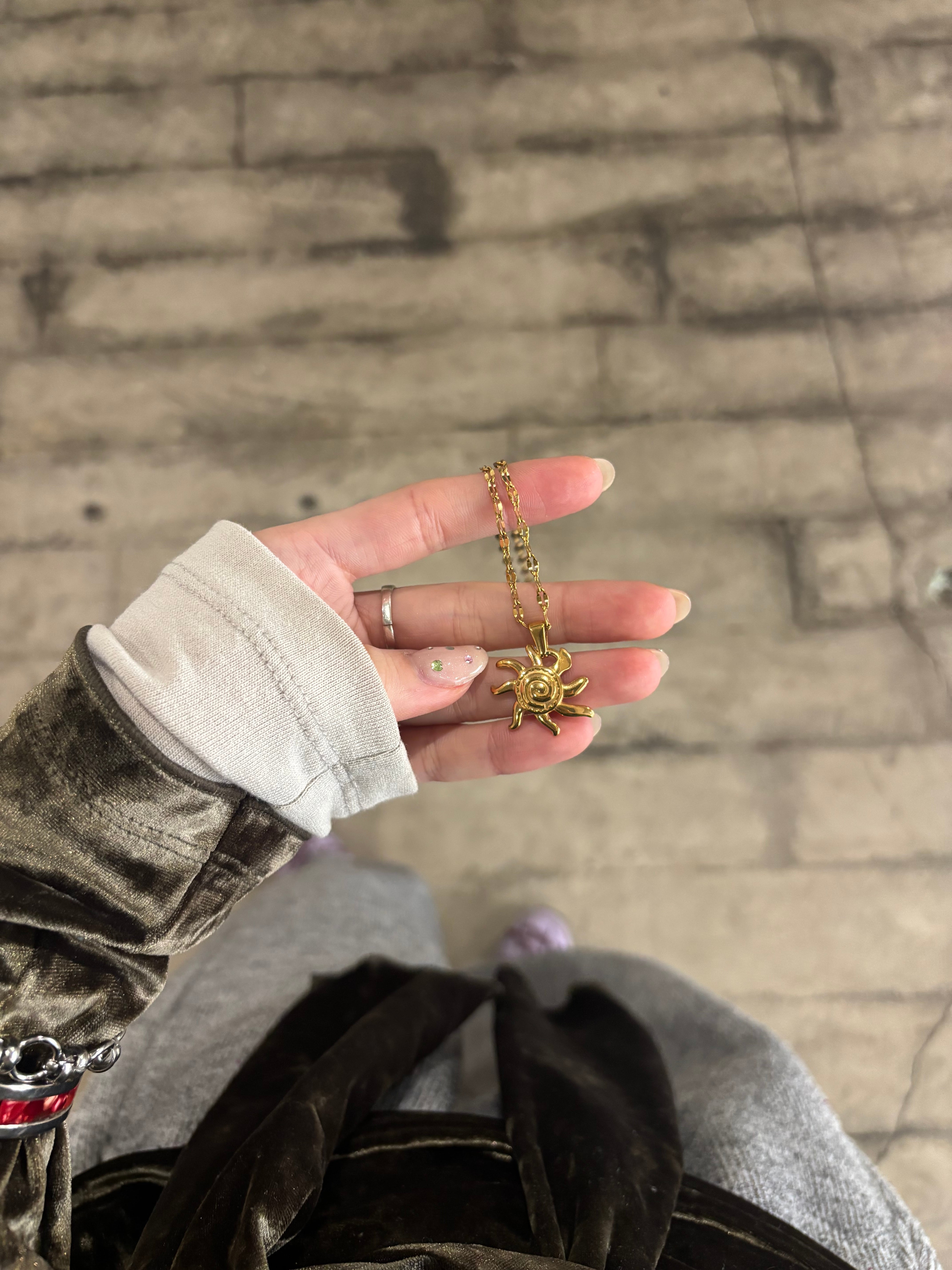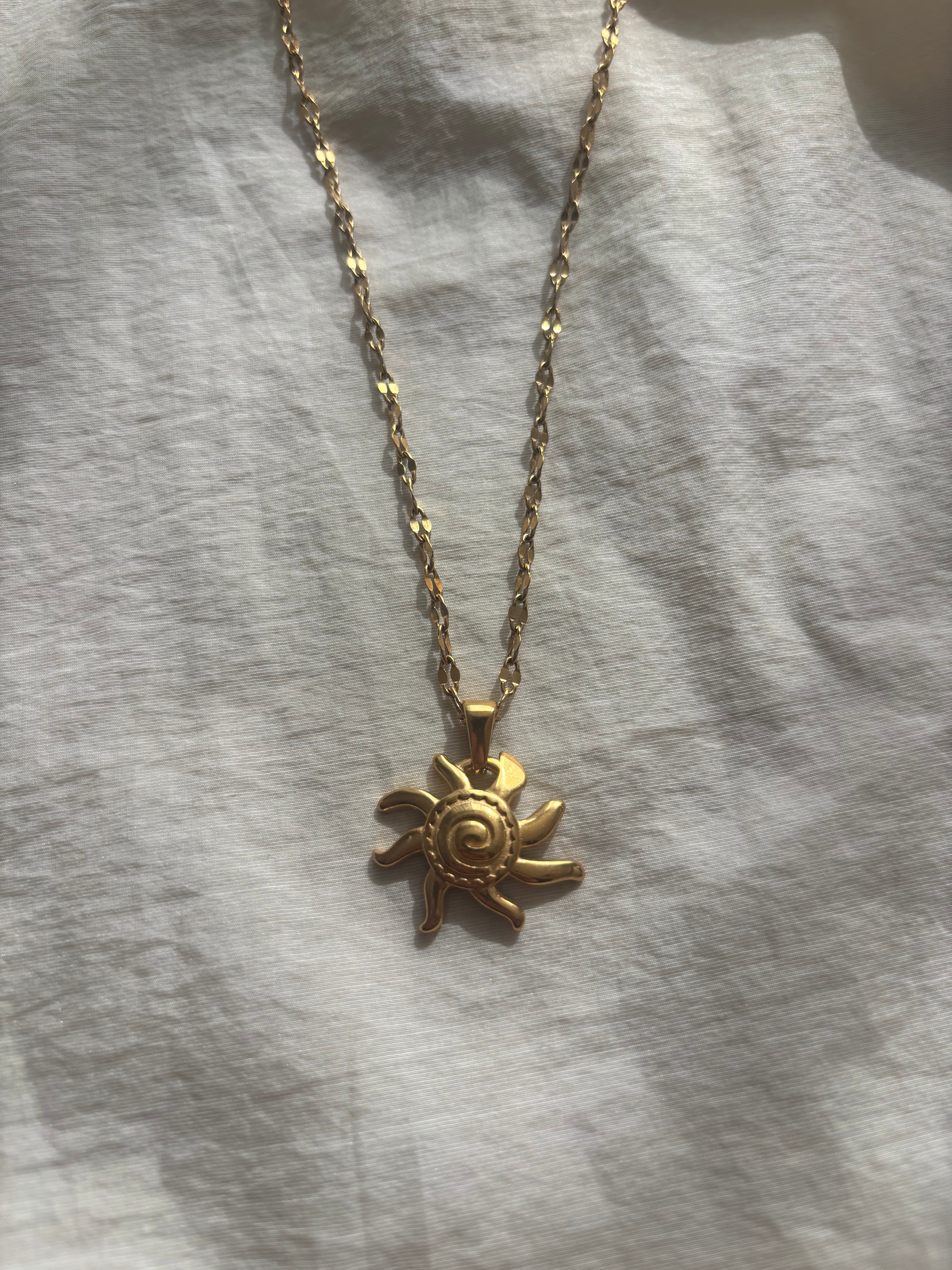 太陽モチーフに渦巻きを重ねた、存在感のあるネックレス。