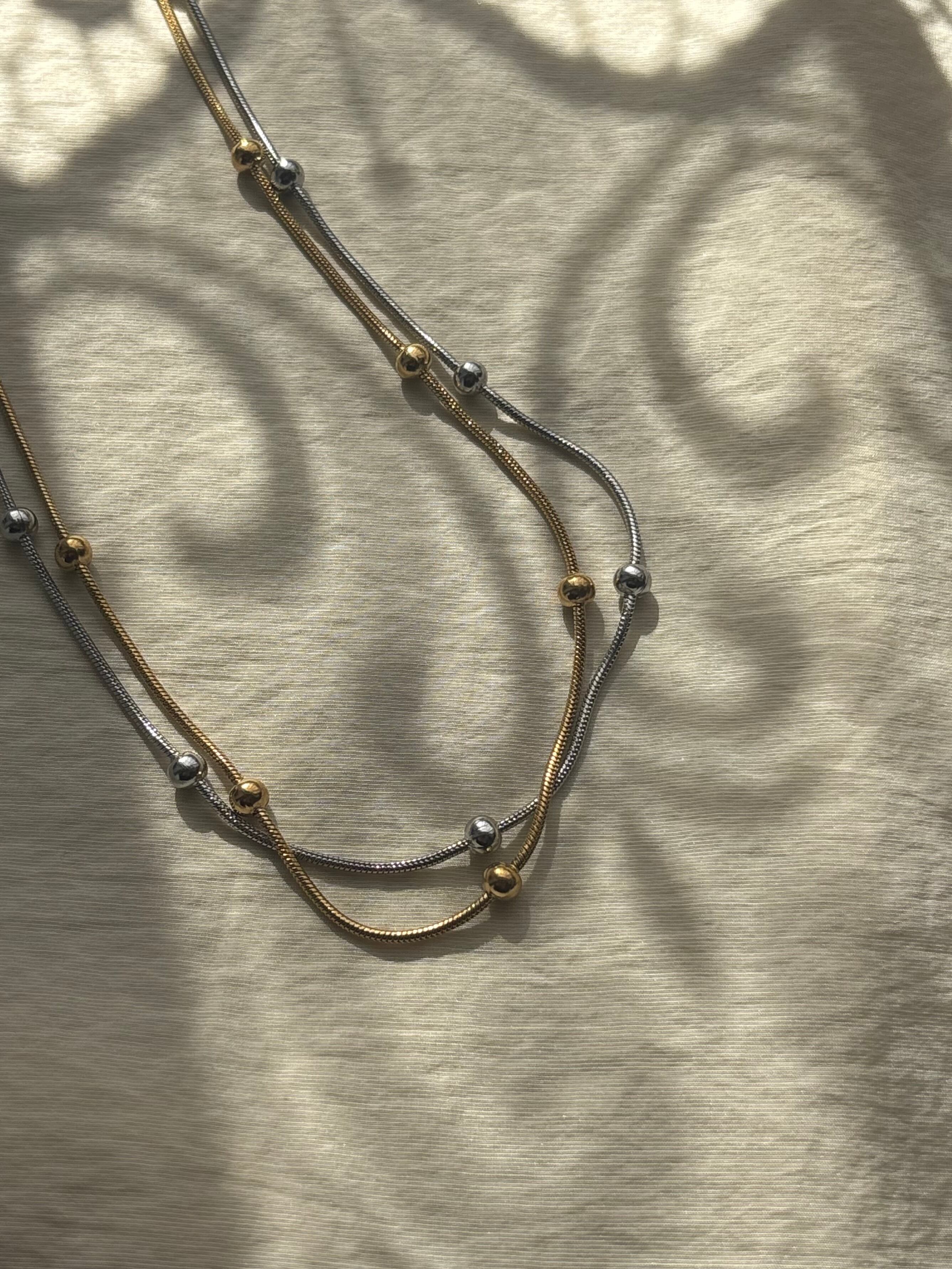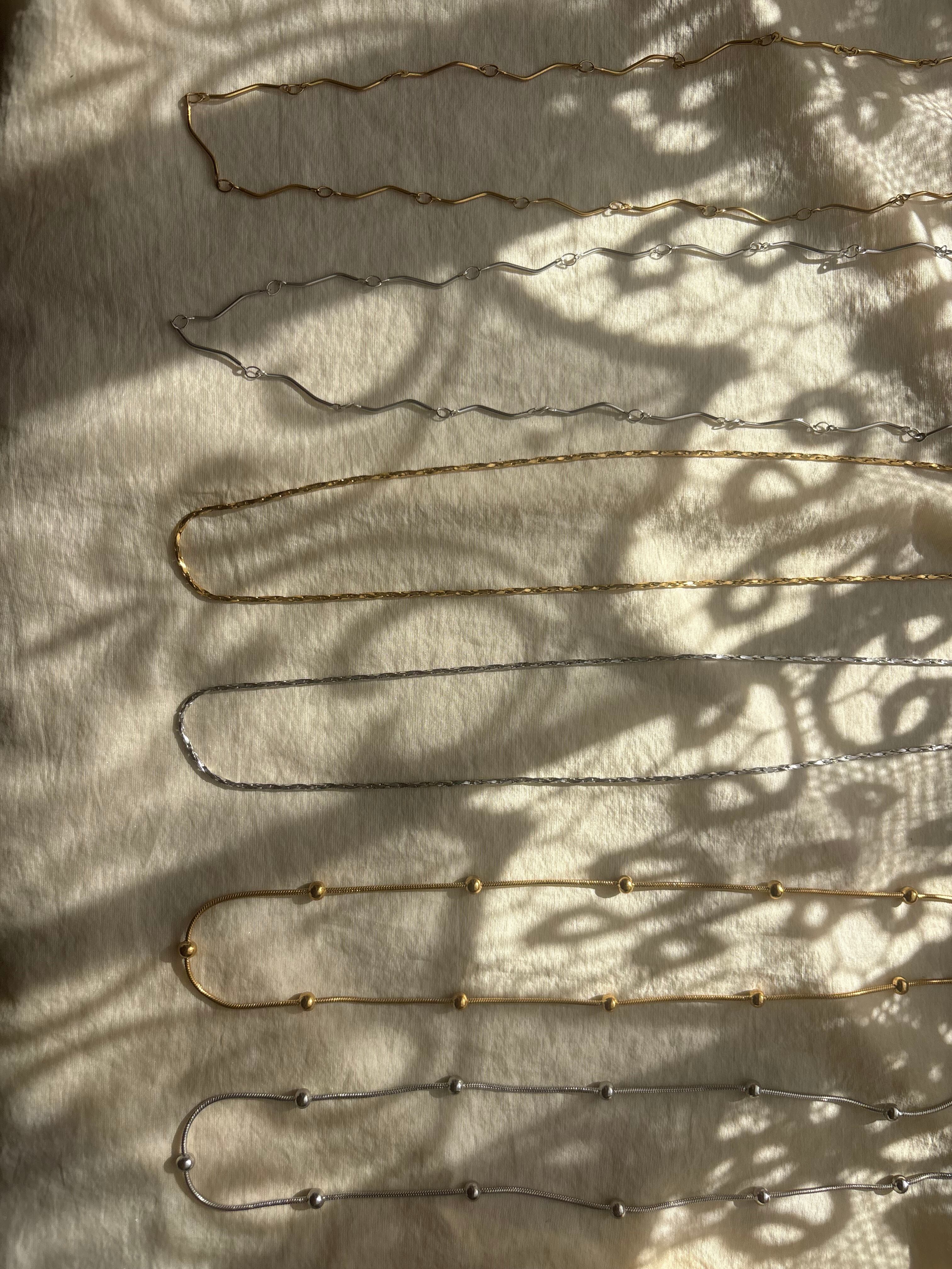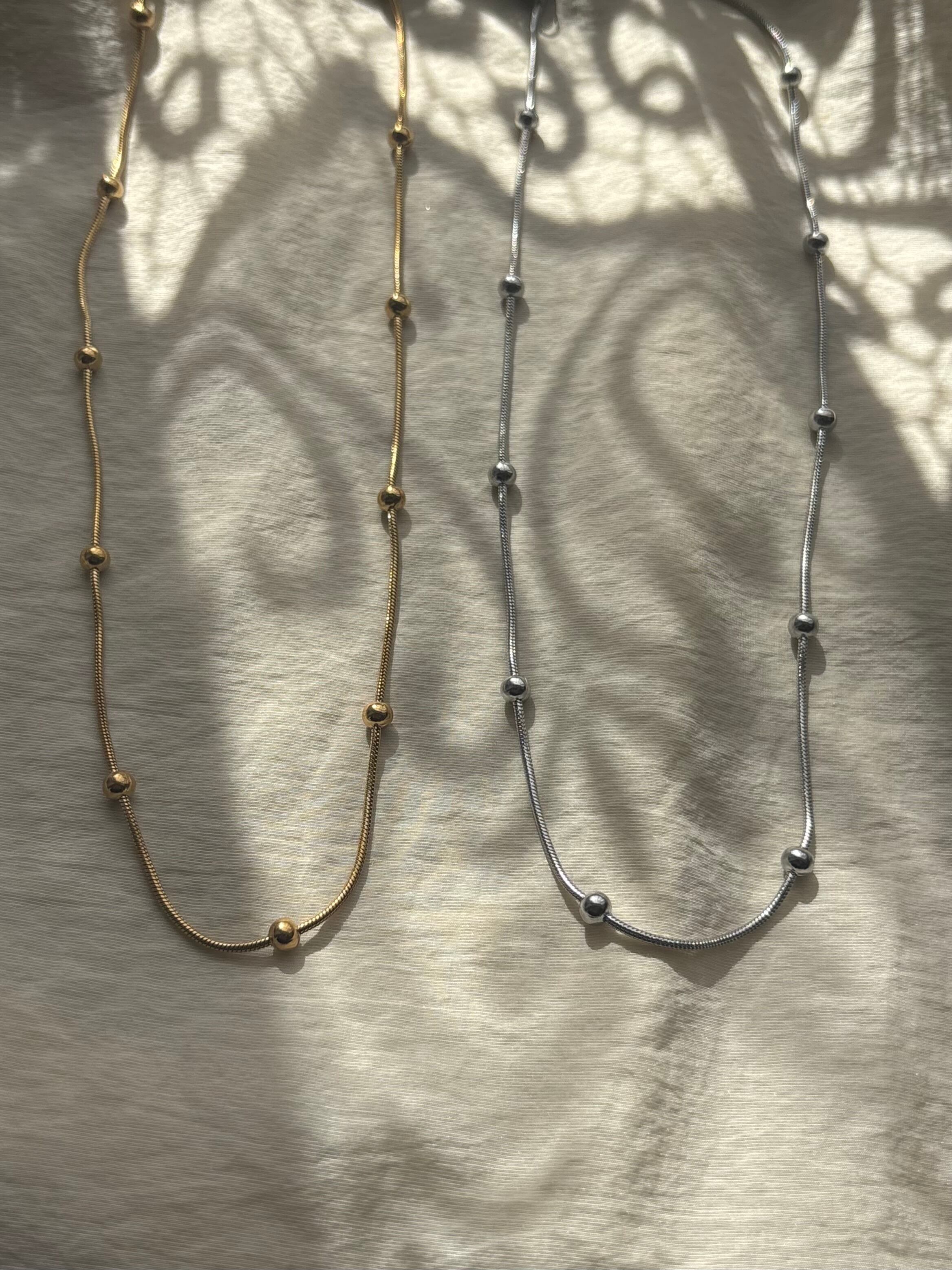 なめらかなスネイクチェーンに粒の表情をプラスした、毎日つけたくなる一本です。