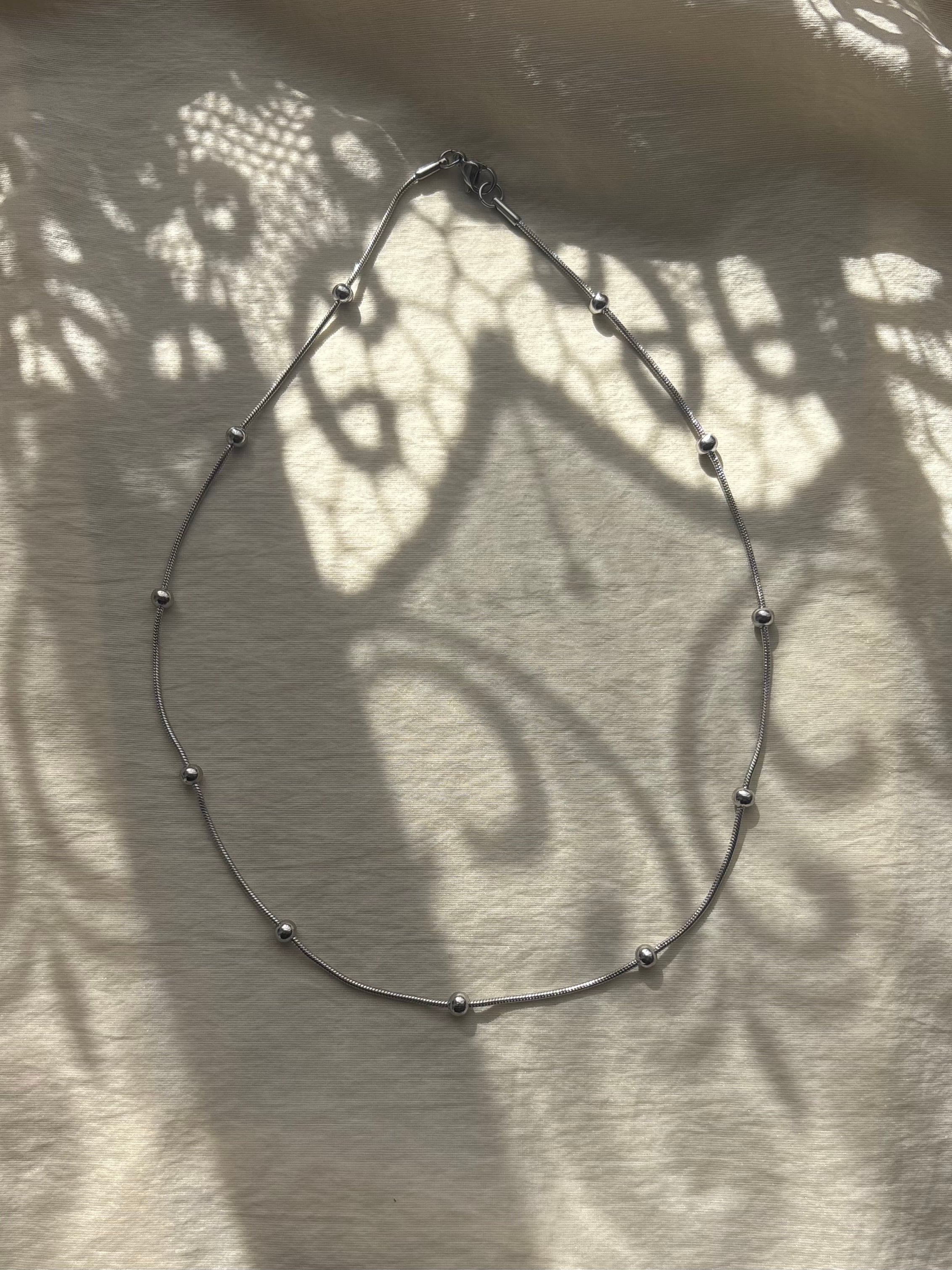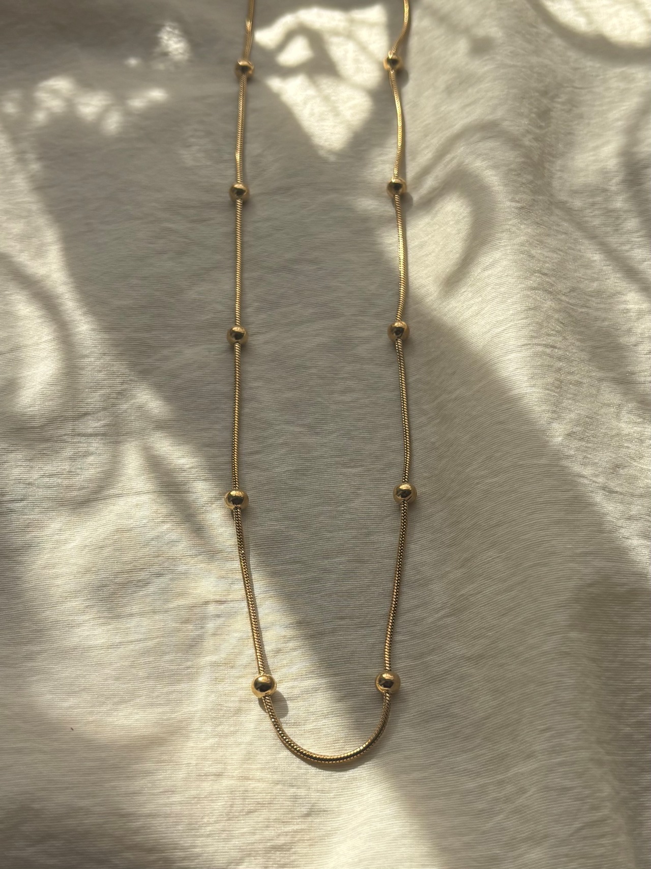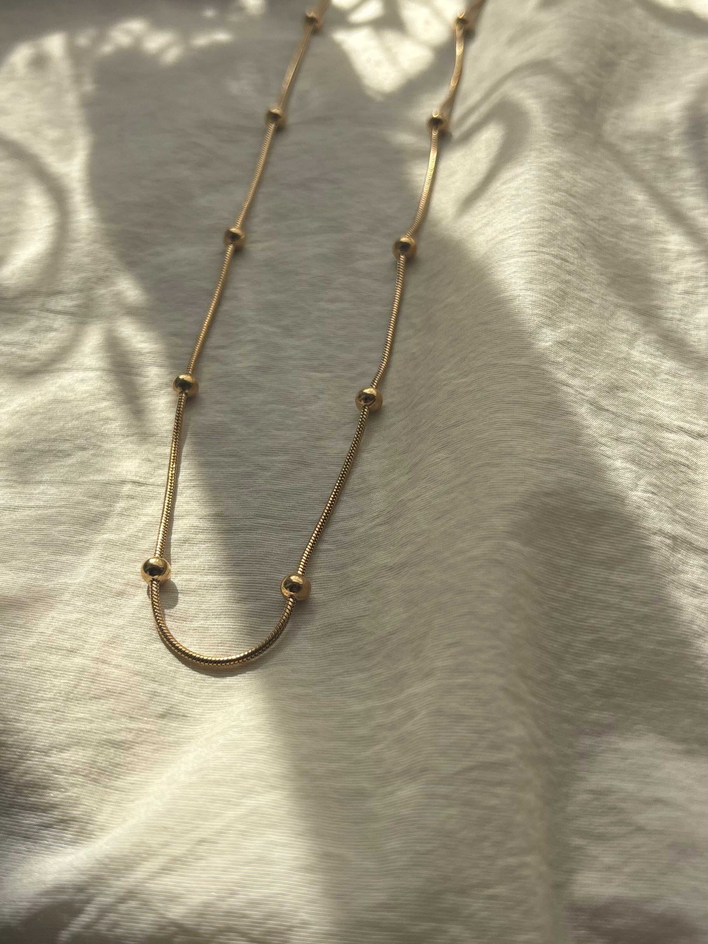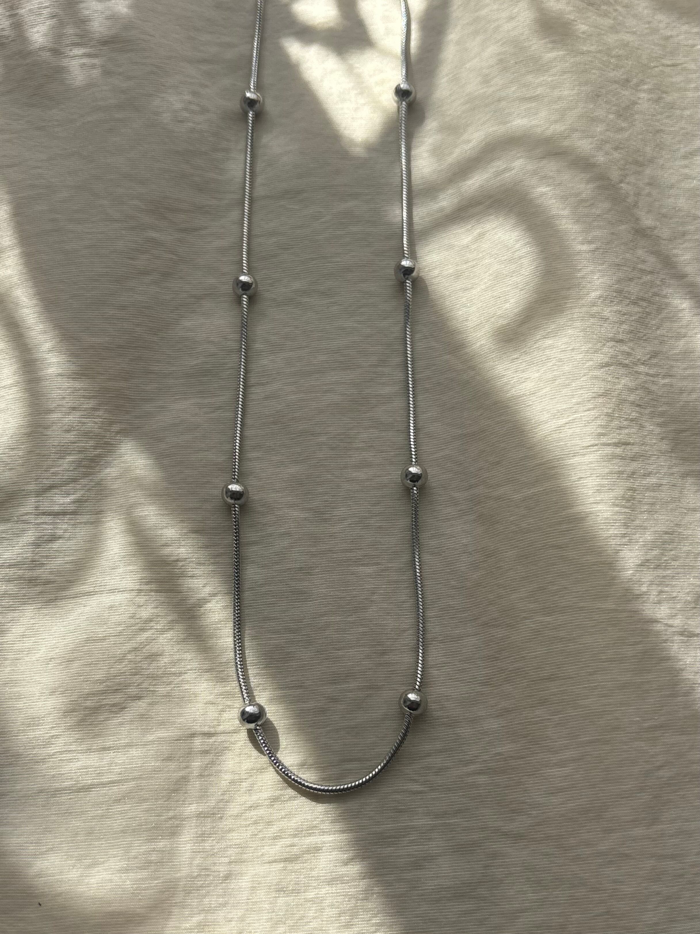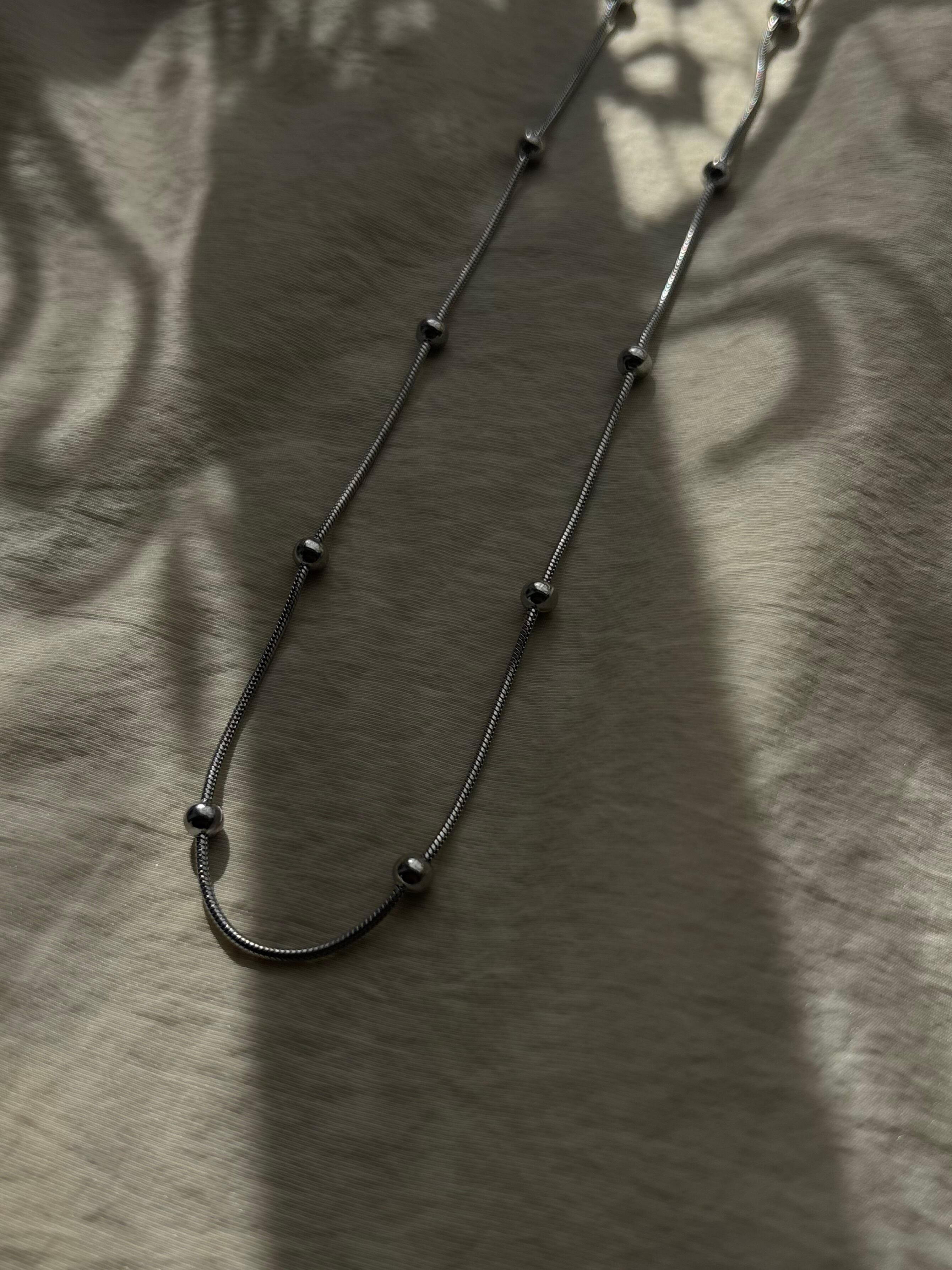 スネイクチェーンのなめらかなラインに、等間隔の粒がアクセント。シンプルすぎず、でも主張しすぎない絶妙なバランスで、首元をきれいに見せてくれます。