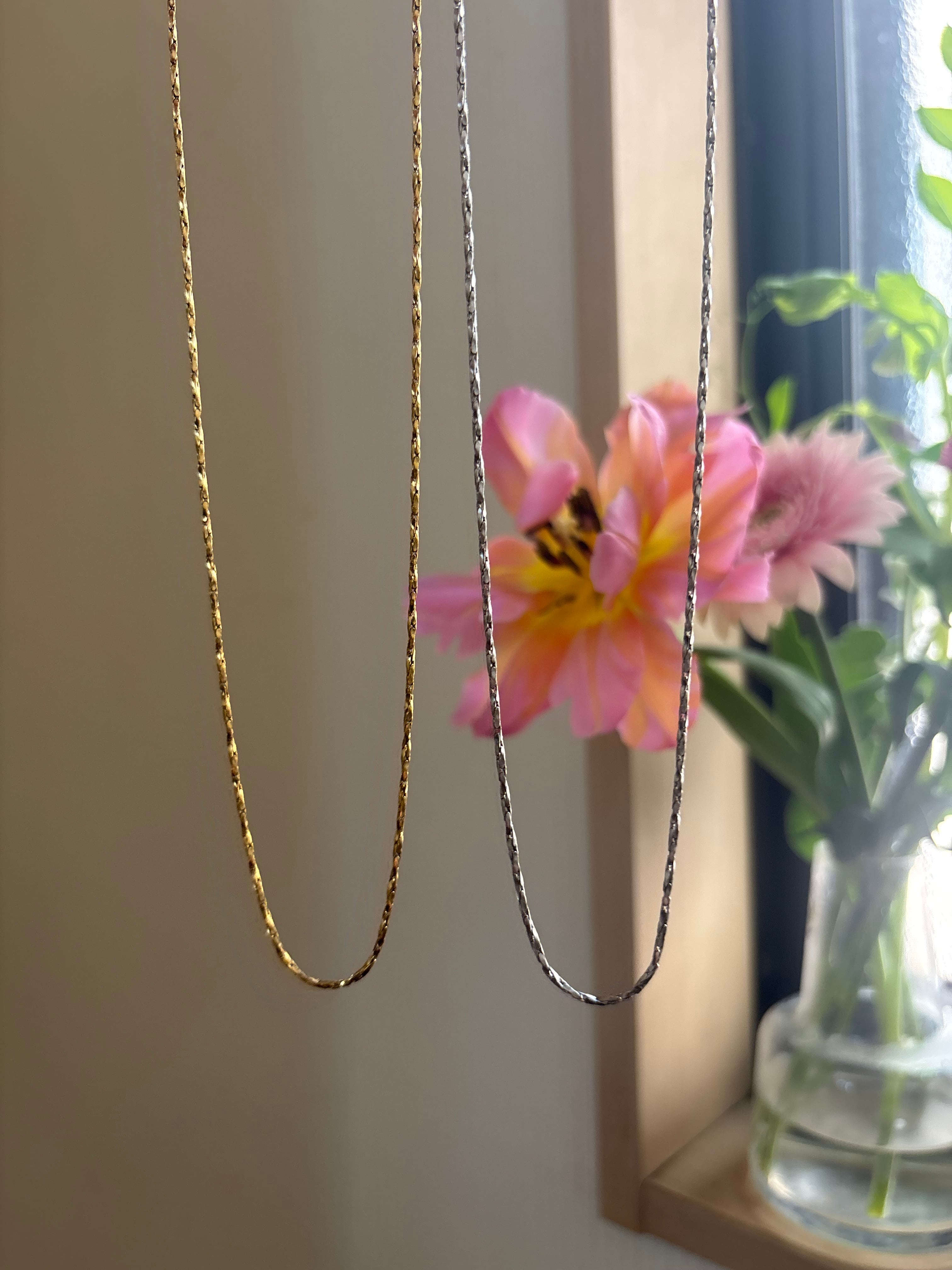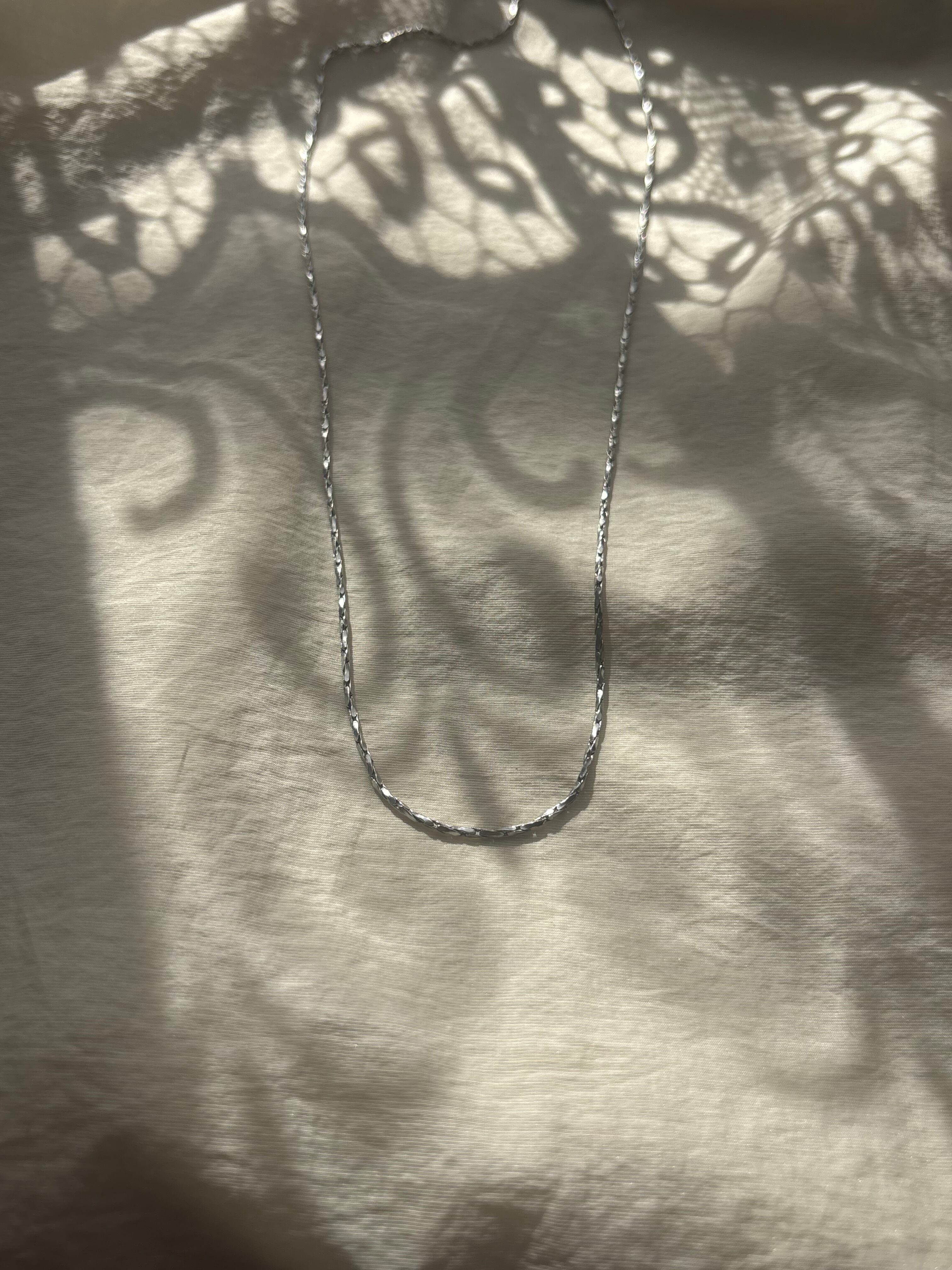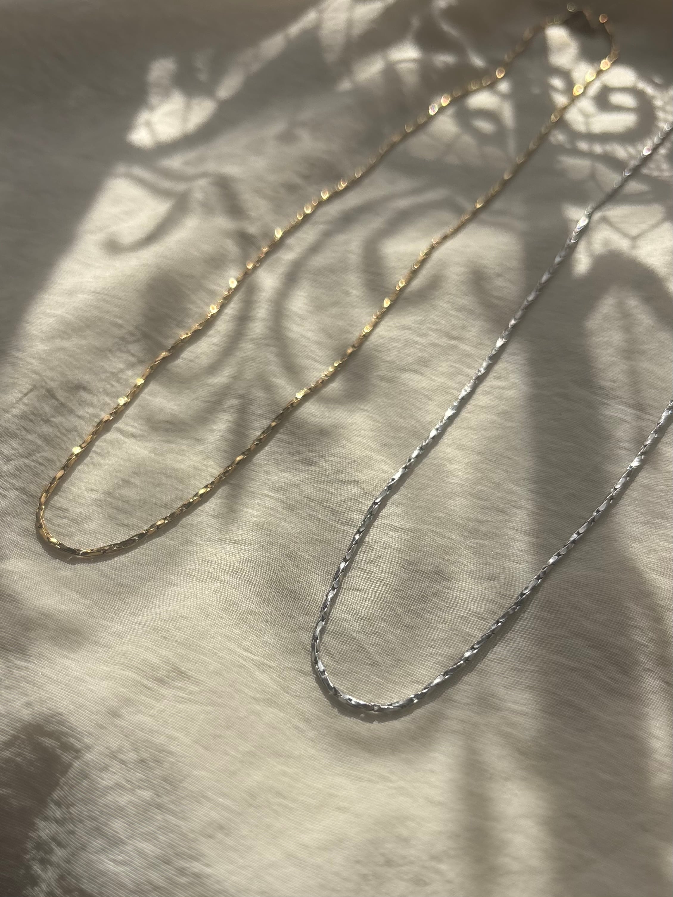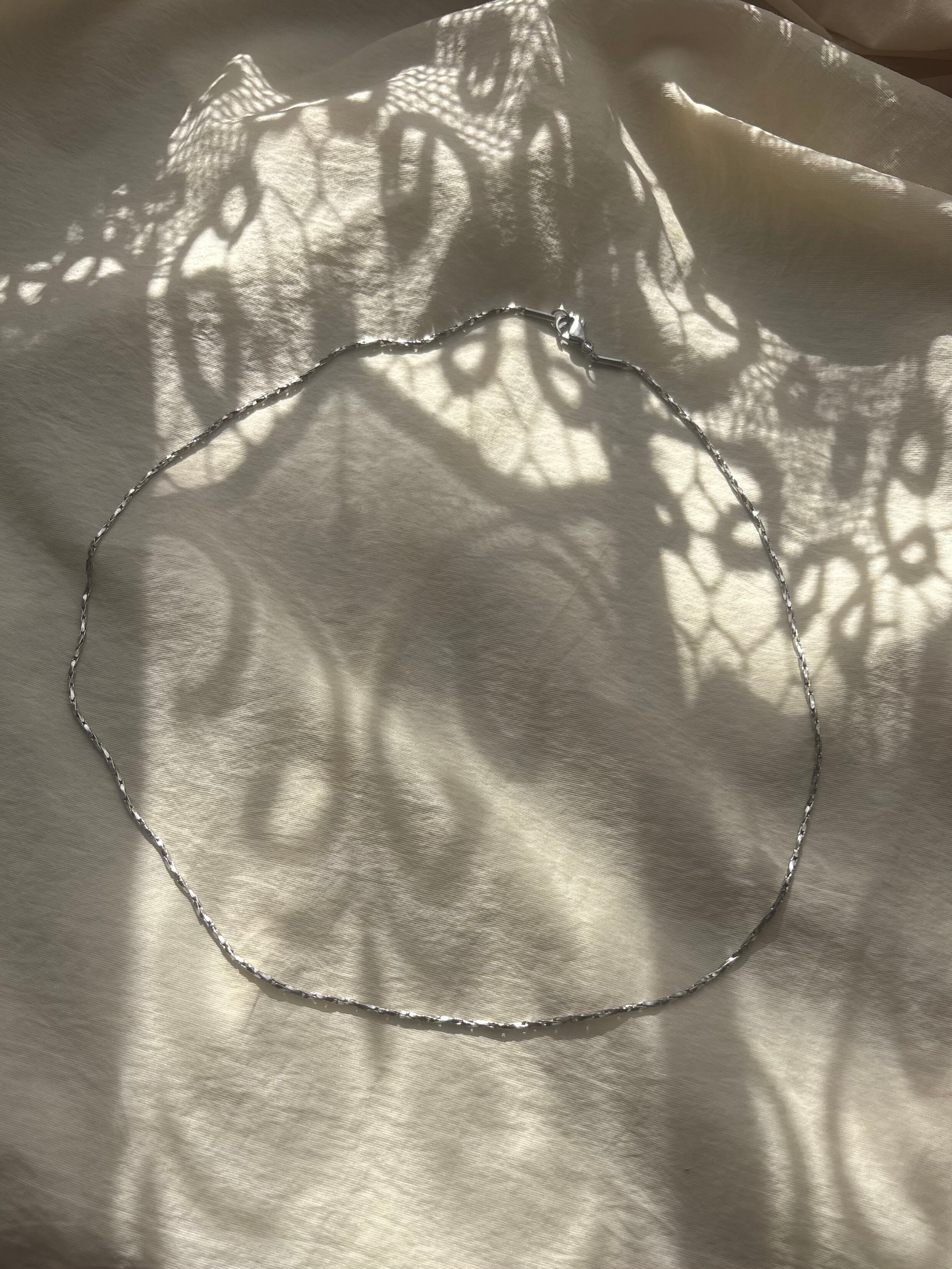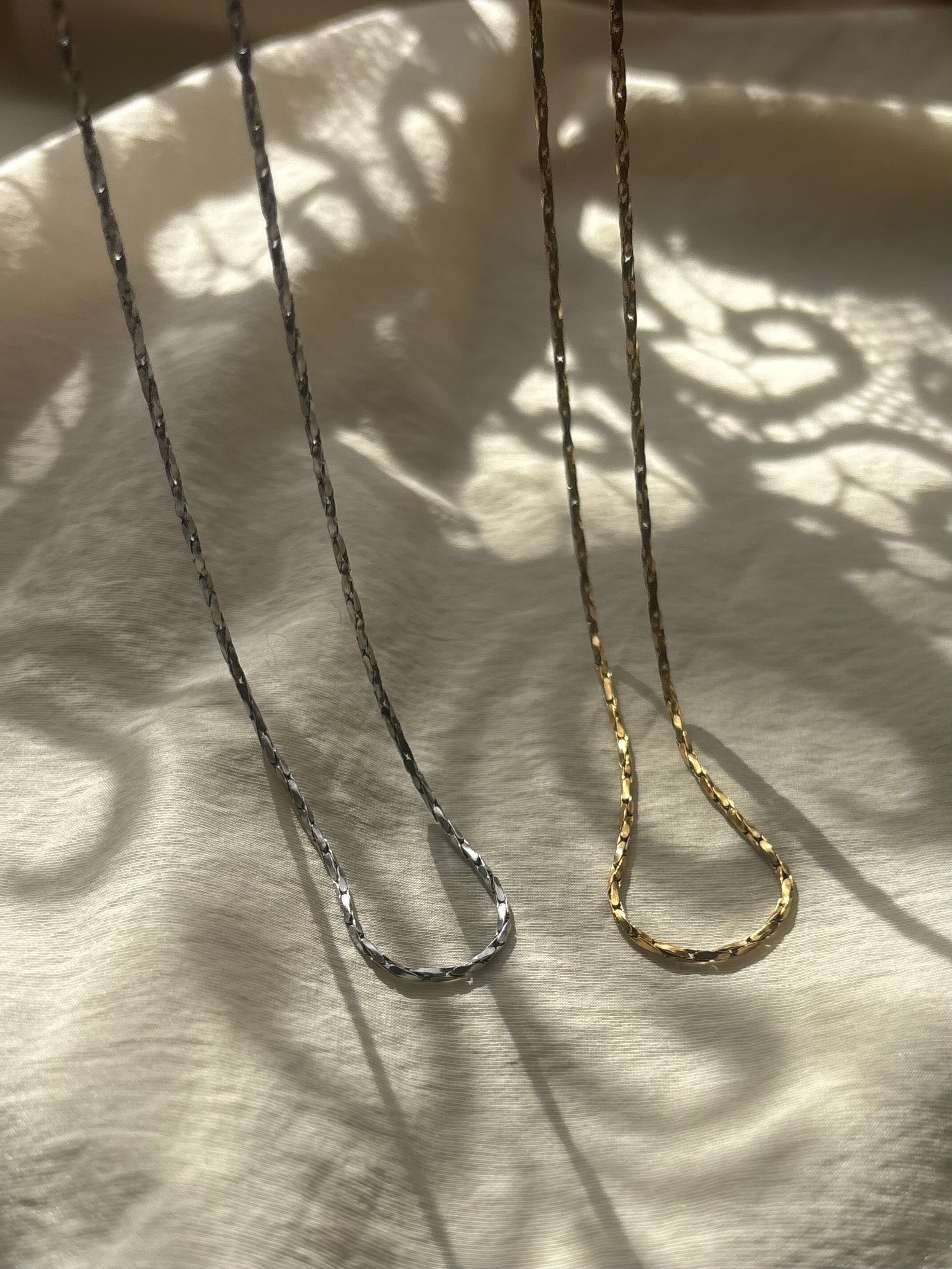 細かくカットが入ったチェーンが、動くたびに繊細な光を反射、シンプルなのに、首元が自然と華やぐ一本です。