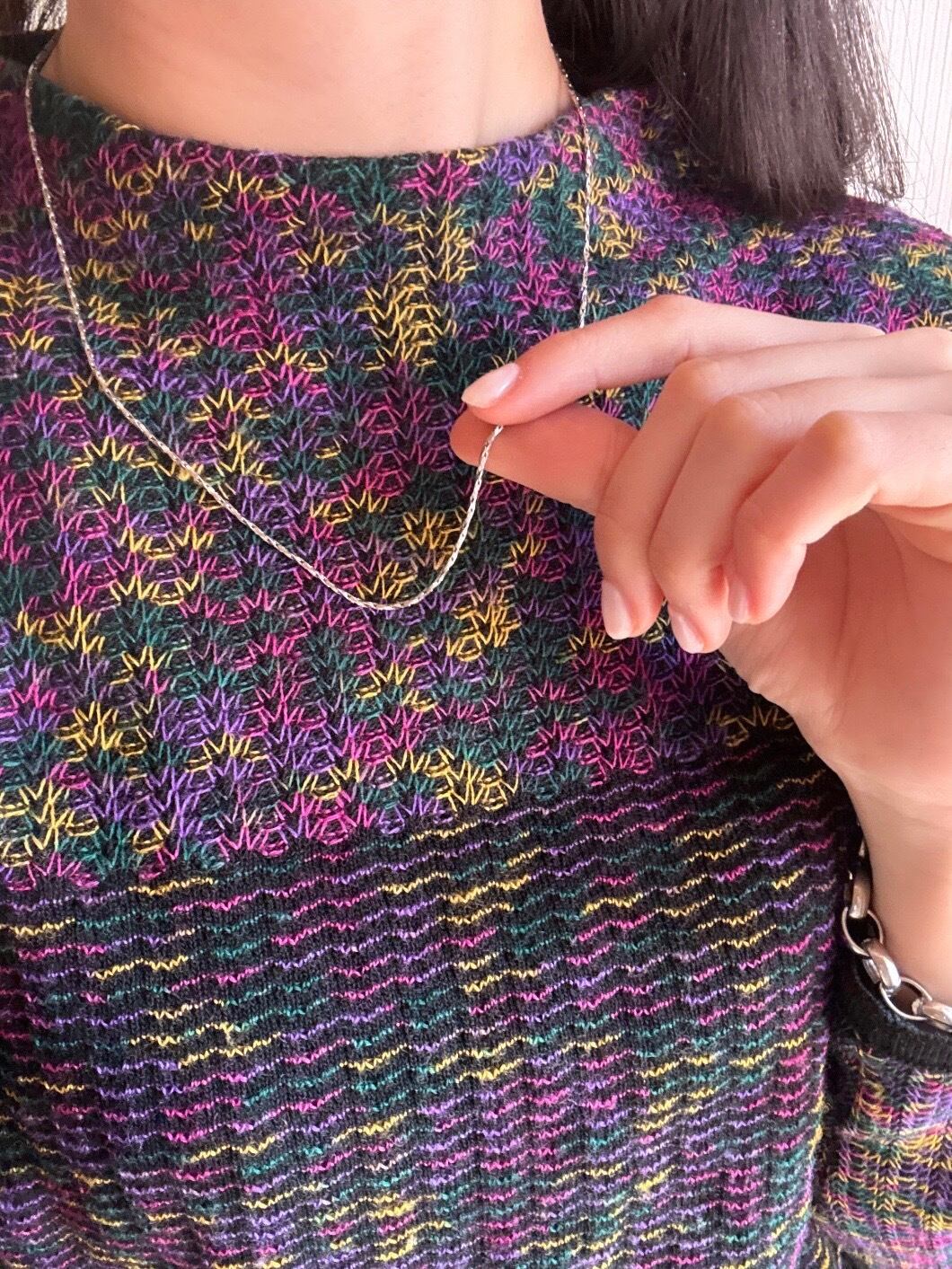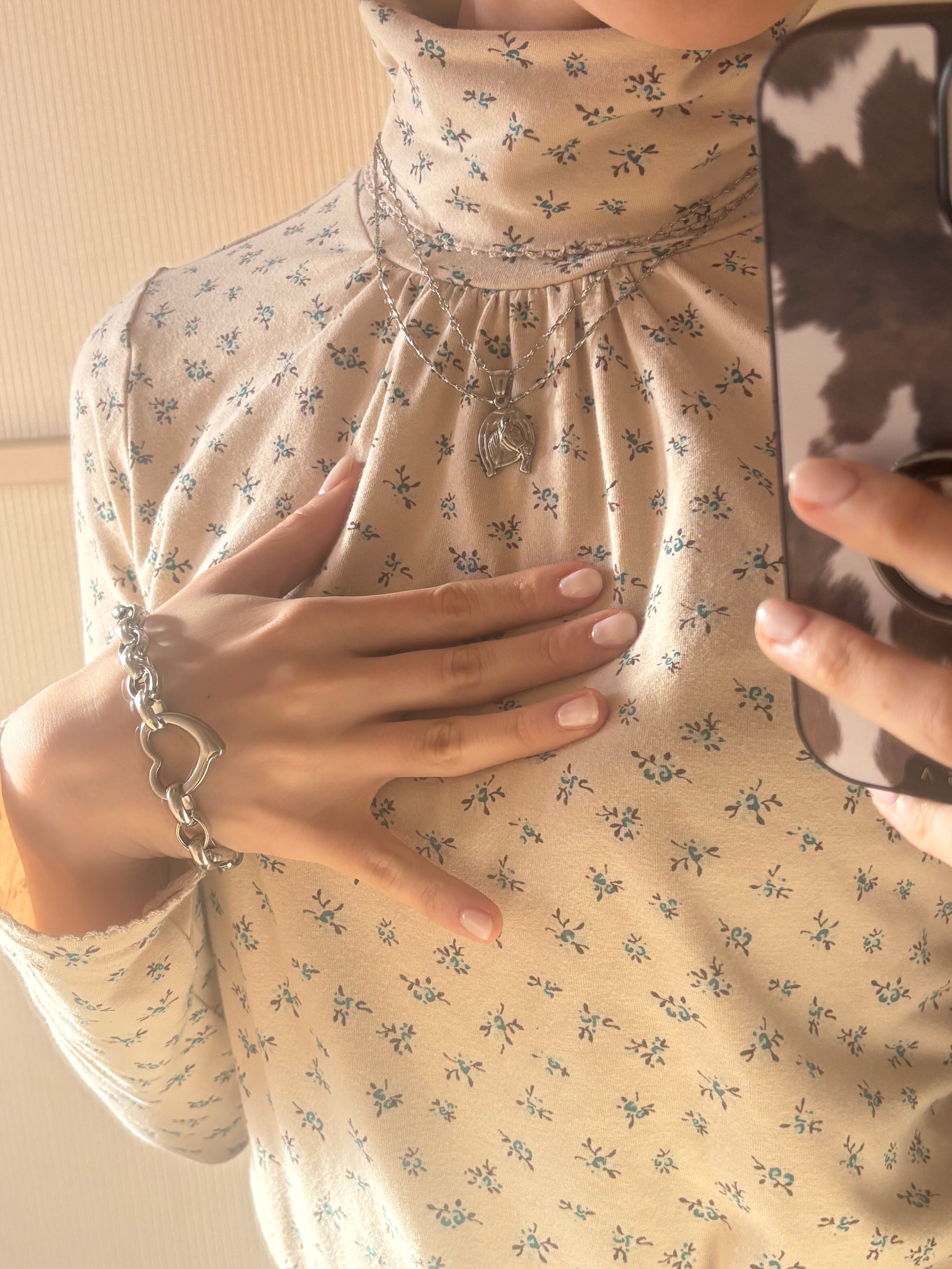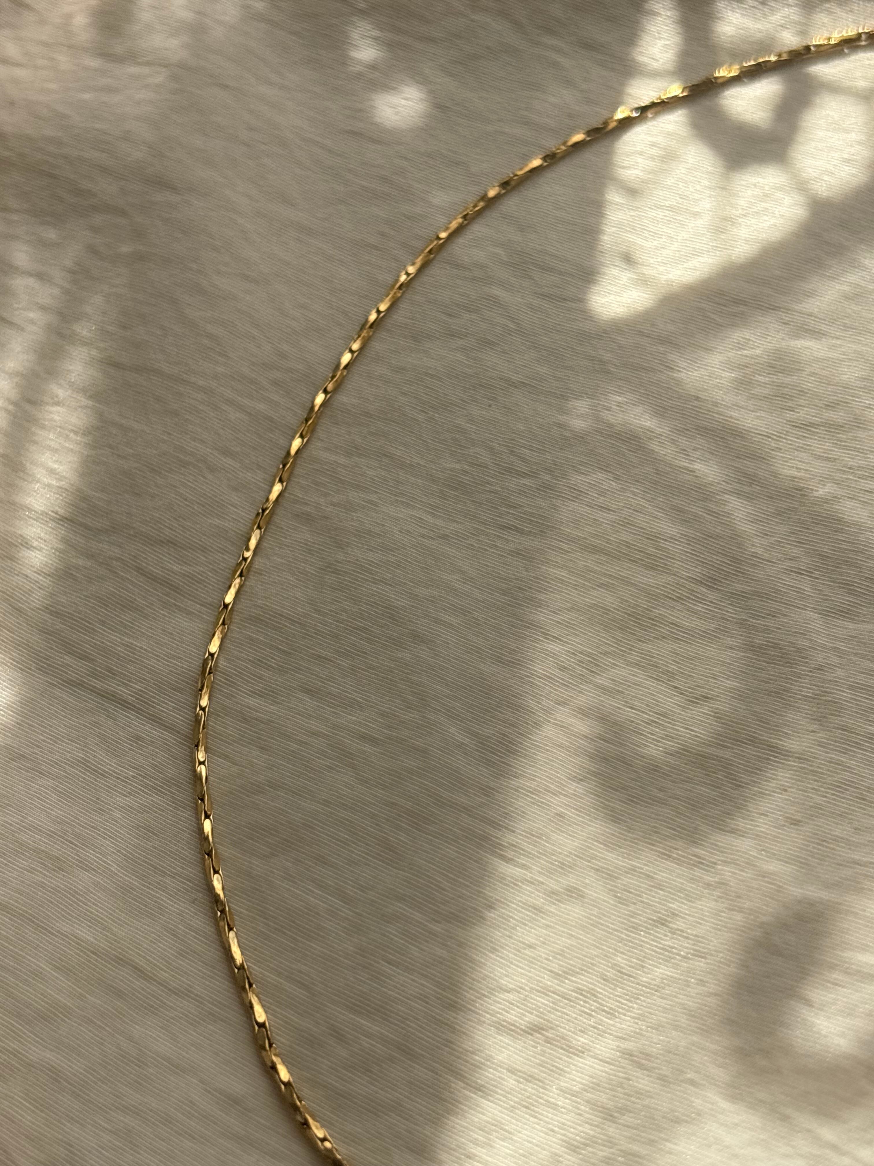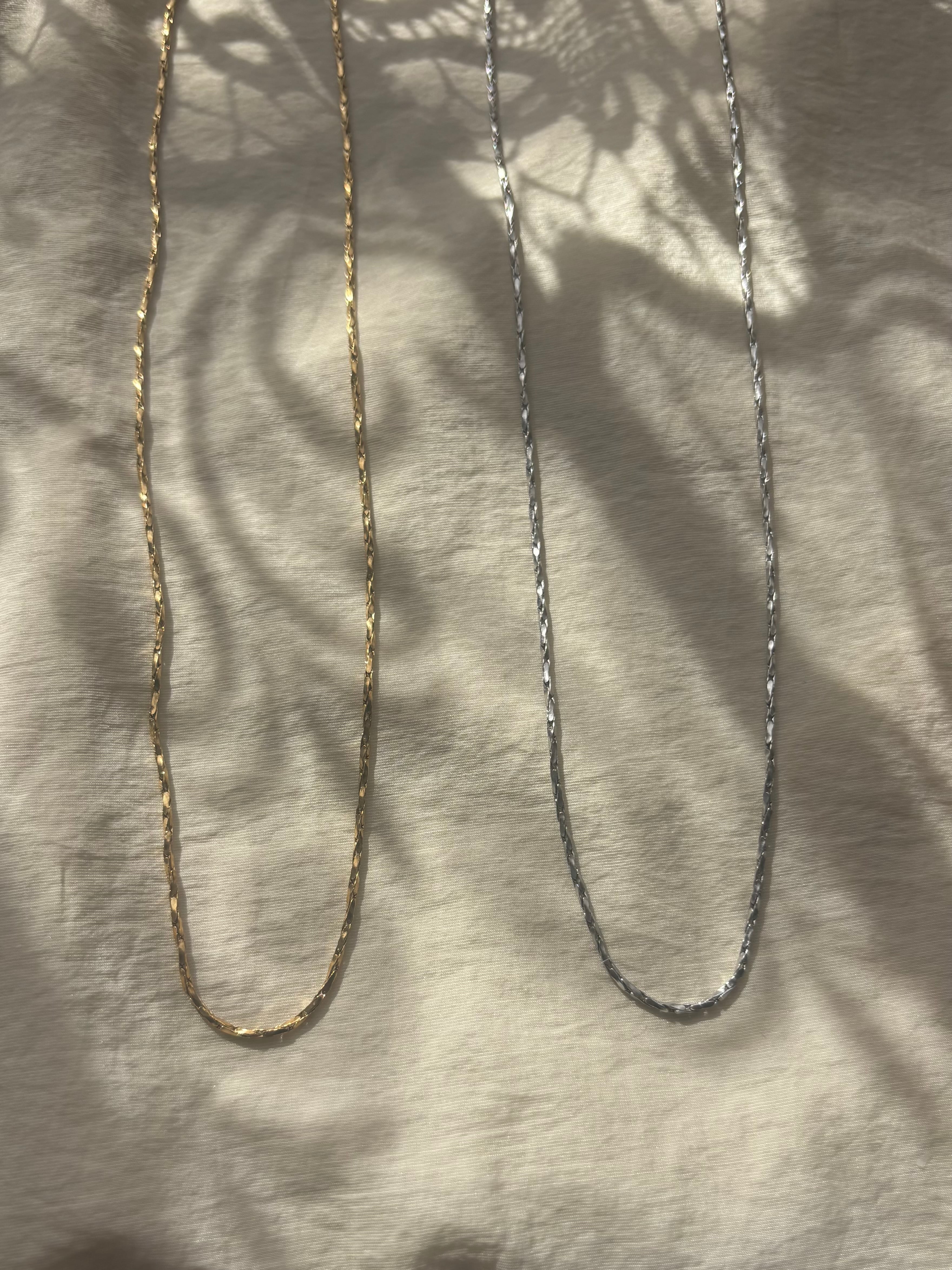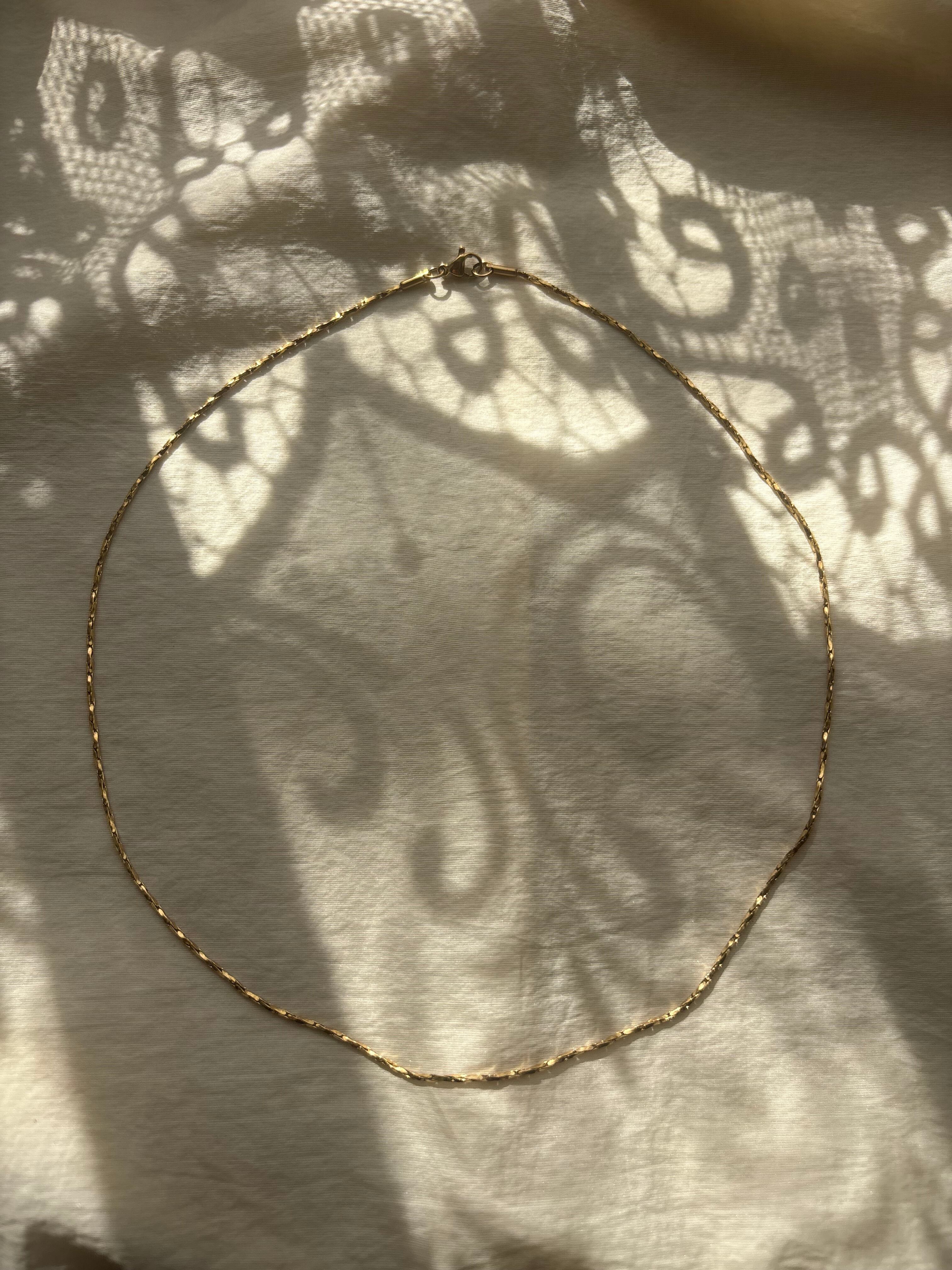 細かくカットが入ったチェーンが、動くたびに繊細な光を反射、シンプルなのに、首元が自然と華やぐ一本です。