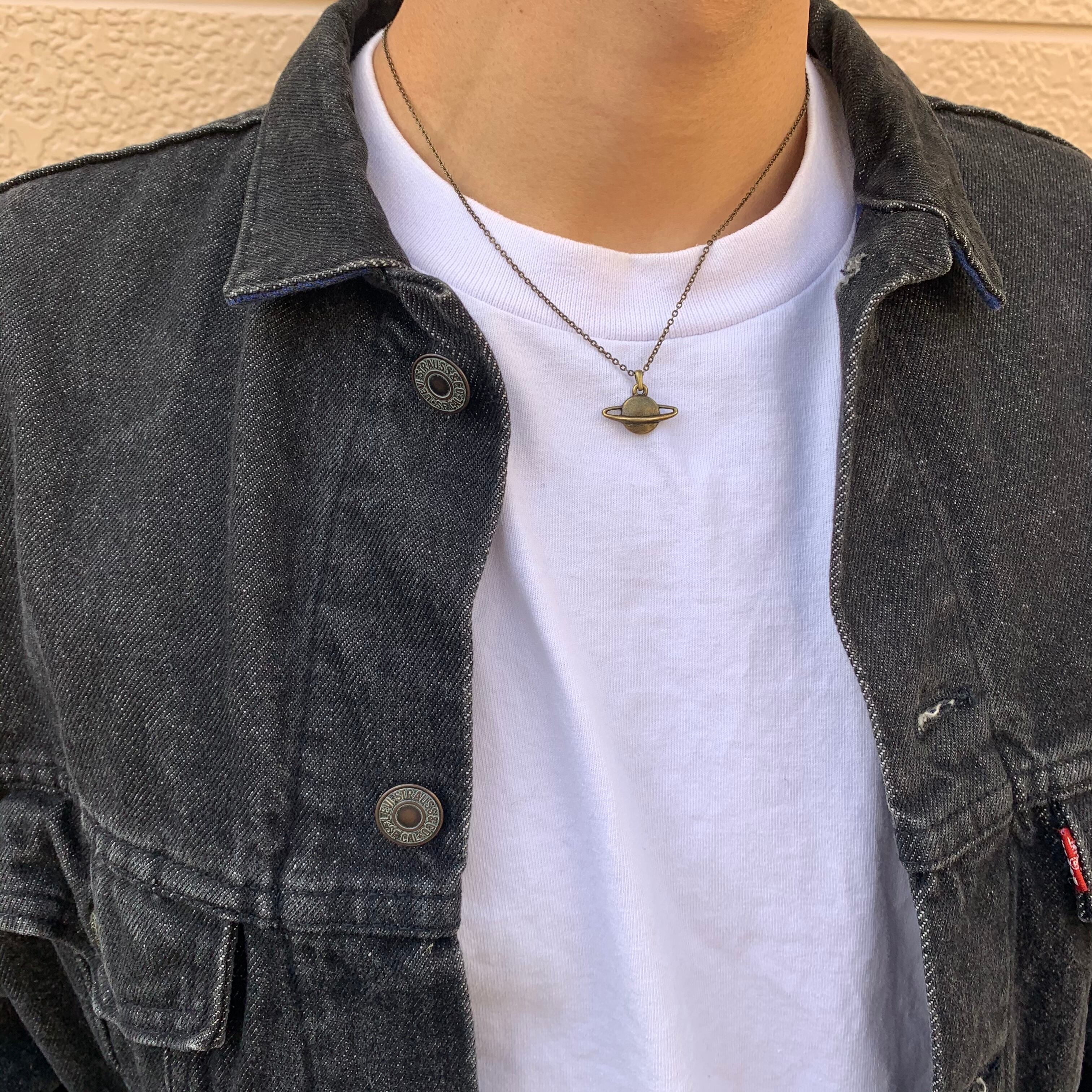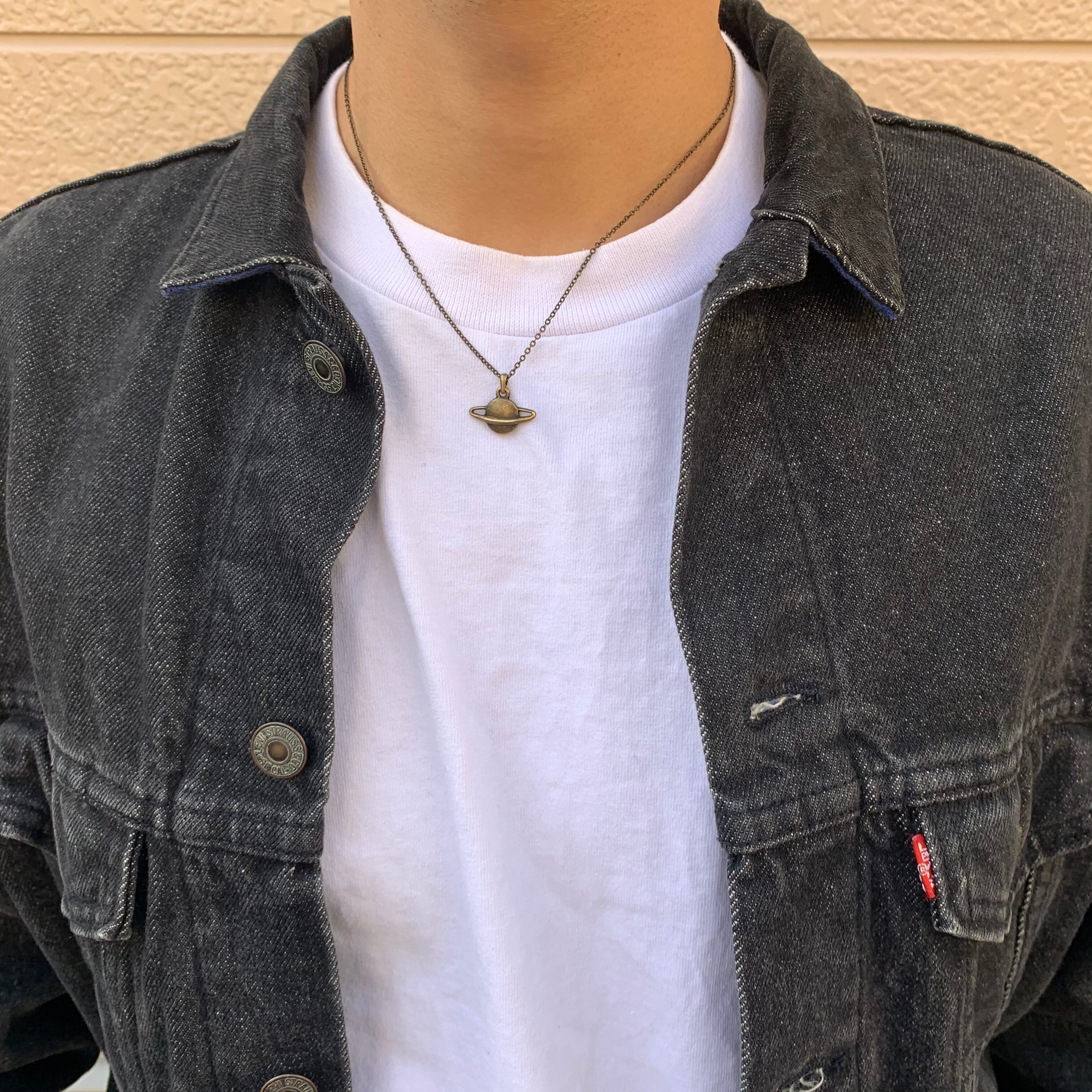 惑星のチャームのネックレス。個性的でありながら、落ち着いた金古美のカラーなので付け回しやすいです。スタイルのワンポイントに。