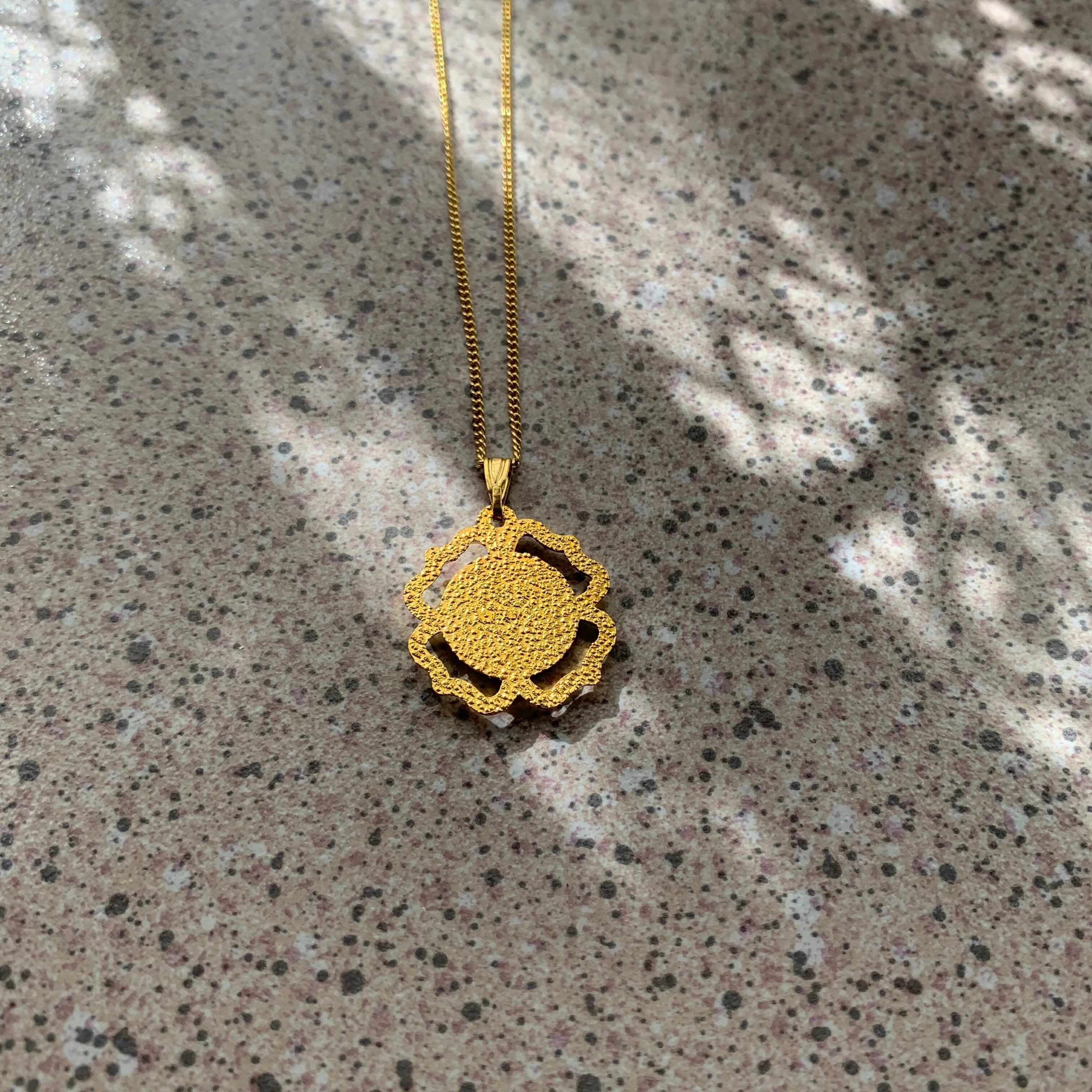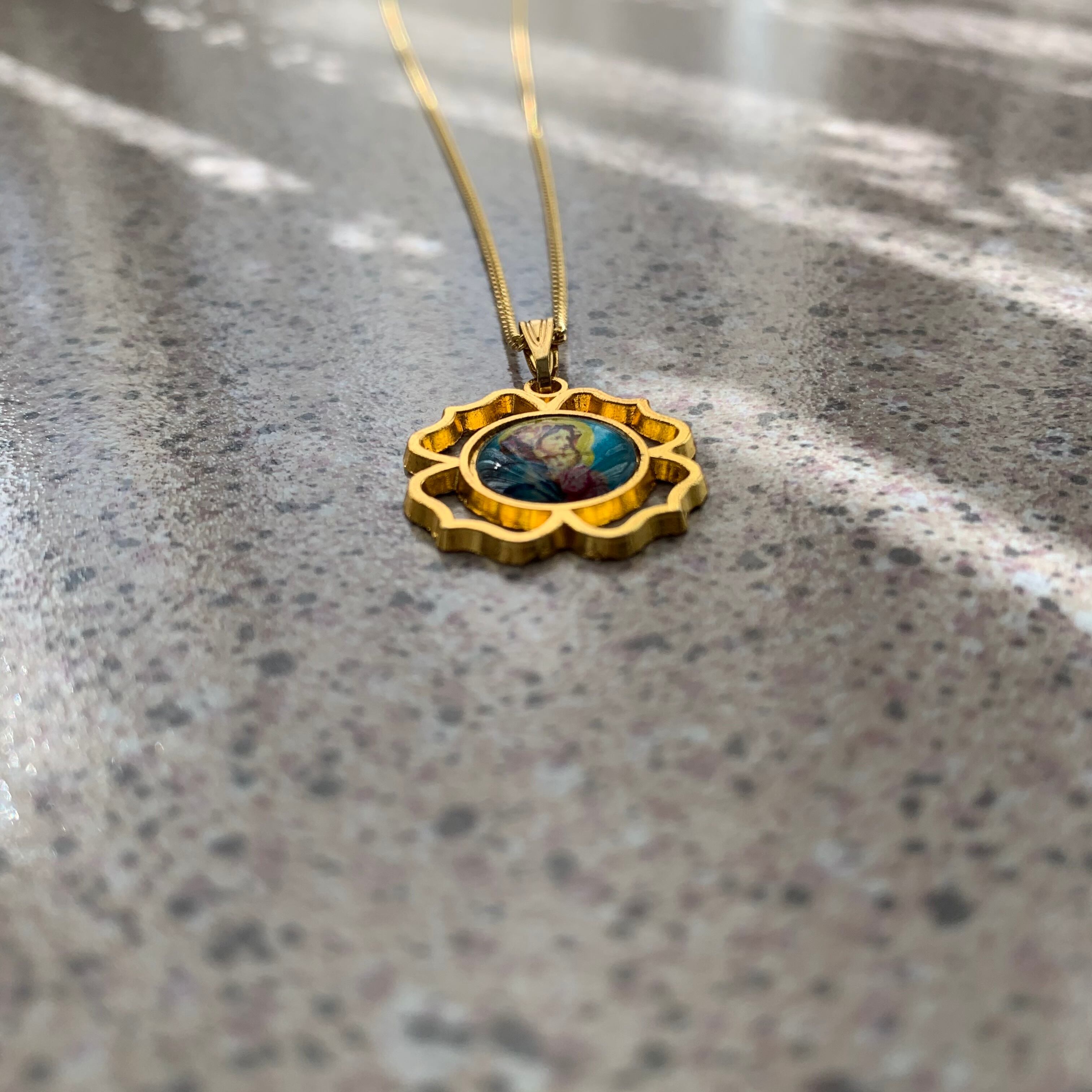 大きめの存在感があるメダイです。あえて春らしくカラフルなスタイルと合わせるのがオススメで、光が当たると、綺麗に発色します。