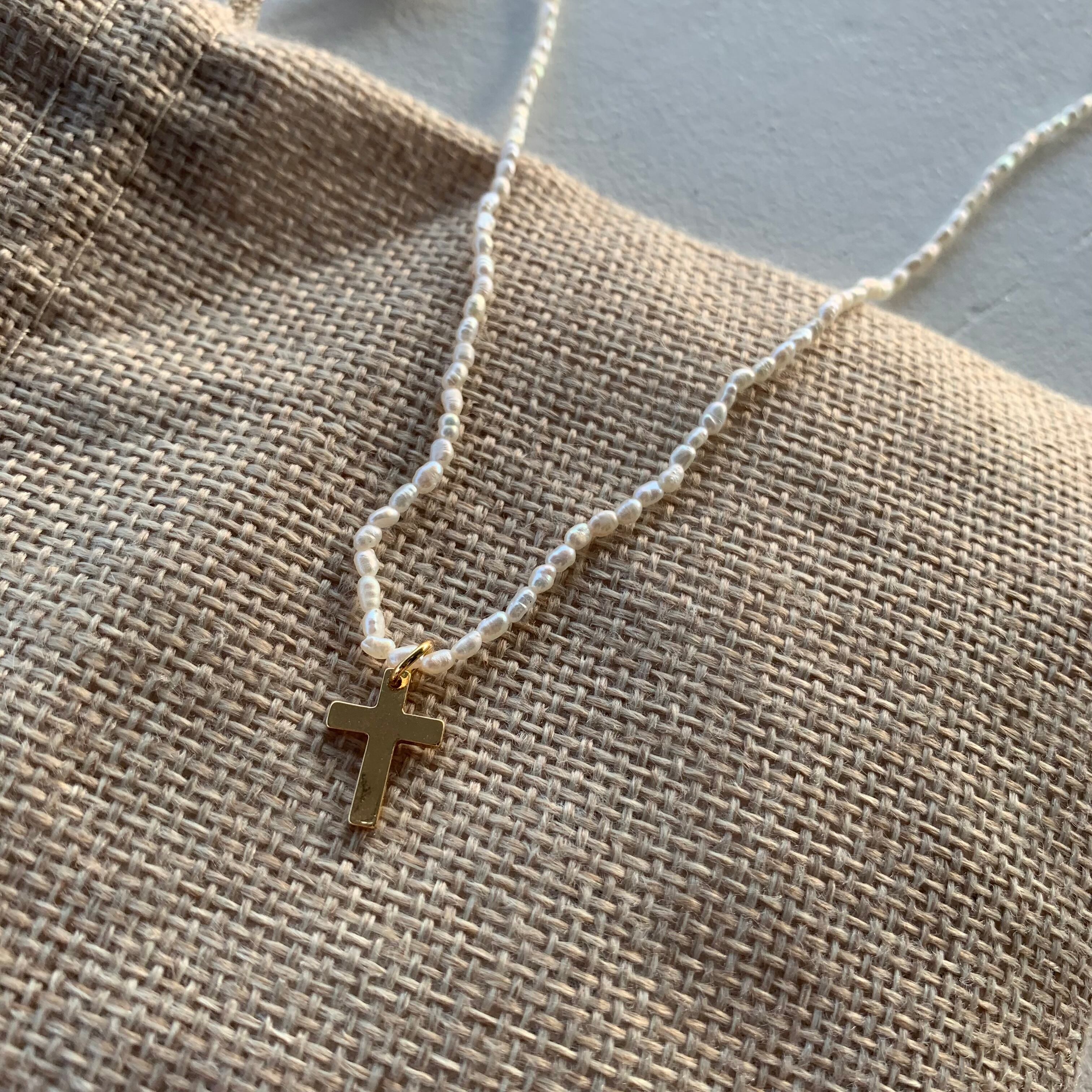 さりげないクロスチャームがポイント。シンプルなチェーンネックレスと、重ね付けもオススメ。
