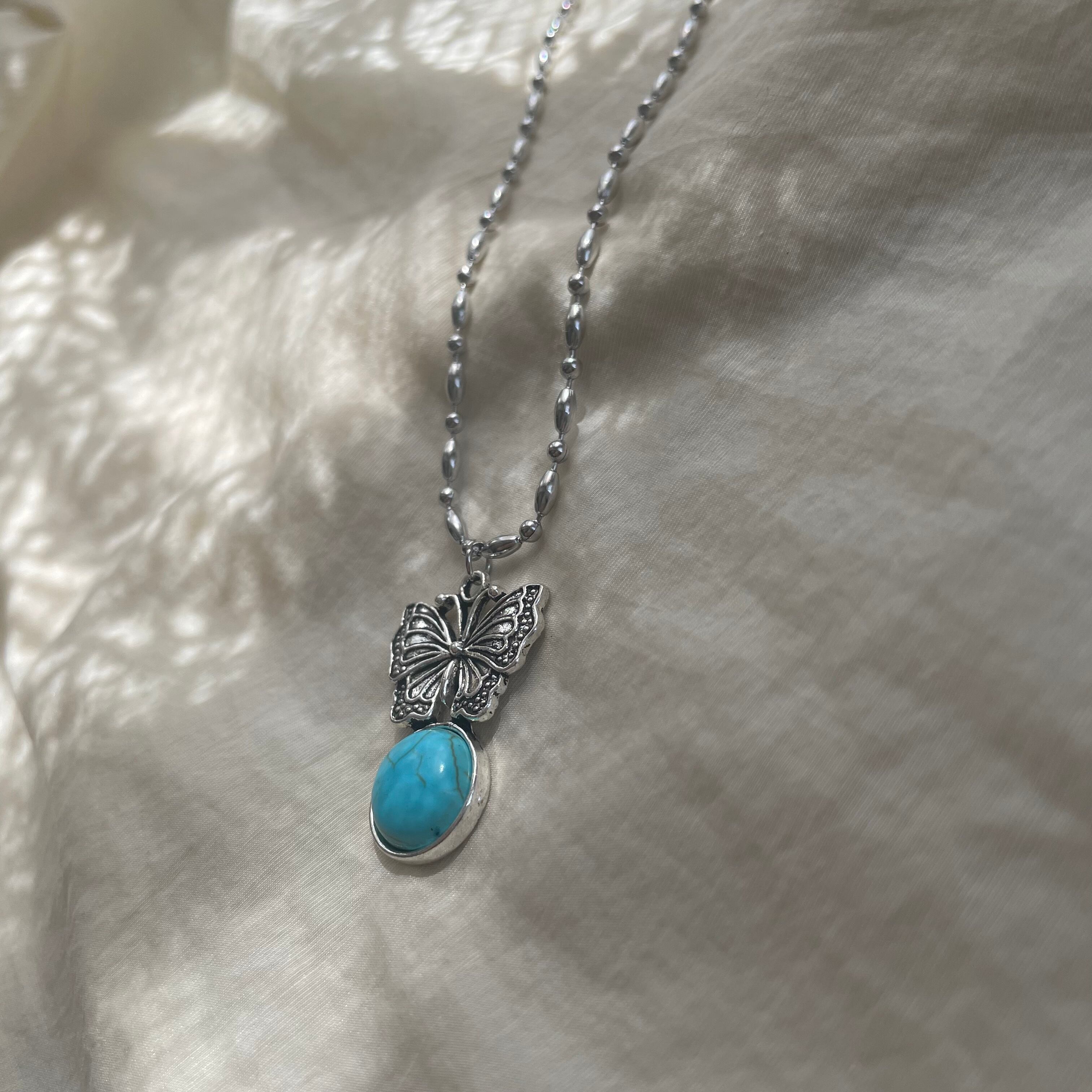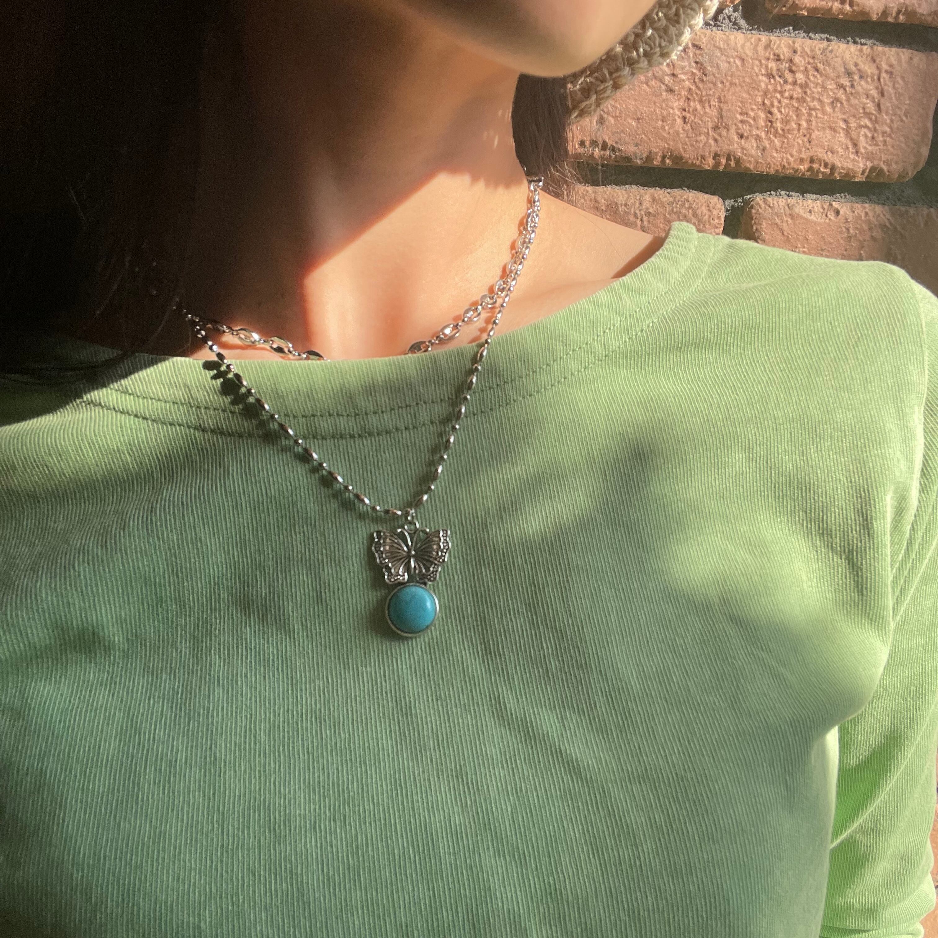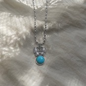 ターコイズブルーでポイント使いできるネックレスです。他と被らない個性的なチャームがポイント。