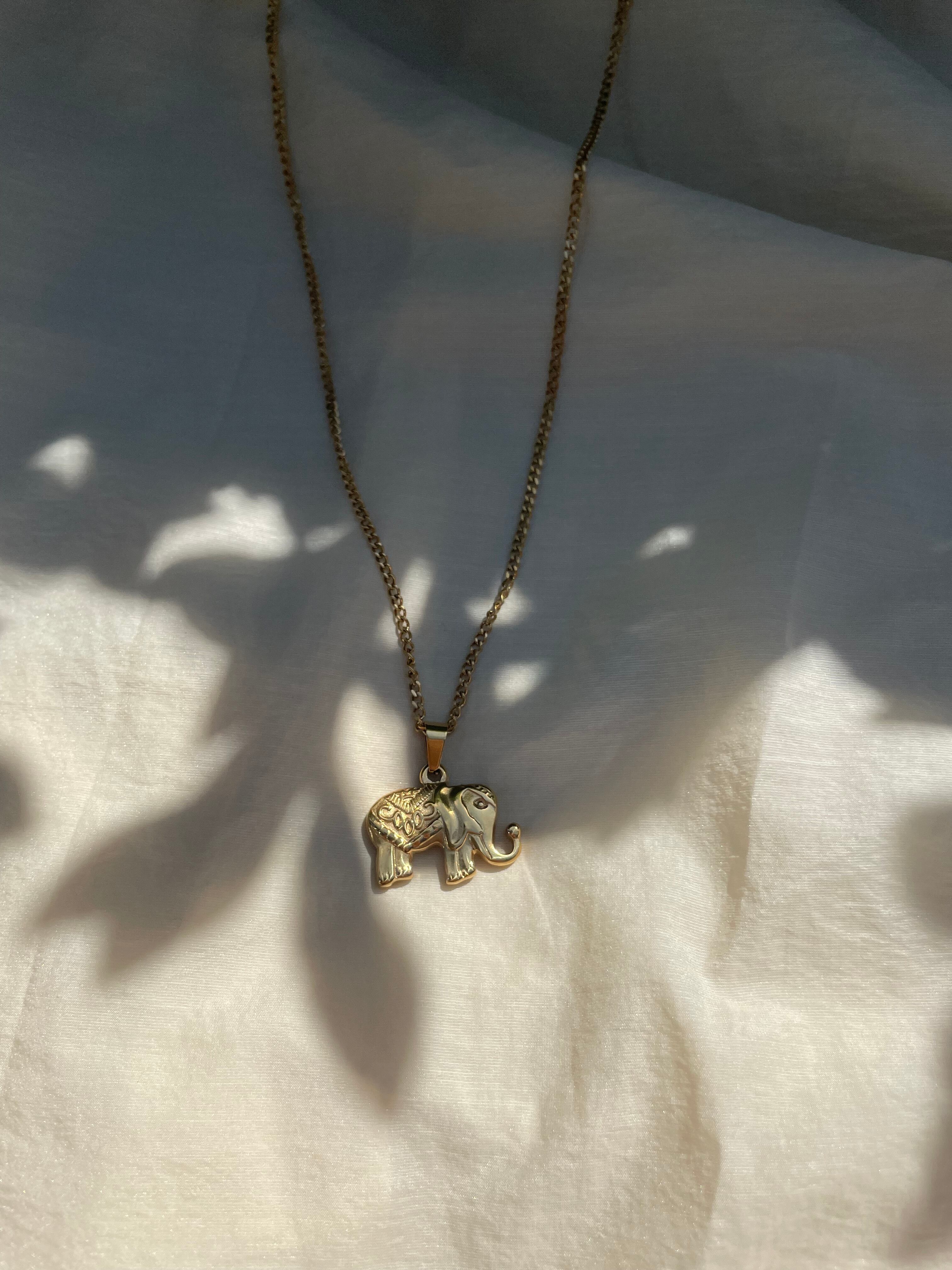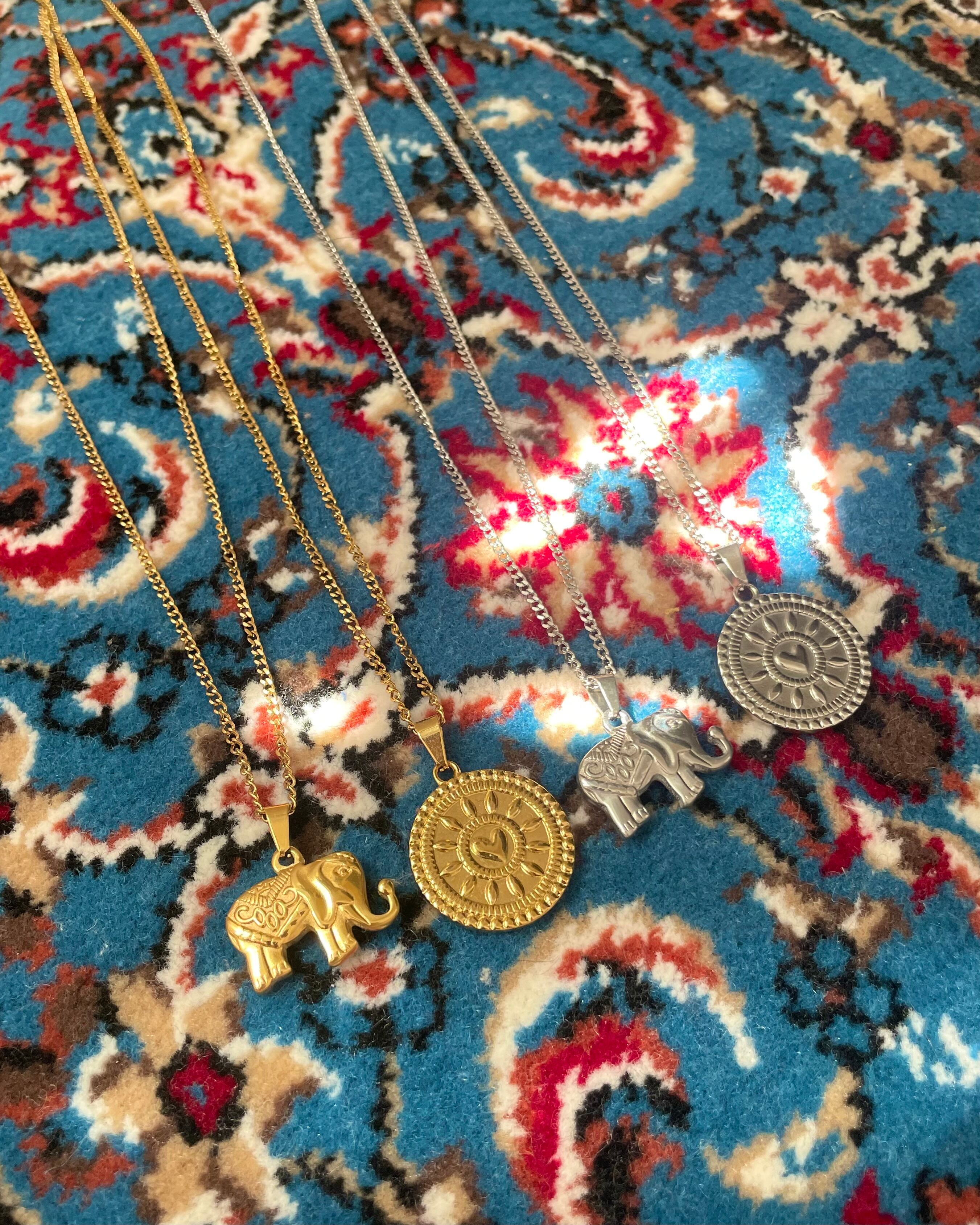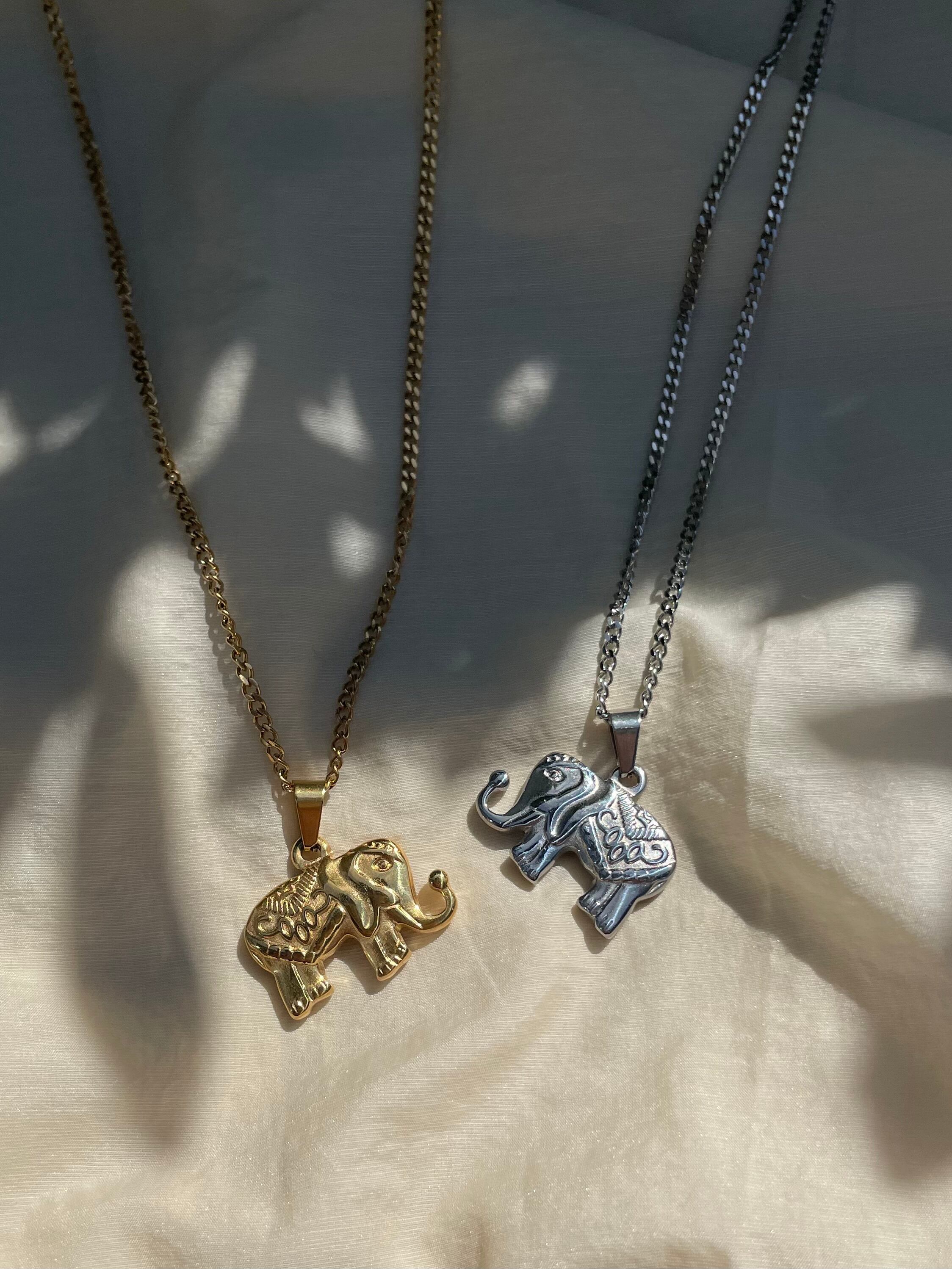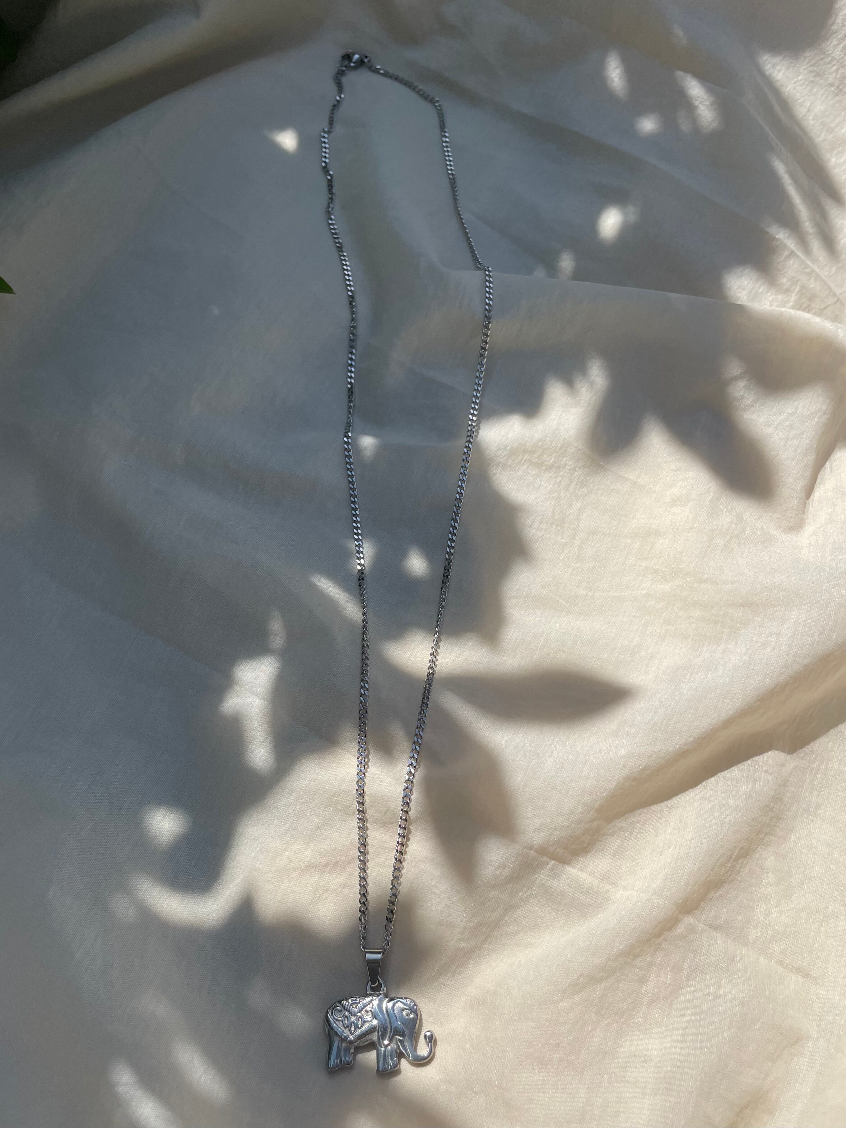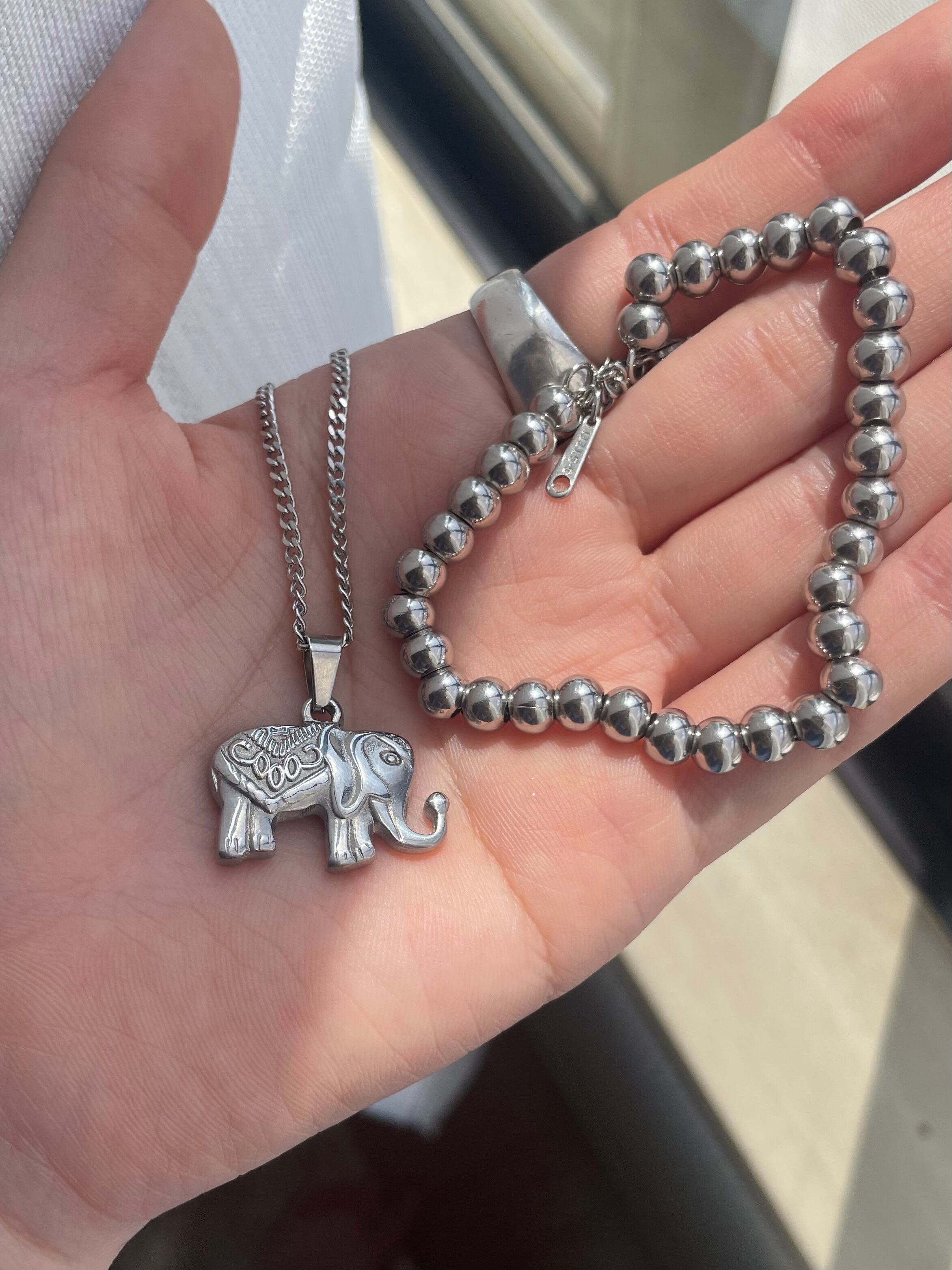 しっかり重みのある象チャームは民族柄デザインで、ポイント使いの出来るステンレスネックレスです。