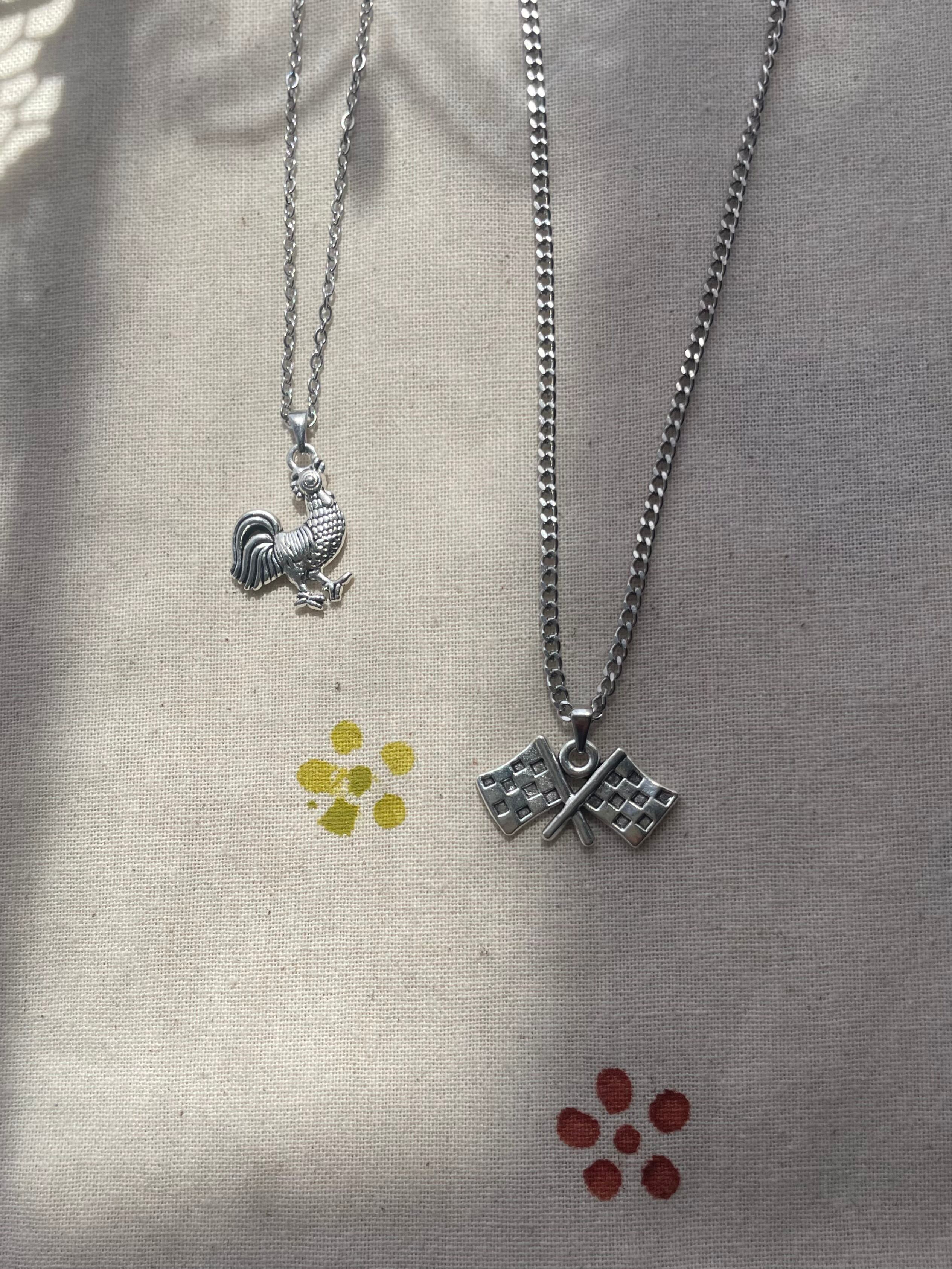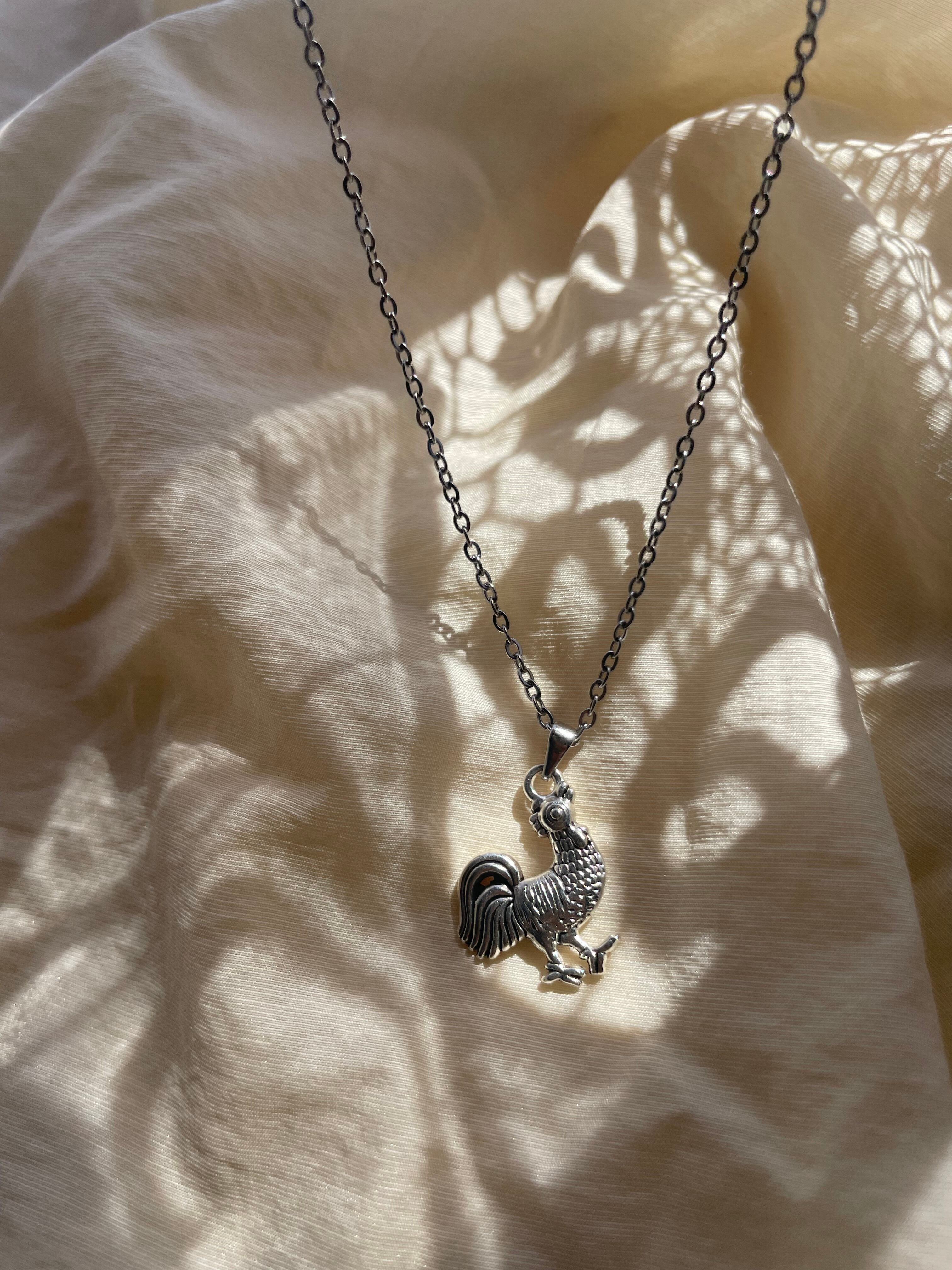 ユーモア溢れるニワトリチャームのネックレス。