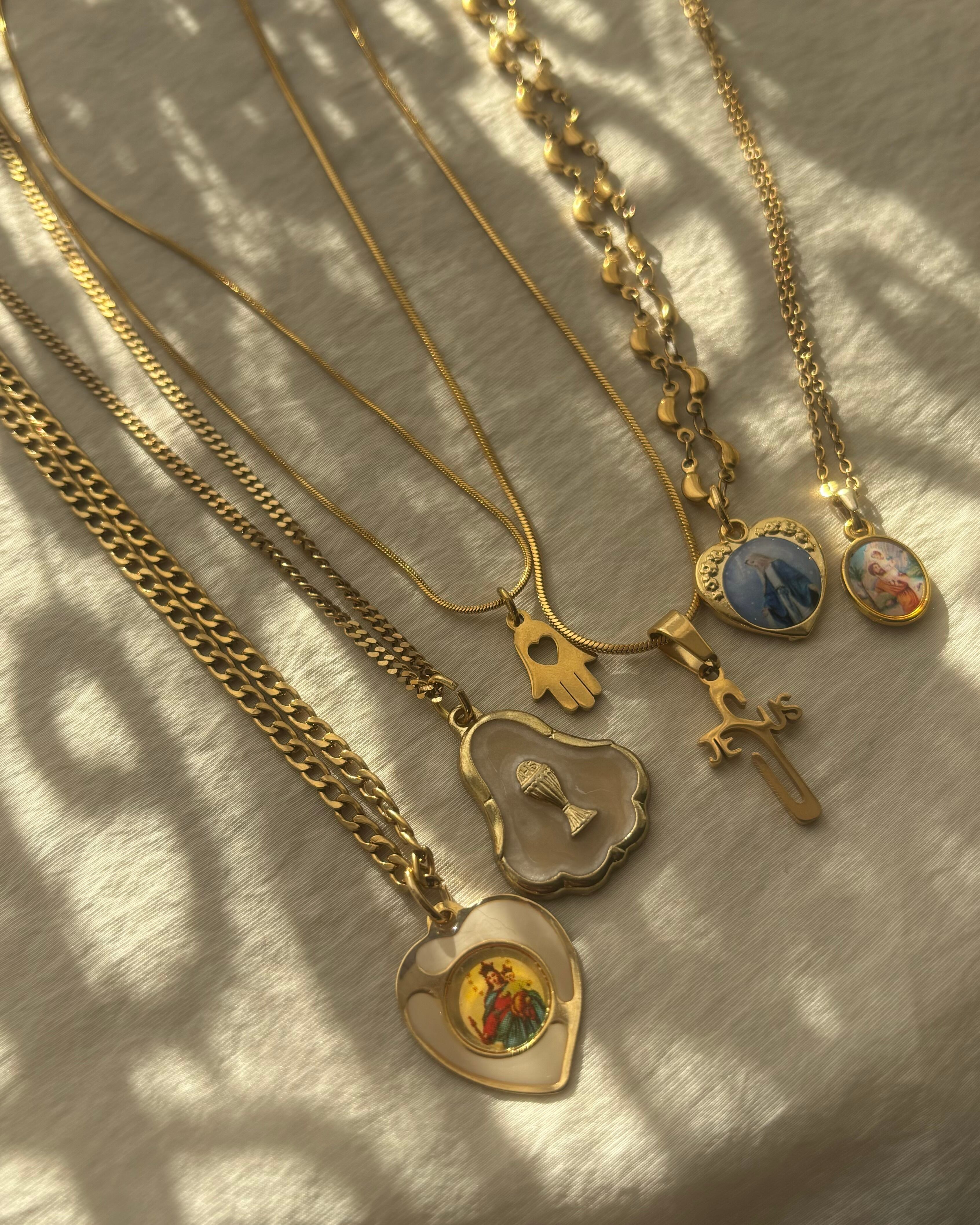暖色で柔らかい印象の小粒なメダイチャームがポイントネックレス。