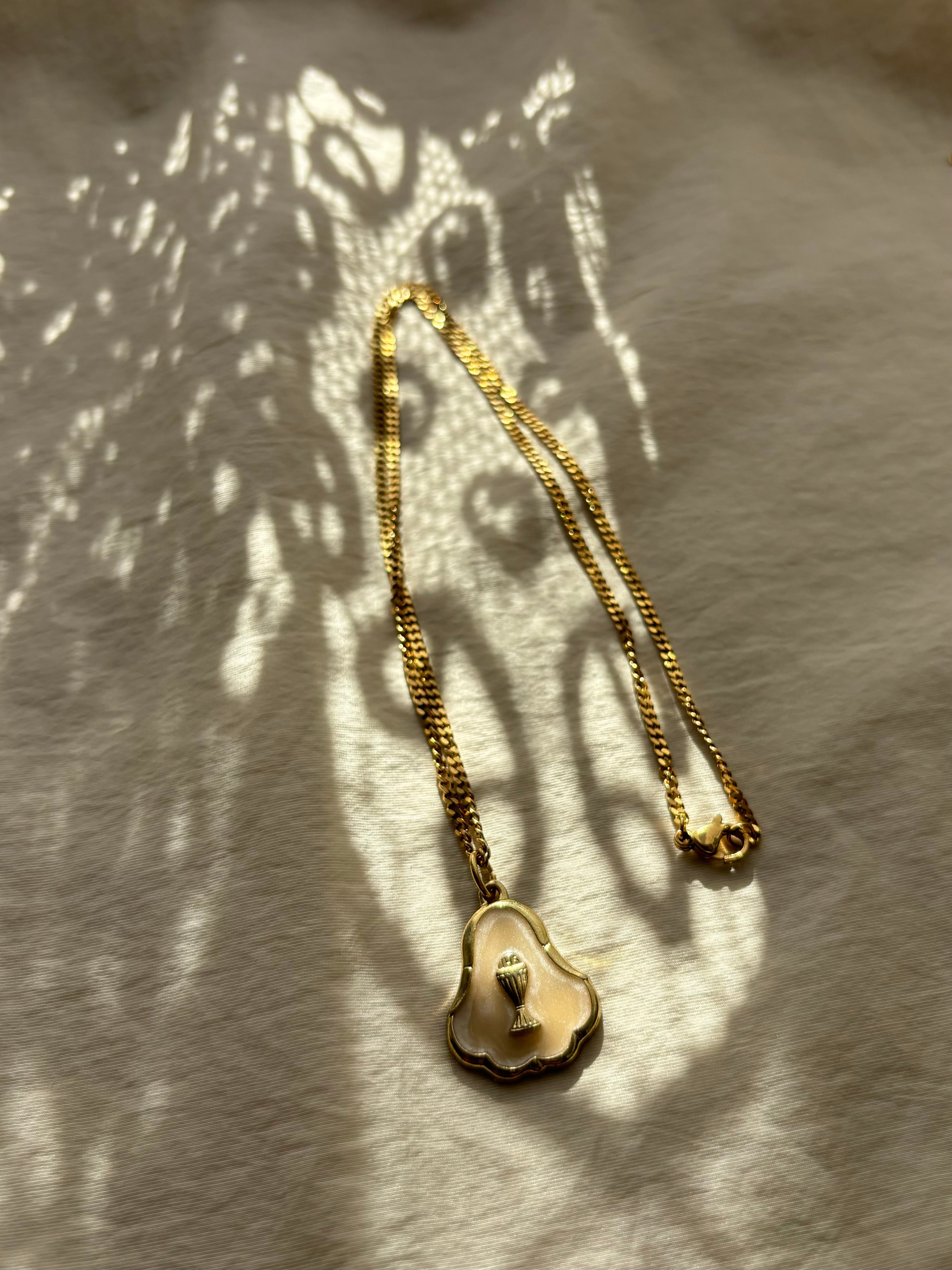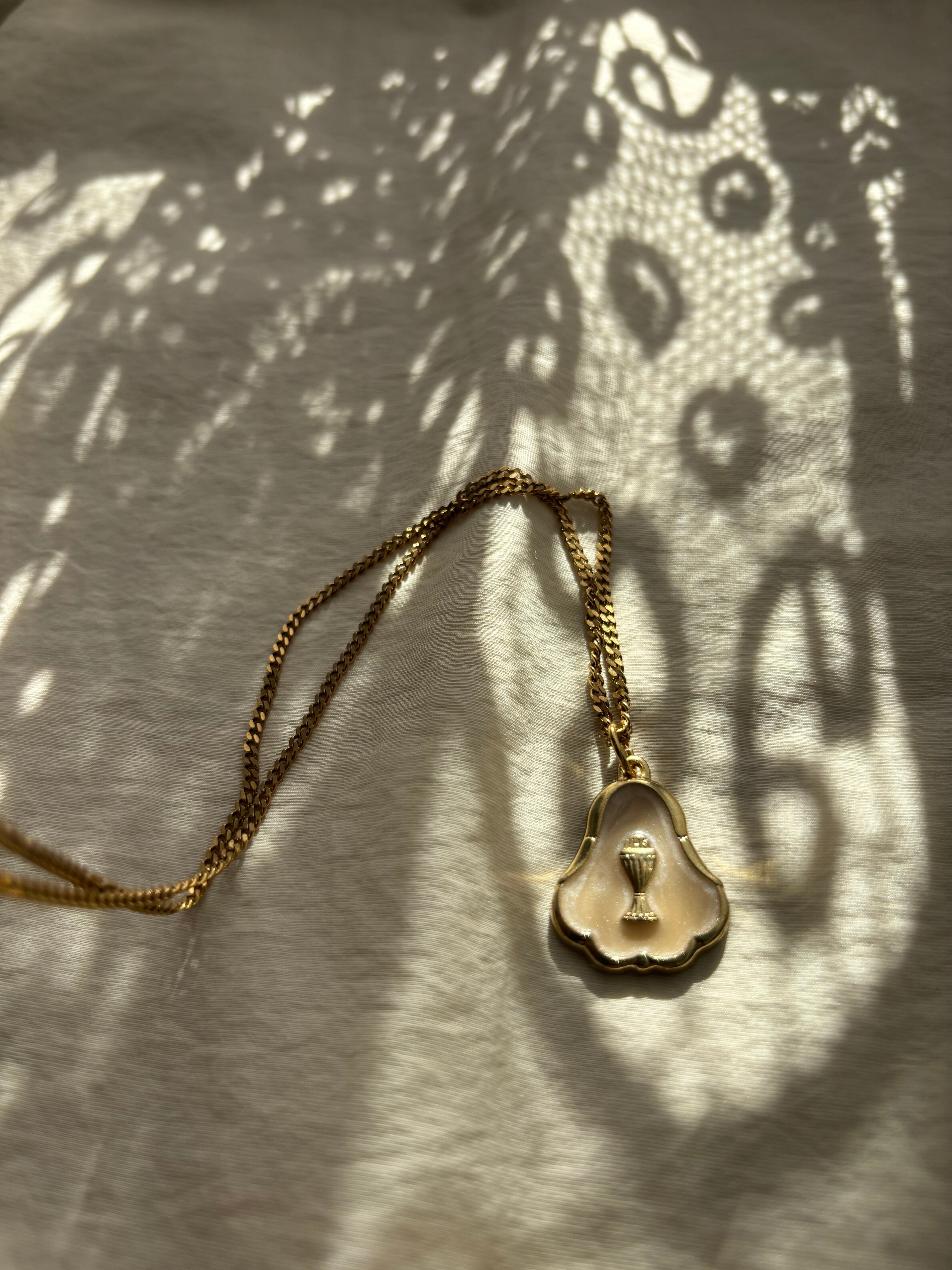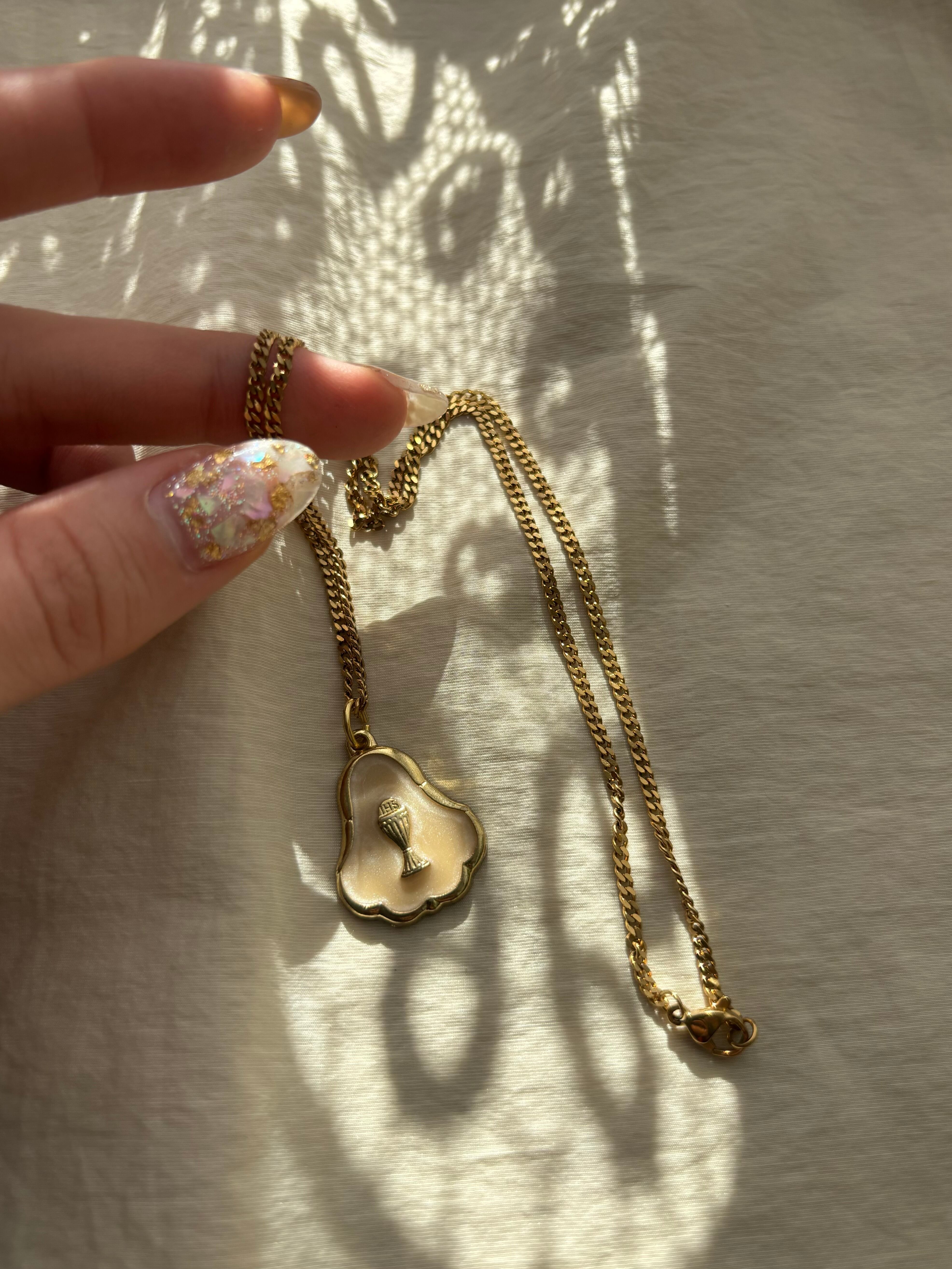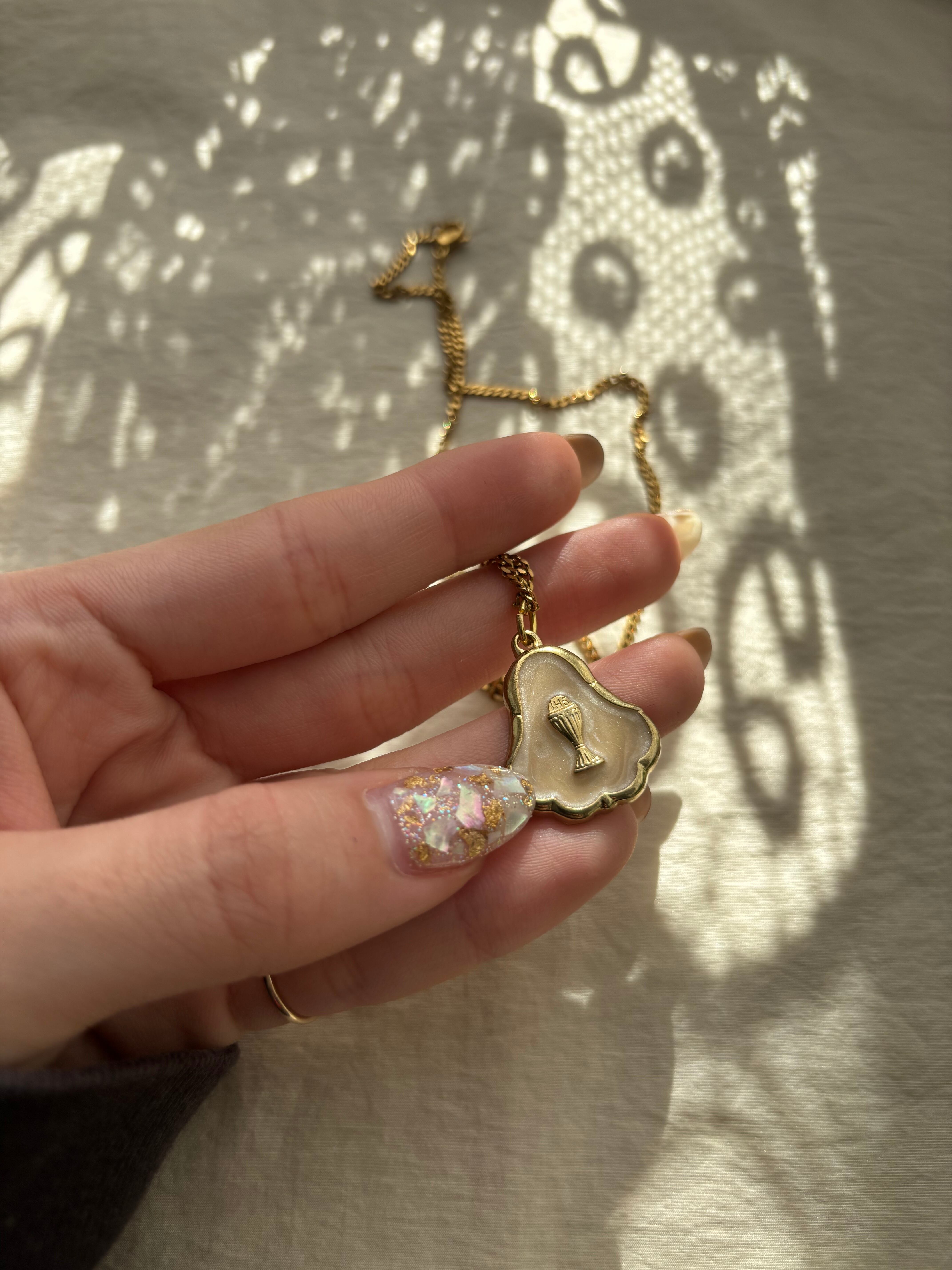 聖杯のデザインが入ったイタリア製メダイチャーム。ホワイトベースのポイントチャームがポイントです。