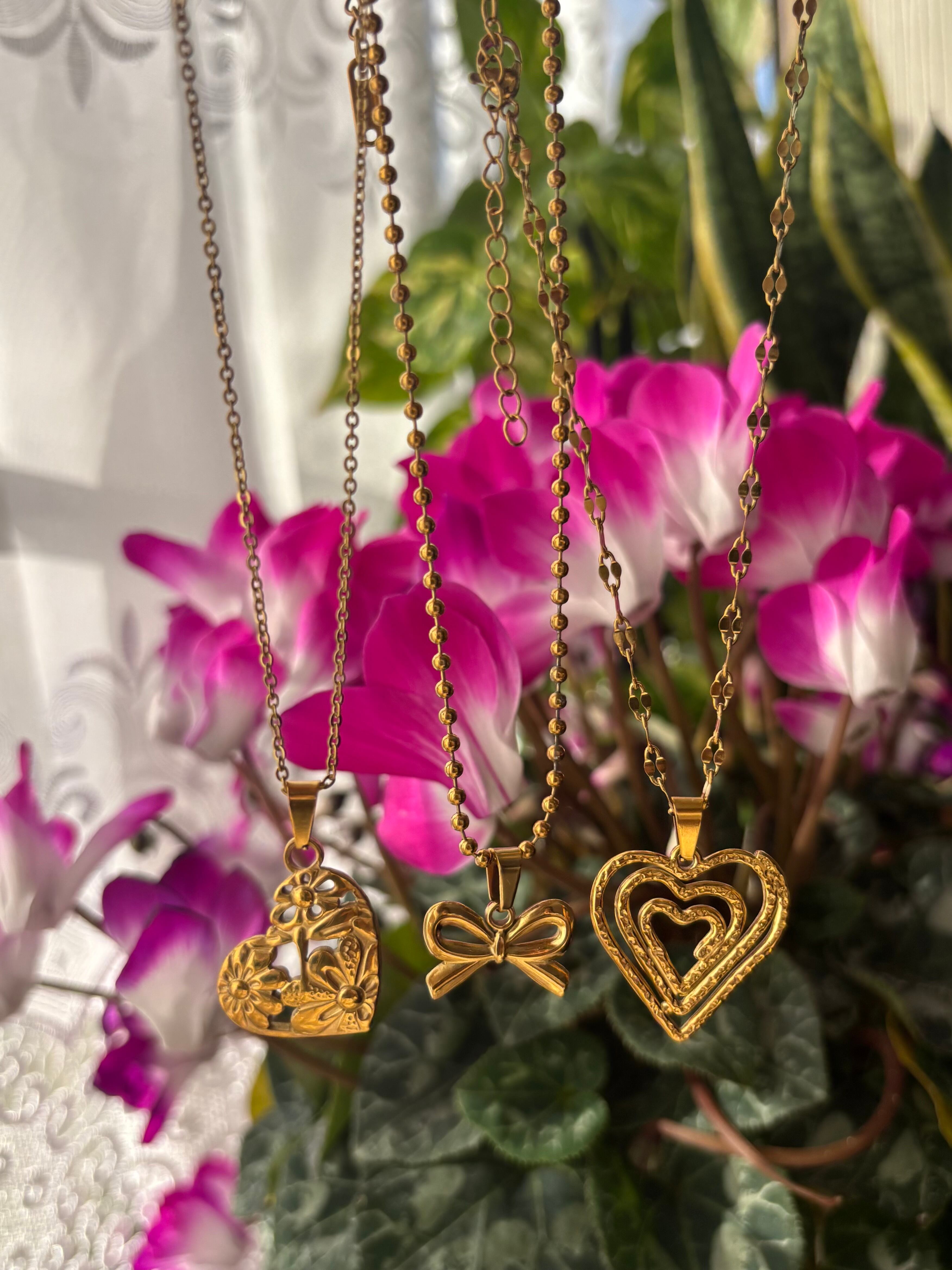 3連ハートネックレス。チャームの表面には凹凸があり光の加減で印象が変わります。
